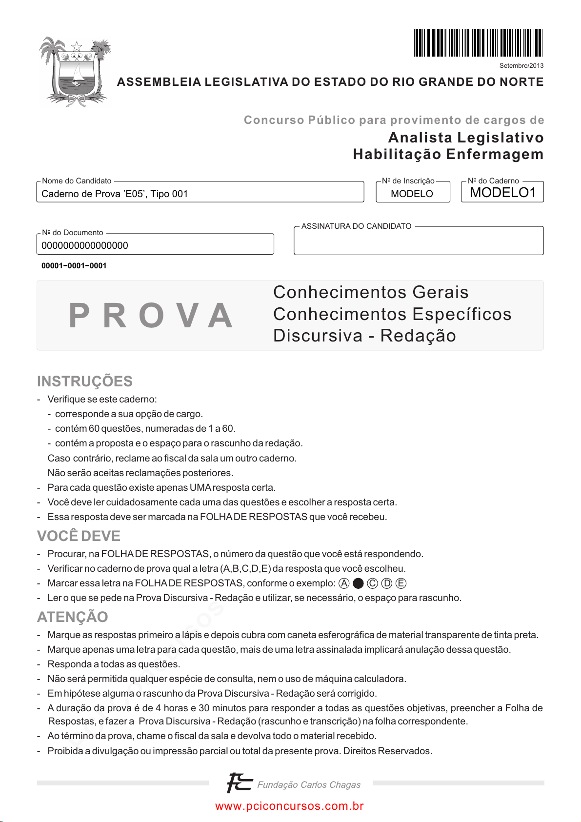 pcimarkpci MjgwNDowMjE0OjkwNjk6NGYyNTphNGFkOmVmZmY6ZmU1YjozNDQ3:U3VuLCAyMyBNYXIgMjAyNSAwMTo1MzoyMyAtMDMwMA== www.pciconcursos.com.br N do CadernooN de Inscriçãoo ASSINATURA DO CANDIDATO N do Documentoo Nome do Candidato P R O V A A C D E ASSEMBLEIA LEGISLATIVA DO ESTADO DO RIO GRANDE DO NORTE Analista Legislativo Habilitação Enfermagem Concurso Público para provimento de cargos de Conhecimentos Gerais Conhecimentos Específicos Discursiva - Redação INSTRUÇÕES VOCÊ DEVE ATENÇÃO - Verifique se este caderno: - corresponde a sua opção de cargo. - contém 60 questões, numeradas de 1 a 60. - contém a proposta e o espaço para o rascunho da redação. Caso contrário, reclame ao fiscal da sala um outro caderno. Não serão aceitas reclamações posteriores. - Para cada questão existe apenas UMAresposta certa. - Você deve ler cuidadosamente cada uma das questões e escolher a resposta certa. - Essa resposta deve ser marcada na FOLHADE RESPOSTAS que você recebeu. - Procurar, na FOLHADE RESPOSTAS, o número da questão que você está respondendo. - Verificar no caderno de prova qual a letra (A,B,C,D,E) da resposta que você escolheu. - Marcar essa letra na FOLHADE RESPOSTAS, conforme o exemplo: - Ler o que se pede na Prova Discursiva - Redação e utilizar, se necessário, o espaço para rascunho. - Marque as respostas primeiro a lápis e depois cubra com caneta esferográfica de material transparente de tinta preta. - Marque apenas uma letra para cada questão, mais de uma letra assinalada implicará anulação dessa questão. - Responda a todas as questões. - Não será permitida qualquer espécie de consulta, nem o uso de máquina calculadora. - Em hipótese alguma o rascunho da Prova Discursiva - Redação será corrigido. - A duração da prova é de 4 horas e 30 minutos para responder a todas as questões objetivas, preencher a Folha de Respostas, e fazer a Prova Discursiva - Redação (rascunho e transcrição) na folha correspondente. - Ao término da prova, chame o fiscal da sala e devolva todo o material recebido. - Proibida a divulgação ou impressão parcial ou total da presente prova. Direitos Reservados. Setembro/2013 Caderno de Prova ’E05’, Tipo 001 MODELO 0000000000000000 MODELO1 00001−0001−0001 www.pciconcursos.com.br pcimarkpci MjgwNDowMjE0OjkwNjk6NGYyNTphNGFkOmVmZmY6ZmU1YjozNDQ3:U3VuLCAyMyBNYXIgMjAyNSAwMTo1MzoyMyAtMDMwMA== www.pciconcursos.com.br 2 ALERN-Conhecimentos Gerais3 CONHECIMENTOS GERAIS Língua Portuguesa Atenção: O texto abaixo refere-se às questões de números 1 a 4. Código é poesia A expressão, usada como slogan pela plataforma Wordpress, é controversa. Comparar a nobre arte poética com a técnica da programação parece sacrilégio. Código é frio e calculado, precisa ser objetivo, não pode dar margem a interpretações. O que isso tem em comum com a artesania de palavras que compõe um verso? A relação entre as duas áreas tem origens medievais. Até o século 12 não se calculava com números na Europa. Para isso existiam os ábacos. Derivados do sistema romano, núme- ros eram apenas um tipo de letra usada para registrar quantias. Entre as muitas invenções estão a Álgebra e os Algorit- mos que, com equações algébricas, usam expressões para rea- lizar operações. Também sintéticas, essas frases em línguas estranhas (SQL, JavaScript, HTML) têm sintaxe, ortografia e métricas precisas. A semelhança entre código e poesia vai além de sintaxe e frases curtas. Ambas têm propósito, sentido e estrutura. Por motivos diferentes, precisam ser elegantes e concisas. Bom código, como boa poesia, não "acontece" natural- mente, nem pode ser gerado a partir de dicionários de rimas. Demanda disciplina, talento e trabalho duro. Algoritmos bem desenvolvidos, como poesias bem escritas, seguem fluxos naturais de ideias. Tudo neles parece estar no lugar correto, nada pode ser removido, cada linha emenda naturalmente na próxima. O fluxo de operações não é determinado pela estrutura gramatical, mas pela forma com que cada ideia se conecta à seguinte, complementando a anterior. Linhas de código, como versos, fazem referências cruzadas, em que cada parte ampli- fica e sintetiza o que a antecedeu. Muitos preguiçosos autointitulados poetas apenas por serem capazes de rimar as palavras no fim de duas linhas se espantam porque ninguém suporta lê-los ou ouvi-los. Dode- cassílabos, alexandrinos, heroicos ou redondilhas, poemas pre- cisam de estrutura. Como eles, os novos programas compu- tacionais e sonetos algorítmicos demandam estruturas e méto- dos para serem devidamente apreciados. Programar websites e aplicativos é complexo, mas não é impossível, nem restrito a mentes brilhantes e especiais. Da mesma forma que todos podem escrever, todos podem progra- mar. Com engenho e arte, novos talentos podem fazer o que Chico, Caetano e Gil fizeram com os versos da nossa música. Mas só se poderá cultivá-los quando o preconceito que se tem com relação aos desenvolvedores for substituído pela admiração que temos por quem garimpa a beleza oculta na última flor do Lácio. (Adaptado do texto de Luli Radfahrer, Folha de S. Paulo, Folha Tec, 29/07/2013) 1. De acordo com o texto: (A) não se deve comparar poesia e programação, por- que é uma presunção, embora ambas tenham muito em comum: dependem de conhecimentos e esforços para atingir um bom resultado. (B) é necessário que código e poesia, embora necessi- tando de conhecimentos e esforços por parte do programador e do poeta, se construam com a sim- plicidade das coisas naturais. (C) há uma estrutura gramatical, uma sintaxe que ultra- passa o uso de rimas e de receitas, que amplifica e sintetiza códigos e formas que devem ser seguidas para se atingir os objetivos. (D) devem-se considerar as peculiaridades de cada uma das atividades, mas ambas têm em comum a difi- culdade de um bom desenvolvimento de suas estru- turas, de sua sintaxe. (E) é necessário que