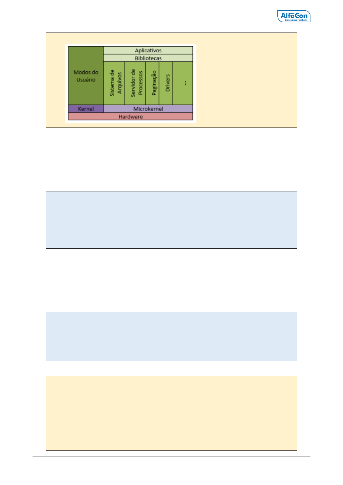 alfaconcursos.com.br MUDE SUA VIDA! 7 A imagem mostra o microkernel. 2 – ANO: 2011 Banca: CESPE Órgão: PC – ES PROVA: Escrivão O sistema operacional do computador estará em funcionamento mesmo quando se estiver editando uma planilha eletrônica. ( ) Certo ( ) Errado SOLUÇÃO RÁPIDA Gabarito: Certo O sistema Operacional é o programa que controla o funcionamento do computador, ele está em execução o tempo todo afinal é ele quem gerencia os recursos. Os aplicativos como um editor de planilhas eletrônicas tem acesso aos recursos do computador através do Sistema Operacional. 3 – ANO: 2013 Banca: CESPE Órgão: CNJ PROVA: Programador Um sistema operacional é composto por diversos programas responsáveis por funções distintas e específicas. A parte mais importante do sistema operacional é o kernel, que entra em contato direto com a CPU e demais componentes de hardware. ( ) Certo ( ) Errado SOLUÇÃO RÁPIDA Gabarito: Certo Kernel é o núcleo do Sistema Operacional, ele é o responsável pelo gerenciamento dos recursos de Hardware, ou seja é ele quem interage diretamente com a máquina. SOLUÇÃO COMPLETA O núcleo do sistema Operacional é um software responsável por controlar as interações entre o hardware e outros programas da máquina. O kernel traduz as informações que recebe ao processador e aos demais elementos eletrônicos do computador. Tanto o Linux quanto o Windows possuem um Kernel. Apesar de ser a parte mais importante do sistema, já que ele fornece a interface para os programas conectarem-se com os recursos do sistema de um nível mais elevado, isoladamente, o kernel não é de grande utilidade para o usuário final. https://www.alfaconcursos.com.br/