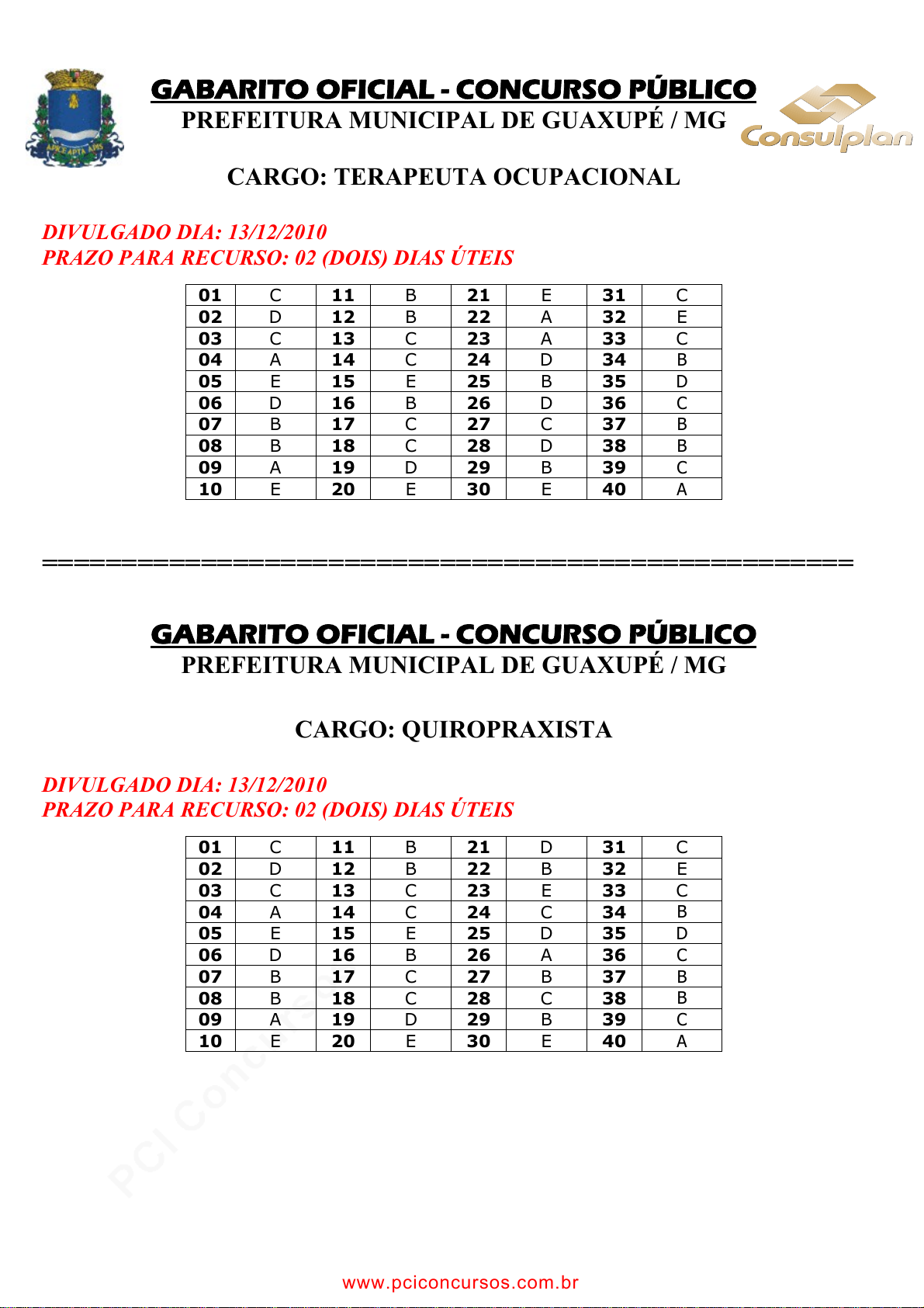 pcimarkpci MDAwMDowMDAwOjAwMDA6MDAwMDowMDAwOmZmZmY6YmI1ZjoyODQ3:V2VkLCAxOSBKdWwgMjAyMyAxMjo0MzowNiAtMDMwMA== www.pciconcursos.com.br GABARITO OFICIAL - CONCURSO PÚBLICO PREFEITURA MUNICIPAL DE GUAXUPÉ / MG CARGO: TERAPEUTA OCUPACIONAL DIVULGADO DIA: 13/12/2010 PRAZO PARA RECURSO: 02 (DOIS) DIAS ÚTEIS 01 C 11 B 21 E 31 C 02 D 12 B 22 A 32 E 03 C 13 C 23 A 33 C 04 A 14 C 24 D 34 B 05 E 15 E 25 B 35 D 06 D 16 B 26 D 36 C 07 B 17 C 27 C 37 B 08 B 18 C 28 D 38 B 09 A 19 D 29 B 39 C 10 E 20 E 30 E 40 A =================================================== GABARITO OFICIAL - CONCURSO PÚBLICO PREFEITURA MUNICIPAL DE GUAXUPÉ / MG CARGO: QUIROPRAXISTA DIVULGADO DIA: 13/12/2010 PRAZO PARA RECURSO: 02 (DOIS) DIAS ÚTEIS 01 C 11 B 21 D 31 C 02 D 12 B 22 B 32 E 03 C 13 C 23 E 33 C 04 A 14 C 24 C 34 B 05 E 15 E 25 D 35 D 06 D 16 B 26 A 36 C 07 B 17 C 27 B 37 B 08 B 18 C 28 C 38 B 09 A 19 D 29 B 39 C 10 E 20 E 30 E 40 A www.pciconcursos.com.br pcimarkpci MDAwMDowMDAwOjAwMDA6MDAwMDowMDAwOmZmZmY6YmI1ZjoyODQ3:V2VkLCAxOSBKdWwgMjAyMyAxMjo0MzowNiAtMDMwMA== www.pciconcursos.com.br GABARITO OFICIAL - CONCURSO PÚBLICO PREFEITURA MUNICIPAL DE GUAXUPÉ / MG CARGO: PSICÓLOGO DIVULGADO DIA: 13/12/2010 PRAZO PARA RECURSO: 02 (DOIS) DIAS ÚTEIS 01 C 11 B 21 D 31 C 02 D 12 B 22 C 32 E 03 C 13 C 23 E 33 C 04 A 14 C 24 C 34 B 05 E 15 E 25 C 35 D 06 D 16 B 26 B 36 C 07 B 17 C 27 A 37 B 08 B 18 C 28 E 38 B 09 A 19 D 29 B 39 C 10 E 20 E 30 E 40 A =================================================== GABARITO OFICIAL - CONCURSO PÚBLICO PREFEITURA MUNICIPAL DE GUAXUPÉ / MG CARGO: NUTRICIONISTA DIVULGADO DIA: 13/12/2010 PRAZO PARA RECURSO: 02 (DOIS) DIAS ÚTEIS 01 C 11 B 21 A 31 C 02 D 12 B 22 B 32 E 03 C 13 C 23 C 33 C 04 A 14 C 24 B 34 B 05 E 15 E 25 A 35 D 06 D 16 B 26 D 36 C 07 B 17 C 27 C 37 B 08 B 18 C 28 D 38 B 09 A 19 D 29 B 39 C 10 E 20 E 30 E 40 A www.pciconcursos.com.br pcimarkpci MDAwMDowMDAwOjAwMDA6MDAwMDowMDAwOmZmZmY6YmI1ZjoyODQ3:V2VkLCAxOSBKdWwgMjAyMyAxMjo0MzowNiAtMDMwMA== www.pciconcursos.com.br GABARITO OFICIAL - CONCURSO PÚBLICO PREFEITURA MUNICIPAL DE GUAXUPÉ / MG CARGO: FARMACÊUTICO – BIOQUÍMICO DIVULGADO DIA: 13/12/2010 PRAZO PARA RECURSO: 02 (DOIS) DIAS ÚTEIS 01 C 11 B 21 A 31 C 02 D 12 B 22 E 32 E 03 C 13 C 23 D 33 C 04 A 14 C 24 C 34 B 05 E 15 E 25 B 35 D 06 D 16 B 26 A 36 C 07 B 17 C 27 E 37 B 08 B 18 C 28 D 38 B 09 A 19 D 29 B 39 C 10 E 20 E 30 E 40 A =================================================== GABARITO OFICIAL - CONCURSO PÚBLICO PREFEITURA MUNICIPAL DE GUAXUPÉ / MG CARGO: ENFERMEIRO DIVULGADO DIA: 13/12/2010 PRAZO PARA RECURSO: 02 (DOIS) DIAS ÚTEIS 01 C 11 B 21 E 31 C 02 D 12 B 22 B 32 E 03 C 13 C 23 C 33 C 04 A 14 C 24 E 34 B 05 E 15 E 25 B 35 D 06 D 16 B 26 B 36 C 07 B 17 C 27 B 37 B 08 B 18 C 28 D 38 B 09 A 19 D 29 B 39 C 10 E 20 E 30 E 40 A www.pciconcursos.com.br pcimarkpci MDAwMDowMDAwOjAwMDA6MDAwMDowMDAwOmZmZmY6YmI1ZjoyODQ3:V2VkLCAxOSBKdWwgMjAyMyAxMjo0MzowNiAtMDMwMA== www.pciconcursos.com.br GABARITO OFICIAL - CONCURSO PÚBLICO PREFEITURA MUNICIPAL DE GUAXUPÉ / MG CARGO: DENTISTA DIVULGADO DIA: 13/12/2010 PRAZO PARA RECURSO: 02 (DOIS) DIAS ÚTEIS 01 C 11 B 21 A 31 C 02 D 12 B 22 B 32 E 03 C 13 C 23 D 33 C 04 A 14 C 24 E 34 B 05 E 15 E 25 B 35 D 06 D 16 B 26 E 36 C 07 B 17 C 27 C 37 B 08 B 18 C 28 D 38 B 09 A 19 D 29 B 39 C 10 E 20 E 30 E 40 A =================================================== GABARITO OFICIAL - CONCURSO PÚBLICO PREFEITURA MUNICIPAL DE GUAXUPÉ / MG CARGO: ASSISTENTE SOCIAL DIVULGADO DIA: 13/12/2010 PRAZO PARA RECURSO: 02 (DOIS) DIAS ÚTEIS 01 C 11 B 21 C 31 C 02 D 12 B 22 C 32 E 03 C 13 C 23 D 33 C 04 A 14 C 24 A 34 B 05 E 15 E 25 B 35 D 06 D 16 B 26 B 36 C 07 B 17 C 27 A 37 B 08 B 18 C 28 A 38 B 09 A 19 D 29 B 39 C 10 E 20 E 30 E 40 A www.pciconcursos.com.br pcimarkpci MDAwMDowMDAwOjAwMDA6MDAwMDowMDAwOmZmZmY6YmI1ZjoyODQ3:V2VkLCAxOSBKdWwgMjAyMyAxMjo0MzowNiAtMDMwMA== www.pciconcursos.com.br GABARITO OFICIAL - CONCURSO PÚBLICO PREFEITURA MUNICIPAL DE GUAXUPÉ / MG CARGO: MÉDICO DA FAMÍLIA DIVULGADO DIA: 13/12/2010 PRAZO PARA RECURSO: 02 (DOIS) DIAS ÚTEIS 01 C 11 C 21 C 31 A 02 D 12 B 22 D 32 A 03 A 13 E 23 B 33 B 04 A 14 D 24 E 34 C 05 C 15 B 25 C 35 E 06 B 16 D 26 B 36 B 07 D 17 E 27 A 37 D 08 C 18 B 28 C 38 D 09 D 19 B 29 A 39 A 10 E 20 E 30 B 40 C =================================================== GABARITO OFICIAL - CONCURSO PÚBLICO PREFEITURA MUNICIPAL DE GUAXUPÉ / MG CARGO: PSICOPEDAGOGO DIVULGADO DIA: 13/12/2010 PRAZO PARA RECURSO: 02 (DOIS) DIAS ÚTEIS 01 C 11 C 21 C 31 C 02 D 12 E 22 D 32 E 03 C 13 C 23 C 33 C 04 A 14 E 24 D 34 B 05 E 15 D 25 C 35 D 06 D 16 A 26 E 36 C 07 B 17 D 27 C 37 B 08 B 18 E 28 D 38 B 09 A 19 B 29 B 39 C 10 E 20 B 30 E 40 A www.pciconcursos.com.br pcimarkpci MDAwMDowMDAwOjAwMDA6MDAwMDowMDAwOmZmZmY6YmI1ZjoyODQ3:V2VkLCAxOSBKdWwgMjAyMyAxMjo0MzowNiAtMDMwMA== www.pciconcursos.com.br GABARITO OFICIAL - CONCURSO PÚBLICO PREFEITURA MUNICIPAL DE GUAXUPÉ / MG CARGO: ESPECIALISTA EM EDUCAÇÃO DIVULGADO DIA: 13/12/2010 PRAZO PARA RECURSO: 02 (DOIS) DIAS ÚTEIS 01 C 11 C 21 C 31 A 02 D 12 B 22 D 32 A 03 A 13 B 23 A 33 B 04 A 14 D 24 C 34 C 05 C 15 D 25 E 35 E 06 B 16 A 26 C 36 B 07 D 17 A 27 A 37 D 08 C 18 B 28 C 38 D 09 D 19 C 29 A 39 A 10 E 20 B 30 B 40 C =================================================== GABARITO OFICIAL - CONCURSO PÚBLICO PREFEITURA MUNICIPAL DE GUAXUPÉ / MG CARGO: PROFESSOR DE CONTEÚDO ESPECÍFICO – MÚSICA DIVULGADO DIA: 13/12/2010 PRAZO PARA RECURSO: 02 (DOIS) DIAS ÚTEIS 01 C 11 C 21 E 31 A 02 D 12 B 22 C 32 A 03 A 13 B 23 A 33 B 04 A 14 D 24 B 34 C 05 C 15 D 25 D 35 E 06 B 16 A 26 E 36 B 07 D 17 A 27 C 37 D 08 C 18 B 28 A 38 D 09 D 19 C 29 A 39 A 10 E 20 B 30 B 40 C www.pciconcursos.com.br pcimarkpci MDAwMDowMDAwOjAwMDA6MDAwMDowMDAwOmZmZmY6YmI1ZjoyODQ3:V2VkLCAxOSBKdWwgMjAyMyAxMjo0MzowNiAtMDMwMA== www.pciconcursos.com.br GABARITO OFICIAL - CONCURSO PÚBLICO PREFEITURA MUNICIPAL DE GUAXUPÉ / MG CARGO: PROFESSOR DE CONTEÚDO ESPECÍFICO – INGLÊS DIVULGADO DIA: 13/12/2010 PRAZO PARA RECURSO: 0