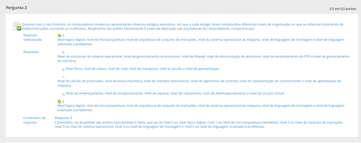 Pergunta 2 0,5 em 0,5 pontos Durante todo seu os computadores modernos apresentaram diversos estágios evolutivos, em que a cada estágio foram introduzidos diferentes níveis de organização no que se refere ao tratamento de tornando-os Atualmente são aceitos basicamente 6 níveis de abstração nas arquiteturas de computadores, compostos por: Resposta e. Selecionada: Nível lógico digital, nível de microarquitetura, nível de arquitetura de conjunto de instruções, do sistema operacional da nível de linguagem de montagem e nível de linguagem orientado a Respostas: a Nível de estruturas do sistema operacional, nível de gerenciamento de nível de nível de sincronização de processos, nível de escalonamento da CPU e nível de gerenciamento de b. Nível nível de nível de rede, nível de transporte, nível se sessão e nível de apresentação. C. Nível de cálculo de predicados, nível de busca nível de métodos estocásticos, nível de algoritmos de de representação do conhecimento e nível de aprendizado de d. Nível de endereçamento, nível de encapsulamento, nível de repasse, nível de nível de desencapsulamento e nível de circuito e. Nível lógico digital, nível de microarquitetura, de arquitetura de conjunto de instruções, do sistema operacional da máquina, nível de linguagem de montagem e nível de linguagem orientado a problemas. Comentário da Resposta: E resposta: Comentário: na atualidade são aceitos basicamente 6 níveis, que vai do nível 0 ou nível lógico digital, nível 1 ou nível de microarquitetura (hardware), nível 2 ou nível de conjunto de instruções, nível 3 ou nível de sistema operacional, nível 4 ou nível de linguagem de montagem e nível 5 ou nível de linguagem orientado à