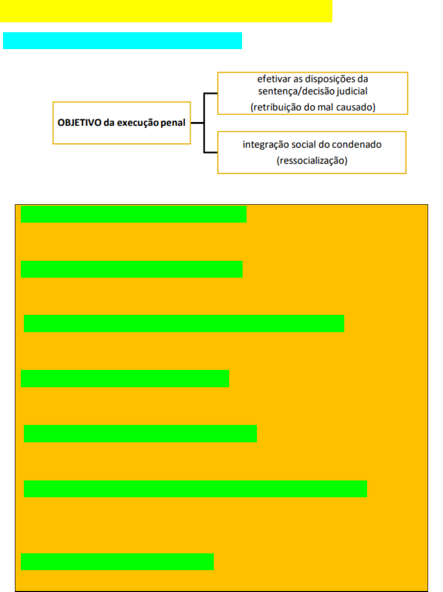 LEI DE EXECUÇÃO PENAL (LEI 7.210/84) – LEP 1. Objeto e Aplicação da LEP e princípios PRINCÍPIOS PRINCÍPIO da LEGALIDADE Ao condenado/internado serão assegurados TODOS os direitos NÃO atingidos pela sentença ou pela lei. PRINCÍPIO da IGUALDADE/ISONOMIA NÃO haverá qualquer distinção de natureza racial, social, religiosa ou política. PRINCÍPIO da INDIVIDUALIZAÇÃO da EXECUÇÃO PENAL Os condenados serão classificados, segundo os seus antecedentes e personalidade, para orientar a individualização da execução penal. PRINCÍPIO da JURISDICIONALIDADE Os incidentes na execução penal serão decididos pelo Poder Judiciário (Juiz da Execução). PRINCÍPIO do DEVIDO PROCESSO LEGAL O preso será ouvido e terá direito de defesa no procedimento de apuração de falta disciplinar. PRINCÍPIO DA HUMANIDADE/ HUMANIZAÇÃO DAS PENAS Garantia constitucional a ser observada na execução da pena (dignidade da pessoa humana + vedação tratamento desumano ou degradante). PRINCÍPIO DA RESSOCIALIZAÇÃO LEP declara com como objetivo a ressocialização. 2. Do Condenado e do Internado 2.1 Da Classificação Os condenados serão classificados pelos: ANTECEDENTES e PERSONALIDADE. Quem faz essa classificação? A CTC (Comissão Técnica de Classificação). ACTCpoderá: (i) entrevistarpessoas; (ii)requisitar, de repartições ou estabelecimentos privados, dados e informações a respeito do condenado e; (iii) realizar outras diligências/ exames. Exame CRIMINOLÓGICO: IDENTIFICAÇÃO do PERFIL GENÉTICO pela extração de DNA. ATENÇÃO para recente alteração legislativa no dispositivo da LEP: A RECUSA do condenado em submeter-se ao procedimento de identificação do perfil genético configura FALTA GRAVE!!! (PACOTE ANTICRIME). O perfil genético será armazenado em BANCO DE DADOS com as seguintes características: A amostra biológica coletada (por perito) só poderá ser utilizada para o único e exclusivo fim de identificação pelo perfil genético, NÃO estando autorizadas as práticas de fenotipagem genética ou de busca familiar. Após identificação do perfil genético (laudo perito), a amostra biológica recolhida deverá ser correta e imediatamente descartada. 2.2 Da Assistência A ASSISTÊNCIA ao preso (cumpre pena) e ao internado (cumpre medida de segurança) é DEVER do Estado, objetivando prevenir o crime (prevenção) e orientar o retorno à convivência em sociedade (ressocialização) 2.3 Do Trabalho O TRABALHO do condenado, como DEVER social e condição de DIGNIDADE DA PESSOA HUMANA, terá finalidade EDUCATIVA e PRODUTIVA. A LEP prevê ainda: Principais características do TRABALHO do PRESO: Tem natureza DÚPLICE: é um DIREITO e também um DEVER do preso. Exceção: preso provisório e preso político: NÃO estão obrigados a trabalhar! Obs.: preso provisório (somente trabalho interno). NÃO está sujeito à Consolidação das Leis do Trabalho (CLT) REMUNERADO, mediante prévia tabela, NÃO podendo ser inferior a 3/4 do salário mínimo. Produto da remuneração pelo trabalho destinado: (i) indenização dos danos; (ii) assistência à família; (iii) pequenas despesas pessoais; (iv) ao ressarcimento ao Estado das despesas. Se sobrar: pecúlio (poupança) a ser entregue ao preso quando for posto em liberdade. Limitação do trabalho artesanal: deverá ser limitado, tanto quanto possível, o artesanato sem expressão econômica, SALVO nas regiões de turismo. Idosos, doentes e deficientes: atividades apropriadas à sua idade/estado. Jornada normal de trabalho NÃO será inferior a 6 nem superior a 8 horas, com descanso nos domingos e feriados. Exceção: horário especial preso que faz serviços de manutenção do estabelecimento prisional Quanto ao TRABALHO EXTERNO do preso: 2.4 Dos Deveres, dos Direitos e da Disciplina DEVERES : I - comportamento disciplinado e cumprimento fiel da sentença; II - obediência ao servidor e respeito a qualquer pessoa com quem deva relacionar- se; III - urbanidade e respeito no trato com os demais condenados; IV - conduta oposta aos movimentos individuais ou coletivos de fuga ou de subversão à ordem ou à disciplina; V - execução do trabalho, das tarefas e das ordens recebidas; VI - submissão à sanção disciplinar imposta; VII - indenização à vitima ou aos seus sucessores; VIII - indenização ao Estado, quando possível, das despesas realizadas com a sua manutenção, mediante desconto proporcional da remuneração do trabalho; IX - higiene pessoal e asseio da cela ou alojamento; X - conservação dos objetos de uso pessoal. DIREITOS: I - alimentação suficiente e vestuário; II - atribuição de trabalho e sua remuneração; III - Previdência Social; IV - constituição de pecúlio; V - proporcionalidade na distribuição do tempo para o trabalho, o descanso e a recreação; VI - exercício das atividades profissionais, intelectuais, artísticas e desportivas anteriores, desde que compatíveis com a execução da pena; VII - assistência material, à saúde, jurídica, educacional, social e religiosa; VIII - proteção contra qualquer forma de sensacionalismo; IX - entrevista pessoal e reservada com o advogado; X - visitado cônjuge, da companheira, de parentes e amigos em dias determinados; XI - chamamento nominal; (direito ao nome e não ser chamado por um número). XII - igualdade de tratamentosalvo quanto às exigências da individualização da pena; XIII - audiência especial com o diretor do estabelecimento; XIV - representação e petição a qualquer autoridade, em defesa de direito; XV - contato com o mundo exterior por meio de correspondência escrita, da leitura e de outros meios de informação que não comprometam a moral e os bons costumes. XVI – atestado de pena a cumprir, emitido anualmente, sob pena da responsabilidade da autoridade judiciária (juiz) competente IMPORTANTE: Os direitos previstos nos incisos V,XeXV (proporcionalidade distribuição do tempo, visitas e contato mundo exterior) poder