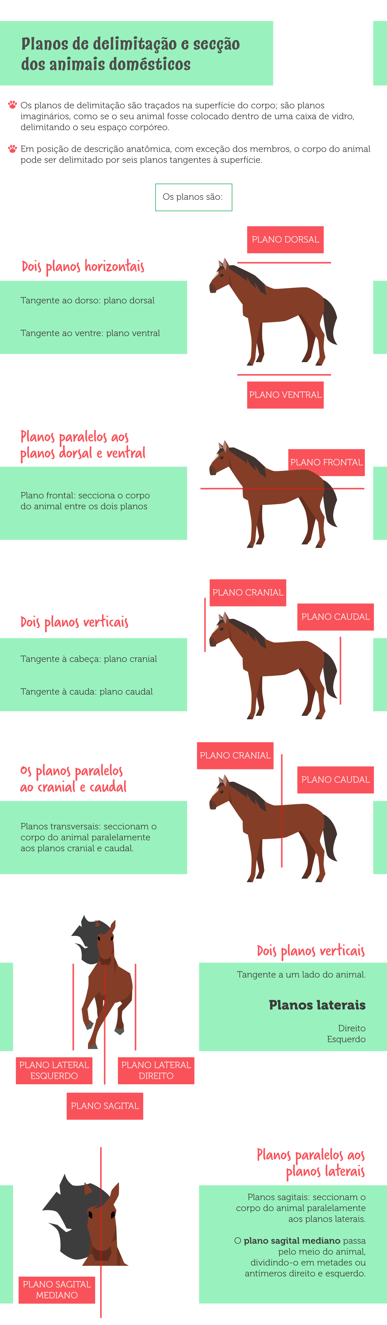 Planos de delimitação e secção dos animais domésticos Os planos de delimitação são traçados na superfície do corpo; são planos imaginários, como se seu animal fosse colocado dentro de uma caixa de vidro, delimitando seu espaço Em posição de descrição anatômica, com exceção dos membros, corpo do animal pode ser delimitado por seis planos tangentes à superfície. Os planos são: PLANO DORSAL Dois planos horizontais Tangente ao dorso: plano dorsal Tangente ao ventre: plano ventral PLANO VENTRAL Planos paralelos aos planos dorsal e ventral PLANO FRONTAL Plano frontal: secciona o corpo do animal entre os dois planos PLANO CRANIAL Dois planos verticais PLANO CAUDAL Tangente à cabeça: plano cranial Tangente à cauda: plano caudal PLANO CRANIAL os planos paralelos PLANO CAUDAL ao cranial e caudal Planos transversais: seccionam o corpo do animal paralelamente aos planos cranial e caudal. Dois planos verticais Tangente a um lado do animal. Planos laterais Direito Esquerdo PLANO LATERAL PLANO LATERAL ESQUERDO DIREITO PLANO SAGITAL Planos paralelos aos planos laterais Planos sagitais: seccionam corpo do animal paralelamente aos planos laterais. plano sagital mediano passa pelo meio do animal, em metades ou antímeros direito e esquerdo. PLANO SAGITAL MEDIANO