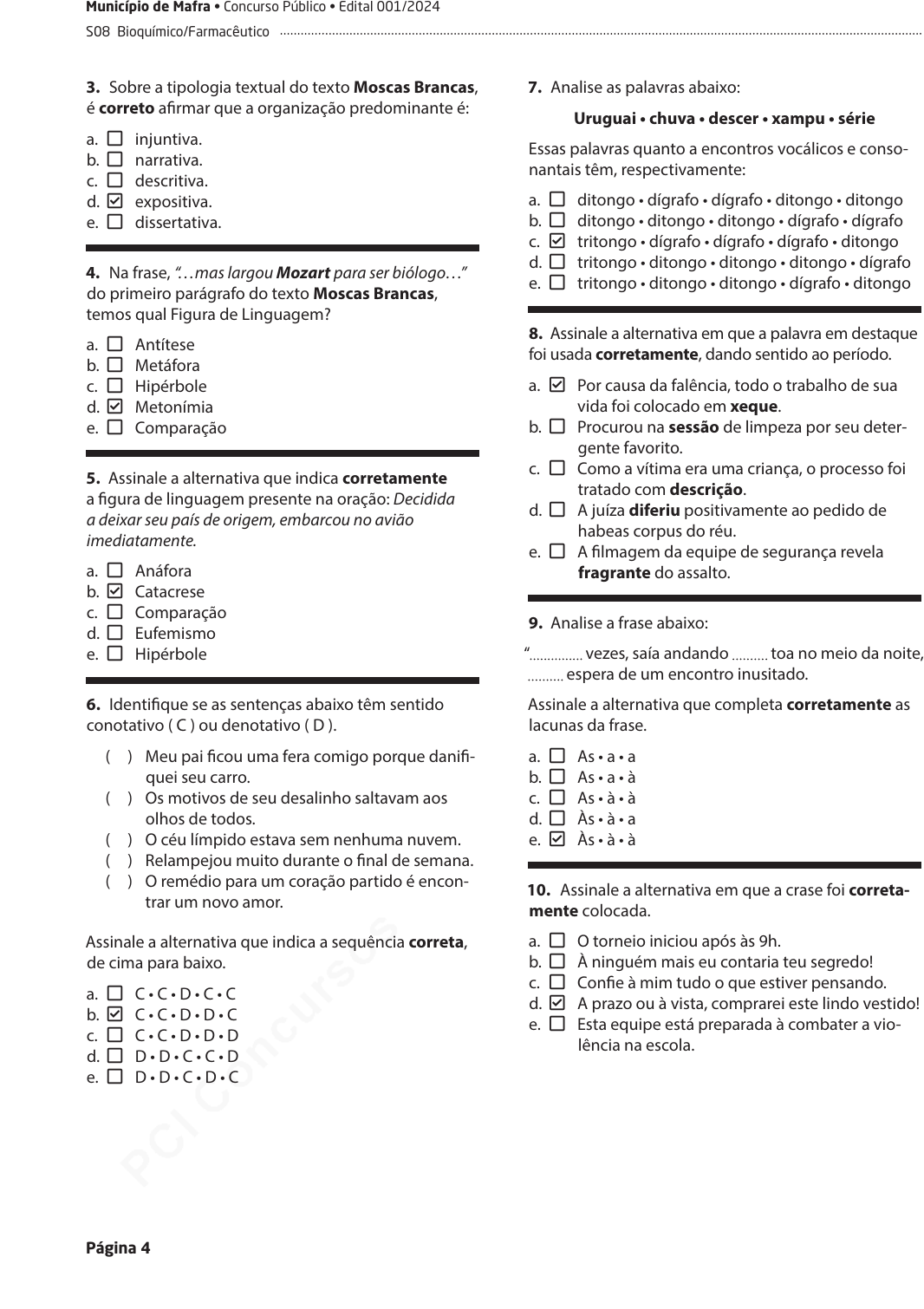 pcimarkpci MDAwMDowMDAwOjAwMDA6MDAwMDowMDAwOmZmZmY6YmZiOTphZTA5:VGh1LCAyNyBNYXIgMjAyNSAwMTowMzowNiAtMDMwMA== www.pciconcursos.com.br Página 4 Município de Mafra • Concurso Público • Edital 001/2024 S08 Bioquímico/Farmacêutico 3. Sobre a tipologia textual do texto Moscas Brancas, é correto afirmar que a organização predominante é: a. SQUARE injuntiva. b. SQUARE narrativa. c. SQUARE descritiva. d. Check-square expositiva. e. SQUARE dissertativa. 4. Na frase, “…mas largou Mozart para ser biólogo…” do primeiro parágrafo do texto Moscas Brancas, temos qual Figura de Linguagem? a. SQUARE Antítese b. SQUARE Metáfora c. SQUARE Hipérbole d. Check-square Metonímia e. SQUARE Comparação 5. Assinale a alternativa que indica corretamente a figura de linguagem presente na oração: Decidida a deixar seu país de origem, embarcou no avião imediatamente. a. SQUARE Anáfora b. Check-square Catacrese c. SQUARE Comparação d. SQUARE Eufemismo e. SQUARE Hipérbole 6. Identifique se as sentenças abaixo têm sentido conotativo ( C ) ou denotativo ( D ). ( ) Meu pai ficou uma fera comigo porque danifi- quei seu carro. ( ) Os motivos de seu desalinho saltavam aos olhos de todos. ( ) O céu límpido estava sem nenhuma nuvem. ( ) Relampejou muito durante o final de semana. ( ) O remédio para um coração partido é encon- trar um novo amor. Assinale a alternativa que indica a sequência correta, de cima para baixo. a. SQUARE C • C • D • C • C b. Check-square C • C • D • D • C c. SQUARE C • C • D • D • D d. SQUARE D • D • C • C • D e. SQUARE D • D • C • D • C 7. Analise as palavras abaixo: Uruguai • chuva • descer • xampu • série Essas palavras quanto a encontros vocálicos e conso- nantais têm, respectivamente: a. SQUARE ditongo • dígrafo • dígrafo • ditongo • ditongo b. SQUARE ditongo • ditongo • ditongo • dígrafo • dígrafo c. Check-square tritongo • dígrafo • dígrafo • dígrafo • ditongo d. SQUARE tritongo • ditongo • ditongo • ditongo • dígrafo e. SQUARE tritongo • ditongo • ditongo • dígrafo • ditongo 8. Assinale a alternativa em que a palavra em destaque foi usada corretamente, dando sentido ao período. a. Check-square Por causa da falência, todo o trabalho de sua vida foi colocado em xeque. b. SQUARE Procurou na sessão de limpeza por seu deter- gente favorito. c. SQUARE Como a vítima era uma criança, o processo foi tratado com descrição. d. SQUARE A juíza diferiu positivamente ao pedido de habeas corpus do réu. e. SQUARE A filmagem da equipe de segurança revela fragrante do assalto. 9. Analise a frase abaixo: “ vezes, saía andando toa no meio da noite, espera de um encontro inusitado. Assinale a alternativa que completa corretamente as lacunas da frase. a. SQUARE As • a • a b. SQUARE As • a • à c. SQUARE As • à • à d. SQUARE Às • à • a e. Check-square Às • à • à 10. Assinale a alternativa em que a crase foi correta- mente colocada. a. SQUARE O torneio iniciou após às 9h. b. SQUARE À ninguém mais eu contaria teu segredo! c. SQUARE Confie à mim tudo o que estiver pensando. d. Check-square A prazo ou à vista, comprarei este lindo vestido! e. SQUARE Esta equipe está preparada à combater a vio- lência na escola. pcimarkpci MDAwMDowMDAwOjAwMDA6MDAwMDowMDAwOmZmZmY6YmZiOTphZTA5:VGh1LCAyNyBNYXIgMjAyNSAwMTowMzowNiAtMDMwMA== www.pciconcursos.com.br Página 5 Município de Mafra • Concurso Público • Edital 001/2024 S08 Bioquímico/Farmacêutico 14. Assinale a alternativa na qual todas os vocábulos foram escritos segundo a nova ortografia. a. Check-square ultrarromântico • circum-navegação • anti-inflamatório • antirracista b. SQUARE ultrarromântico • circum-navegação • anti-inflamatório • anti-racista c. SQUARE ultra-romântico • circumnavegação • antiinflamatório • antirracista d. SQUARE ultra-romântico • circumnavegação • anti-inflamatório • anti-racista e. SQUARE ultra-romântico • circum-navegação • antiinflamatório • antirracista 15. Assinale a alternativa em que a pontuação do período abaixo está correta. a. SQUARE Nossas retinas têm, dois tipos de células detec- toras de luz; os bastonetes, responsáveis pela visão em preto e branco, e os cones, que nos dão as cores. b. SQUARE Nossas retinas, têm dois tipos de células, detec- toras de luz. Os bastonetes, responsáveis pela visão em preto e branco, e os cones, que nos dão as cores. c. SQUARE Nossas retinas, têm dois tipos de células, detec- toras de luz, “os bastonetes responsáveis pela visão em preto e branco”, e “os cones, que nos dão as cores”. d. SQUARE Nossas retinas têm dois tipos de células detec- toras de luz…, os bastonetes responsáveis pela visão em preto e branco e os cones que nos dão as cores. e. Check-square Nossas retinas têm dois tipos de células detec- toras de luz: os bastonetes, responsáveis pela visão em preto e branco, e os cones, que nos dão as cores. Conhecimentos Gerais 5 questões 16. Assinale a alternativa que aponta corretamente municípios limítrofes do município de Mafra. a. SQUARE Itaiópolis, Joinville e Piên b. Check-square Três Barras, Papanduva e Rio Negro c. SQUARE Rio Negro, Monte Castelo e Irienopólis d. SQUARE Rio Negrinho, Pato Branco e Antonio Olinto e. SQUARE Papanduva, Bela Vista do Toldo e Timbó Grande 11. Analise as colocações pronominais nas frases abaixo. 1. Fique tranquila, tudo ficará entre mim e você. 2. Para mim chegar cedo, preciso sair agora. 3. Ela não iria sem mim! Assinale a alternativa que indica todas as frases corre- tas quanto as colocações pronominais. a. SQUARE É correta apenas a frase 1. b. SQUARE É correta apenas a frase 2. c. SQUARE É correta apenas a frase 3. d. SQUARE São corretas apenas as frases 1 e 2. e. Check-square São corretas apenas as frases 1 e 3. 12. Assinale a alternativa em que a frase está correta de 