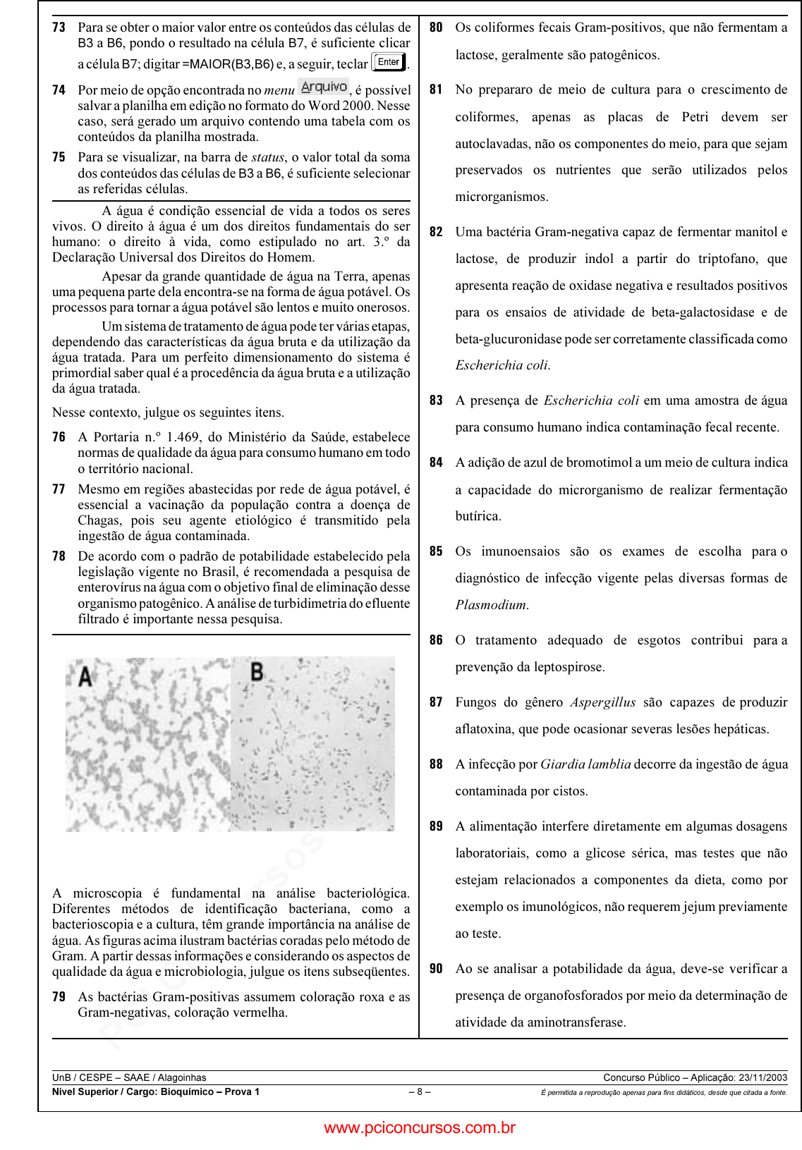 pcimarkpci MDAwMDowMDAwOjAwMDA6MDAwMDowMDAwOmZmZmY6YmZiOTphZTA5:VGh1LCAyNyBNYXIgMjAyNSAwMTowMjoxOCAtMDMwMA== www.pciconcursos.com.br UnB / CESPE – SAAE / Alagoinhas Concurso Público – Aplicação: 23/11/2003 Nível Superior / Cargo: Bioquímico – Prova 1 – 8 – É permitida a reprodução apenas para fins didáticos, desde que citada a fonte. ��� Para se obter o maior valor entre os conteúdos das células de B3 a B6, pondo o resultado na célula B7, é suficiente clicar a célula B7; digitar =MAIOR(B3,B6) e, a seguir, teclar . ��� Por meio de opção encontrada no menu , é possível salvar a planilha em edição no formato do Word 2000. Nesse caso, será gerado um arquivo contendo uma tabela com os conteúdos da planilha mostrada. ��� Para se visualizar, na barra de status, o valor total da soma dos conteúdos das células de B3 a B6, é suficiente selecionar as referidas células. A água é condição essencial de vida a todos os seres vivos. O direito à água é um dos direitos fundamentais do ser humano: o direito à vida, como estipulado no art. 3.º da Declaração Universal dos Direitos do Homem. Apesar da grande quantidade de água na Terra, apenas uma pequena parte dela encontra-se na forma de água potável. Os processos para tornar a água potável são lentos e muito onerosos. Um sistema de tratamento de água pode ter várias etapas, dependendo das características da água bruta e da utilização da água tratada. Para um perfeito dimensionamento do sistema é primordial saber qual é a procedência da água bruta e a utilização da água tratada. Nesse contexto, julgue os seguintes itens. ��� A Portaria n.º 1.469, do Ministério da Saúde, estabelece normas de qualidade da água para consumo humano em todo o território nacional. ��� Mesmo em regiões abastecidas por rede de água potável, é essencial a vacinação da população contra a doença de Chagas, pois seu agente etiológico é transmitido pela ingestão de água contaminada. � � De acordo com o padrão de potabilidade estabelecido pela legislação vigente no Brasil, é recomendada a pesquisa de enterovírus na água com o objetivo final de eliminação desse organismo patogênico. A análise de turbidimetria do efluente filtrado é importante nessa pesquisa. A microscopia é fundamental na análise bacteriológica. Diferentes métodos de identificação bacteriana, como a bacterioscopia e a cultura, têm grande importância na análise de água. As figuras acima ilustram bactérias coradas pelo método de Gram. A partir dessas informações e considerando os aspectos de qualidade da água e microbiologia, julgue os itens subseqüentes. � � As bactérias Gram-positivas assumem coloração roxa e as Gram-negativas, coloração vermelha. �� Os coliformes fecais Gram-positivos, que não fermentam a lactose, geralmente são patogênicos. �� No prepararo de meio de cultura para o crescimento de coliformes, apenas as placas de Petri devem ser autoclavadas, não os componentes do meio, para que sejam preservados os nutrientes que serão utilizados pelos microrganismos. �� Uma bactéria Gram-negativa capaz de fermentar manitol e lactose, de produzir indol a partir do triptofano, que apresenta reação de oxidase negativa e resultados positivos para os ensaios de atividade de beta-galactosidase e de beta-glucuronidase pode ser corretamente classificada como Escherichia coli. �� A presença de Escherichia coli em uma amostra de água para consumo humano indica contaminação fecal recente. �� A adição de azul de bromotimol a um meio de cultura indica a capacidade do microrganismo de realizar fermentação butírica. �� Os imunoensaios são os exames de escolha para o diagnóstico de infecção vigente pelas diversas formas de Plasmodium. �� O tratamento adequado de esgotos contribui para a prevenção da leptospirose. �� Fungos do gênero Aspergillus são capazes de produzir aflatoxina, que pode ocasionar severas lesões hepáticas. � A infecção por Giardia lamblia decorre da ingestão de água contaminada por cistos. � A alimentação interfere diretamente em algumas dosagens laboratoriais, como a glicose sérica, mas testes que não estejam relacionados a componentes da dieta, como por exemplo os imunológicos, não requerem jejum previamente ao teste. �� Ao se analisar a potabilidade da água, deve-se verificar a presença de organofosforados por meio da determinação de atividade da aminotransferase. www.pciconcursos.com.br pcimarkpci MDAwMDowMDAwOjAwMDA6MDAwMDowMDAwOmZmZmY6YmZiOTphZTA5:VGh1LCAyNyBNYXIgMjAyNSAwMTowMjoxOCAtMDMwMA== www.pciconcursos.com.br UnB / CESPE – SAAE / Alagoinhas Concurso Público – Aplicação: 23/11/2003 Nível Superior / Cargo: Bioquímico – Prova 1 – 9 – É permitida a reprodução apenas para fins didáticos, desde que citada a fonte. 0 50 100 150 200 250 300 0 50 100 150 200 250 300 350 400 co n ce n tr aç ão ( g/ L ) µ dosagem de cianotoxinas – padrão 2 área do pico dosagem de cianotoxinas – padrão 1 0 50 100 150 200 250 300 350 0 200 400 600 800 1000 1200 área do pico co nc en tr aç ão ( g /L ) µ Ao realizar a análise de água visando a detecção de cianotoxinas produzidas pelos organismos ilustrados na foto acima, foram feitas cromatografias líquidas comparando-se as amostras a padrões de derivados de cianotoxinas em diferentes concentrações previamente conhecidas. Os gráficos acima mostram a correlação entre a área dos picos cromatográficos obtidos e as respectivas concentrações. A partir dessas informações e considerando os aspectos relativos ao preparo de soluções e à detecção de toxinas, julgue os itens que se seguem. ��� A análise dos gráficos mostra que a cianotoxina analisada no padrão 1 apresenta maior efeito tóxico que quando analisada no padrão 2. ��� Sabendo-se que a equação da reta que representa a dosagem de ciano