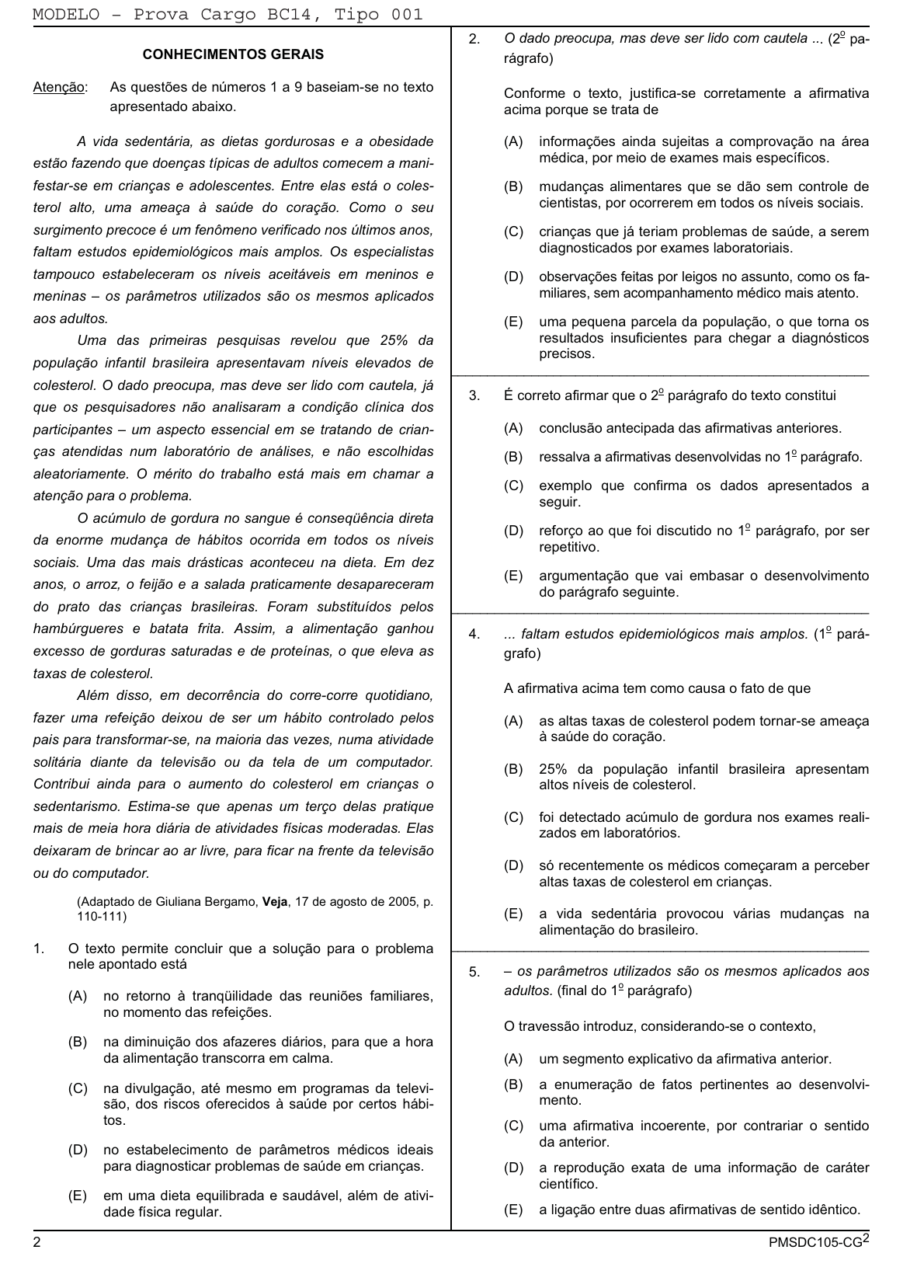 pcimarkpci MjgwNDowMjE0Ojg4ZTE6NjdkZTphNGFkOmVmZmY6ZmU1YjozNDQ3:VGh1LCAyNyBNYXIgMjAyNSAwMDozNzowOSAtMDMwMA== www.pciconcursos.com.br 19/10/05 - 10:35 2 PMSDC105-CG2 CONHECIMENTOS GERAIS Atenção: As questões de números 1 a 9 baseiam-se no texto apresentado abaixo. A vida sedentária, as dietas gordurosas e a obesidade estão fazendo que doenças típicas de adultos comecem a mani- festar-se em crianças e adolescentes. Entre elas está o coles- terol alto, uma ameaça à saúde do coração. Como o seu surgimento precoce é um fenômeno verificado nos últimos anos, faltam estudos epidemiológicos mais amplos. Os especialistas tampouco estabeleceram os níveis aceitáveis em meninos e meninas – os parâmetros utilizados são os mesmos aplicados aos adultos. Uma das primeiras pesquisas revelou que 25% da população infantil brasileira apresentavam níveis elevados de colesterol. O dado preocupa, mas deve ser lido com cautela, já que os pesquisadores não analisaram a condição clínica dos participantes – um aspecto essencial em se tratando de crian- ças atendidas num laboratório de análises, e não escolhidas aleatoriamente. O mérito do trabalho está mais em chamar a atenção para o problema. O acúmulo de gordura no sangue é conseqüência direta da enorme mudança de hábitos ocorrida em todos os níveis sociais. Uma das mais drásticas aconteceu na dieta. Em dez anos, o arroz, o feijão e a salada praticamente desapareceram do prato das crianças brasileiras. Foram substituídos pelos hambúrgueres e batata frita. Assim, a alimentação ganhou excesso de gorduras saturadas e de proteínas, o que eleva as taxas de colesterol. Além disso, em decorrência do corre-corre quotidiano, fazer uma refeição deixou de ser um hábito controlado pelos pais para transformar-se, na maioria das vezes, numa atividade solitária diante da televisão ou da tela de um computador. Contribui ainda para o aumento do colesterol em crianças o sedentarismo. Estima-se que apenas um terço delas pratique mais de meia hora diária de atividades físicas moderadas. Elas deixaram de brincar ao ar livre, para ficar na frente da televisão ou do computador. (Adaptado de Giuliana Bergamo, Veja, 17 de agosto de 2005, p. 110-111) 1. O texto permite concluir que a solução para o problema nele apontado está (A) no retorno à tranqüilidade das reuniões familiares, no momento das refeições. (B) na diminuição dos afazeres diários, para que a hora da alimentação transcorra em calma. (C) na divulgação, até mesmo em programas da televi- são, dos riscos oferecidos à saúde por certos hábi- tos. (D) no estabelecimento de parâmetros médicos ideais para diagnosticar problemas de saúde em crianças. (E)) em uma dieta equilibrada e saudável, além de ativi- dade física regular. 2. O dado preocupa, mas deve ser lido com cautela ... (2o pa- rágrafo) Conforme o texto, justifica-se corretamente a afirmativa acima porque se trata de (A) informações ainda sujeitas a comprovação na área médica, por meio de exames mais específicos. (B) mudanças alimentares que se dão sem controle de cientistas, por ocorrerem em todos os níveis sociais. (C)) crianças que já teriam problemas de saúde, a serem diagnosticados por exames laboratoriais. (D) observações feitas por leigos no assunto, como os fa- miliares, sem acompanhamento médico mais atento. (E) uma pequena parcela da população, o que torna os resultados insuficientes para chegar a diagnósticos precisos. _________________________________________________________ 3. É correto afirmar que o 2o parágrafo do texto constitui (A) conclusão antecipada das afirmativas anteriores. (B)) ressalva a afirmativas desenvolvidas no 1o parágrafo. (C) exemplo que confirma os dados apresentados a seguir. (D) reforço ao que foi discutido no 1o parágrafo, por ser repetitivo. (E) argumentação que vai embasar o desenvolvimento do parágrafo seguinte. _________________________________________________________ 4. ... faltam estudos epidemiológicos mais amplos. (1o pará- grafo) A afirmativa acima tem como causa o fato de que (A) as altas taxas de colesterol podem tornar-se ameaça à saúde do coração. (B) 25% da população infantil brasileira apresentam altos níveis de colesterol. (C) foi detectado acúmulo de gordura nos exames reali- zados em laboratórios. (D)) só recentemente os médicos começaram a perceber altas taxas de colesterol em crianças. (E) a vida sedentária provocou várias mudanças na alimentação do brasileiro. _________________________________________________________ 5. – os parâmetros utilizados são os mesmos aplicados aos adultos. (final do 1o parágrafo) O travessão introduz, considerando-se o contexto, (A)) um segmento explicativo da afirmativa anterior. (B) a enumeração de fatos pertinentes ao desenvolvi- mento. (C) uma afirmativa incoerente, por contrariar o sentido da anterior. (D) a reprodução exata de uma informação de caráter científico. (E) a ligação entre duas afirmativas de sentido idêntico. MODELO − Prova Cargo BC14, Tipo 001 pcimarkpci MjgwNDowMjE0Ojg4ZTE6NjdkZTphNGFkOmVmZmY6ZmU1YjozNDQ3:VGh1LCAyNyBNYXIgMjAyNSAwMDozNzowOSAtMDMwMA== www.pciconcursos.com.br 19/10/05 - 10:35 PMSDC105-CG2 3 6. ... já que os pesquisadores não analisaram a condição clínica dos participantes. (2o parágrafo) O verbo que exige o mesmo tipo de complemento que o do grifado acima está na frase: (A) Entre elas está o colesterol alto ... (B) Uma das mais drásticas aconteceu na dieta. (C)) ... o que eleva as taxas de colesterol. (D) ... praticamente desapareceram do prato das crian- ças brasileiras. (E) ... para ficar na frente da televisão ou do compu- tador. _________________________________________________________ 7. ... que doenças típicas de adultos comecem a manifestar- se em crianças e adolescentes. (início do texto) O verbo flexionado no mesmo tempo e modo do grifado acima está na frase: (A) ... que