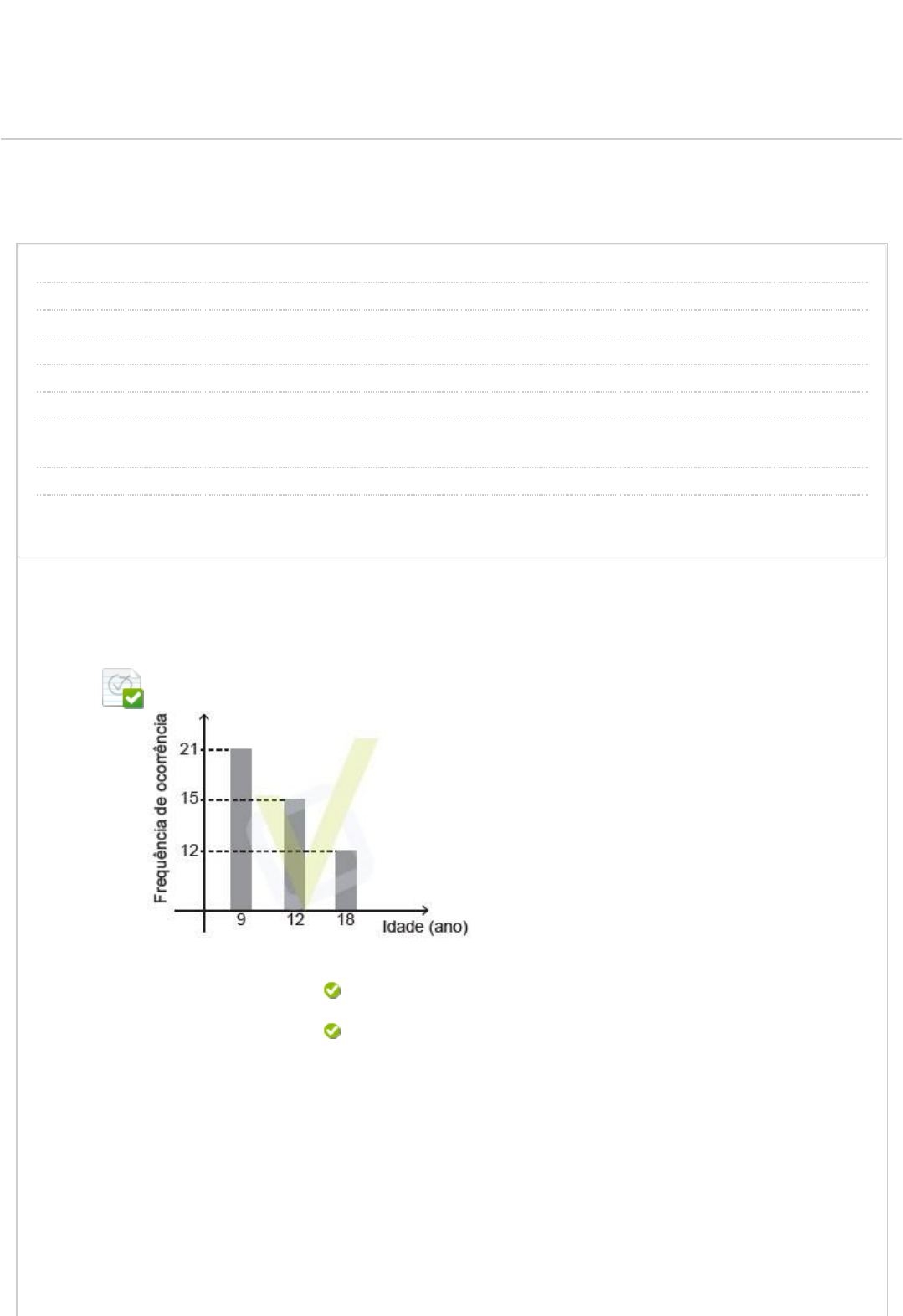 Revisar envio do teste: QUESTIONÁRIO UNIDADE II ESTATÍSTICA DESCRITIVA 7673-30_45301_R_F1_20251 CONTEÚDO Usuário kathyenne.lopes @aluno.unip.br Curso ESTATÍSTICA DESCRITIVA Teste QUESTIONÁRIO UNIDADE II Iniciado 27/03/25 09:15 Enviado 27/03/25 09:42 Status Completada Resultado da tentativa 4 em 5 pontos Tempo decorrido 26 minutos Resultados exibidos Todas as respostas, Respostas enviadas, Respostas corretas, Comentários, Perguntas respondidas incorretamente Pergunta 1 Resposta Selecionada: a. Respostas: a. b. c. d. e. Comentário da resposta: (ENEM-2015) Uma pessoa, ao fazer uma pesquisa com alguns alunos de um curso, coletou as idades dos entrevistados e organizou esses dados em um gráfico. Qual a moda das idades, em anos, dos entrevistados? 9 9 12 13 15 21 Resposta: a Comentário: Moda é a que possui maior frequência, neste caso a idade de 9 anos tem 21 alunos. UNIP EAD BIBLIOTECAS MURAL DO ALUNO TUTORIAISCONTEÚDOS ACADÊMICOS 0,5 em 0,5 pontos 27/03/2025, 09:47 Revisar envio do teste: QUESTIONÁRIO UNIDADE II – ... https://ava.ead.unip.br/webapps/assessment/review/review.jsp?attempt_id=_111736441_1&course_id=_389375_1&content_id=_4377025_1&retu… 1/7 http://company.blackboard.com/ https://ava.ead.unip.br/webapps/blackboard/execute/courseMain?course_id=_389375_1 https://ava.ead.unip.br/webapps/blackboard/content/listContent.jsp?course_id=_389375_1&content_id=_4376147_1&mode=reset https://ava.ead.unip.br/webapps/portal/execute/tabs/tabAction?tab_tab_group_id=_10_1 https://ava.ead.unip.br/webapps/portal/execute/tabs/tabAction?tab_tab_group_id=_27_1 https://ava.ead.unip.br/webapps/portal/execute/tabs/tabAction?tab_tab_group_id=_47_1 https://ava.ead.unip.br/webapps/portal/execute/tabs/tabAction?tab_tab_group_id=_29_1 https://ava.ead.unip.br/webapps/portal/execute/tabs/tabAction?tab_tab_group_id=_25_1 https://ava.ead.unip.br/webapps/login/?action=logout Pergunta 2 Resposta Selecionada: a. Respostas: a. b. c. d. e. Comentário da resposta: (Mackenzie-2012/1) A tabela acima refere-se a uma prova aplicada a 200 alunos, distribuídos em 4 turmas: A, B, C e D. A média aritmética das notas dessa prova é: 4,65 4,65 4,25 4,45 4,55 4,35 Resposta: a Comentário: para calcular a média em dados agrupados precisamos multiplicar o valor do ponto pela frequência. Pergunta 3 (ENEM-2011) Uma equipe de especialistas do centro meteorológico de uma cidade mediu a temperatura do ambiente, sempre no mesmo horário, durante 15 dias intercalados, a partir do primeiro dia de um mês. Esse tipo de procedimento é frequente, uma vez que os dados coletados servem de referência para estudos e verificação de tendências climáticas ao longo dos meses e anos. As medições ocorridas nesse período estão indicadas no quadro: 0,5 em 0,5 pontos 0,5 em 0,5 pontos 27/03/2025, 09:47 Revisar envio do teste: QUESTIONÁRIO UNIDADE II – ... https://ava.ead.unip.br/webapps/assessment/review/review.jsp?attempt_id=_111736441_1&course_id=_389375_1&content_id=_4377025_1&retu… 2/7 Resposta Selecionada: b. Respostas: a. b. c. d. e. Comentário da resposta: Em relação à temperatura, os valores da média, mediana e moda são, respectivamente, iguais a: 17 °C, 18 °C e 13,5 °C. 17 °C, 17 °C e 13,5 °C. 17 °C, 18 °C e 13,5 °C. 17 °C, 13,5 °C e 18 °C. 17 °C, 18 °C e 21,5 °C. 17 °C, 13,5 °C e 21,5 °C. Resposta: b Comentário: Caro aluno, lembre-se: o primeiro passo para calcular a média, mediana e a moda é colocar os pontos em ordem crescente. Moda é a que possui maior frequência. Temos 15 pontos (ímpar), então a mediana é o ponto central. Pergunta 4 Resposta Selecionada: a. Respostas: a. b. c. d. (VUNESP-Desenvolve/SP/2014) Numa prova feita em uma classe com 40 alunos, um aluno teve nota 10, cinco tiraram 8, dez tiraram 5, oito tiraram 4, oito tiraram 3, cinco tiraram 2 e três tiraram zero. A média, a mediana e a moda das notas dessa classe foram, respectivamente: 4,15; 4 e 5. 4,15; 4 e 5. 4,15; 4 e 4. 4,5; 4 e 5. 4,5; 5 e 4. 0,5 em 0,5 pontos 27/03/2025, 09:47 Revisar envio do teste: QUESTIONÁRIO UNIDADE II – ... https://ava.ead.unip.br/webapps/assessment/review/review.jsp?attempt_id=_111736441_1&course_id=_389375_1&content_id=_4377025_1&retu… 3/7 e. Comentário da resposta: 5; 5 e 5. Resposta: A Comentário: Para calcular a média, mediana e a moda, é só colocar os pontos em ordem crescente. Moda é a que possui maior frequência, no caso a nota 5 (10 vezes). Pergunta 5 Resposta Selecionada: c. Respostas: a. b. c. d. e. Comentário da resposta: Um carteiro decide registrar o número de cartas enviadas a um endereço nos últimos 7 dias. No entanto, ele se esquece do número de cartas do primeiro dia, lembrando-se apenas daqueles correspondentes aos 6 dias restantes: 3, 5, 4, 5, 4 e 3, e de que, nos 7 dias considerados, a média, a mediana e a moda foram iguais. O número de cartas enviadas no primeiro dia foi: 4 2 3 4 5 6 Resposta: C Comentário: Primeiro ordenamos os pontos: 3, 3, 4, 4, 5, 5 A seguir, para resolução deste exercício temos que ter domínio dos conceitos teóricos sobre média, mediana e moda. Temos sete valores, a mediana será o valor contido na quarta posição. Com isto podemos eliminar a opções a, b, d, e, restando apenas o 4. Pergunta 6 Resposta Selecionada: e. Respostas: a. b. c. d. (IADES/EBSERH-2014) Um grupo de alunos é submetido a uma avaliação, e foram obtidas as seguintes notas: 3, 4, 5, 6 e 7. Com base nessas informações, assinale a alternativa que apresenta o desvio padrão desse grupo. 1,41 1,15 1,21 1,79 1,61 0,5 em 0,5 pontos 0,5 em 0,5 pontos 27/03/2025, 09:47 Revisar envio do teste: QUESTIONÁRIO UNIDADE II – ... https://ava.ead.unip.br/webapps/assessment/review/review.jsp?attempt_id=_111736441_1&course_id=_389375_1&content_id=_4377025_1&retu… 4/7 e. Comentário da resposta: 1,41 Resposta: E Comentário: Temos que calcular a média, em seguida calcular o desvio padrão utilizando a fórmula do desvio padrão Pergunta 7 Resposta Se