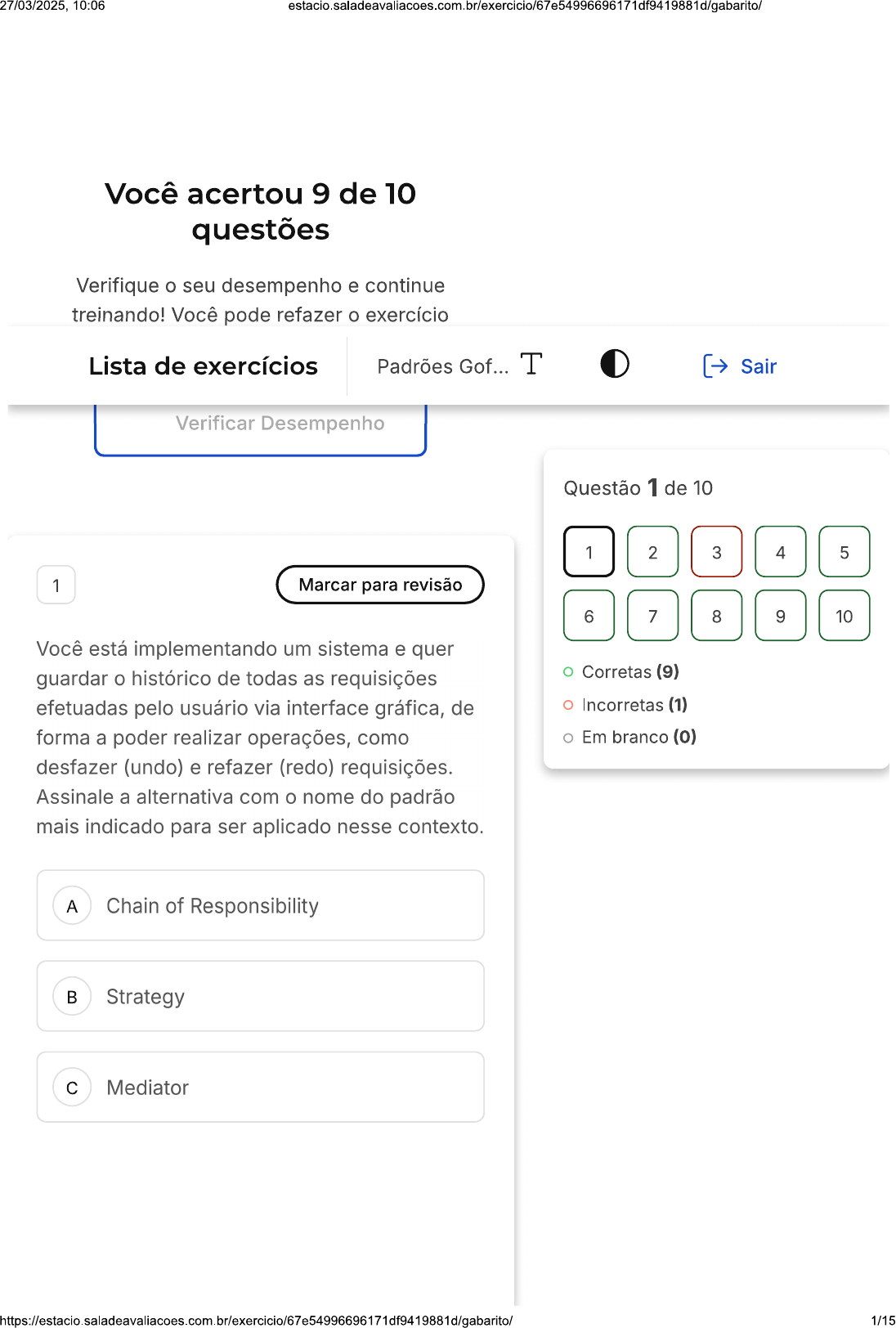 27/03/2025, 10:06 Você acertou 9 de 10 questões Verifique o seu desempenho e continue treinando! Você pode refazer o exercício Lista de exercícios Padrões Gof... T Sair Verificar Desempenho Questão 1 de 10 1 2 3 4 5 1 Marcar para revisão 6 7 8 9 10 Você está implementando um sistema e quer guardar o histórico de todas as requisições Corretas (9) efetuadas pelo usuário via interface gráfica, de Incorretas (1) forma a poder realizar operações, como Em branco (0) desfazer (undo) e refazer (redo) requisições. Assinale a alternativa com o nome do padrão mais indicado para ser aplicado nesse contexto. A Chain of Responsibility B Strategy C Mediator 1/1527/03/2025, 10:06 estacio.saladeavaliacoes.com.br/exercicio/67e54996696171df9419881d/gabarito/ D State E Command Resposta correta Parabéns, você selecionou a alternativa correta. Confira o gabarito comentado! Gabarito Comentado O padrão de projeto mais indicado para ser aplicado nesse contexto é o Command. Este padrão permite que você guarde as requisições (comandos) em uma fila, possibilitando a execução de operações como desfazer (undo) e refazer (redo). Ele encapsula uma solicitação como um objeto, permitindo assim parametrizar clientes com filas, solicitações e operações. 2 Marcar para revisão Suponha que existam diferentes algoritmos para resolver um problema, sendo que cada algoritmo se aplica melhor a um contexto específico (ex: volume maior ou menor de dados, frequência de modificações e de consultas). Esse padrão sugere resolver o problema encapsulando cada algoritmo em uma classe distinta, que implementa uma interface padrão utilizada pelos módulos clientes desses algoritmos. 2/1527/03/2025, 10:06 Assinale a alternativa com o nome do padrão que possui o propósito descrito no enunciado: A Strategy B Command C Memento D Chain of Responsibility E Mediator Resposta correta Parabéns, você selecionou a alternativa correta. Confira o gabarito comentado! Gabarito Comentado Gabarito: O padrão Strategy permite que um algoritmo seja selecionado e trocado em tempo de execução, sem alterar o código do cliente. 3 Marcar para revisão Sobre o padrão Observer, assinale a alternativa correta: 3/1527/03/2025, 10:06 É responsável por observar e promover as mudanças de estado de A um objeto que possui um ciclo de vida complexo. Define uma cadeia de objetos responsáveis pelo processamento de uma requisição, em que cada objeto da cadeia é responsável por observar B eventos gerados por um elemento central, realizar algum processamento e notificar o próximo objeto da sequência para continuar o processamento. É frequentemente utilizado na implementação de interfaces gráficas complexas, em que uma fonte de informação precisa estar sincronizada com diferentes visualizações apresentadas simultaneamente para o usuário. conceito de polimorfismo não está D presente na solução proposta pelo padrão. Permite o acesso sequencial a objetos organizados em uma coleção, sem E expor a representação interna dessa coleção. X Resposta incorreta Opa! A alternativa correta é a letra C. Confira o gabarito comentado! Gabarito Comentado 4/1527/03/2025, 10:06 O padrão Observer é frequentemente utilizado na implementação de interfaces gráficas complexas, em que uma fonte de informação precisa estar sincronizada com diferentes visualizações apresentadas simultaneamente para o usuário. Isso ocorre porque o padrão Observer permite que um objeto (o observador) seja notificado quando outro objeto (o assunto) sofre uma mudança de estado. Dessa forma, o observador pode atualizar sua representação da informação de acordo com a mudança de estado do assunto. 4 Marcar para revisão Assinale a alternativa que expressa a intenção do padrão de projeto Template Method: Encapsular uma família de algoritmos em objetos, permitindo que os A módulos clientes possam utilizar esses algoritmos de forma Definir uma relação de dependência entre objetos, de modo a garantir que modificações no estado do objeto detentor da informação sejam B notificadas automaticamente para os objetos inscritos previamente como interessados em receber essas notificações. 5/1527/03/2025, 10:06 Implementar a estrutura de um algoritmo genérico em uma superclasse, considerando que os C passos comuns são implementados na própria superclasse, enquanto os passos específicos são implementados nas suas subclasses. Permite capturar o estado interno de um objeto, permitindo que o seu D estado seja restaurado posteriormente, sem quebrar o encapsulamento desse objeto. Encapsular uma requisição em um objeto, permitindo o registro do E histórico de requisições disparadas pelos módulos cliente e a criação de filas de requisições. Resposta correta Parabéns, você selecionou a alternativa correta. Confira o gabarito comentado! Gabarito Comentado padrão de projeto Template Method tem como objetivo principal definir a estrutura de um algoritmo genérico em uma superclasse. Nesse padrão, os passos comuns do algoritmo são implementados na própria superclasse, enquanto os passos específicos, que podem variar conforme a necessidade, são implementados nas subclasses. Dessa forma, o Template Method permite que as subclasses redefinam certas etapas de um 6/1527/03/2025, 10:06 algoritmo sem alterar a estrutura do algoritmo em si. 5 Marcar para revisão Sobre o padrão Mediator, assinale a alternativa correta: Faz a mediação da execução de um conjunto de algoritmos paralelos, de A forma que não haja problemas de sincronização. Pode ser aplicado em conjunto com o B padrão Observer. Transforma uma interação entre C objetos de uma estrutura 1-N para uma estrutura N-N. Encapsula requisições em objetos, mediando o registro do histórico das D requisições e o gerenciamento de uma fila de requisições. Permite definir um conjunto de passos em uma superclasse, sendo os passos comuns implementados como E métodos d