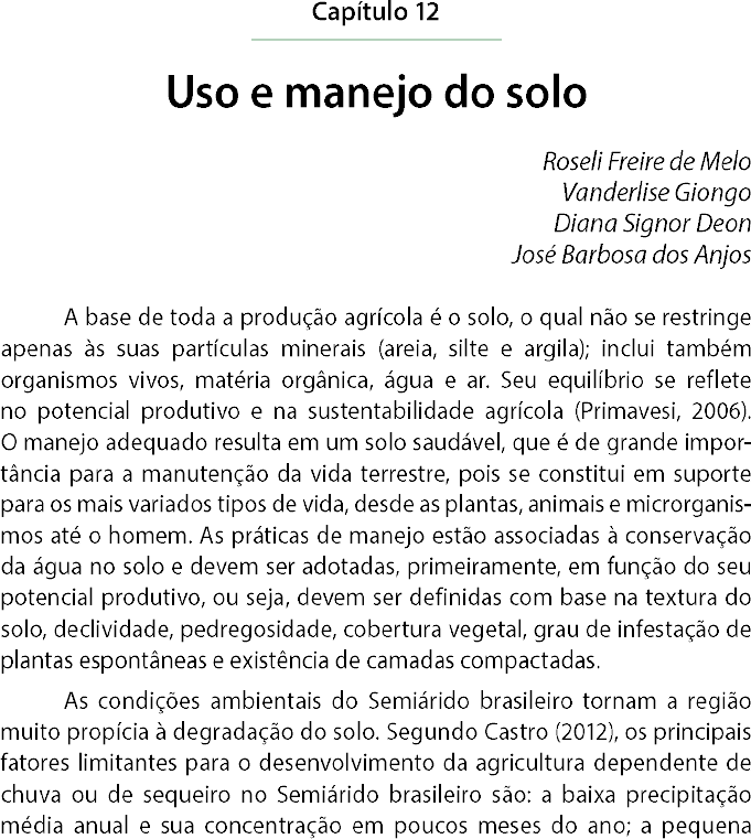 Capítulo 12 Uso e manejo do solo Roseli Freire de Melo Vanderlise Giongo Diana Signor Deon José Barbosa dos Anjos A base de toda a produção agrícola é solo, qual não se restringe apenas às suas partículas minerais (areia, silte e argila); inclui também organismos vivos, matéria orgânica, água e ar. Seu equilíbrio se reflete no potencial produtivo e na sustentabilidade agrícola (Primavesi, 2006). O manejo adequado resulta em um solo saudável, que é de grande impor- tância para a manutenção da vida terrestre, pois se constitui em suporte para os mais variados tipos de vida, desde as plantas, animais e microrganis- mos até homem. As práticas de manejo estão associadas à conservação da água no solo e devem ser adotadas, primeiramente, em função do seu potencial produtivo, ou seja, devem ser definidas com base na textura do solo, declividade, pedregosidade, cobertura vegetal, grau de infestação de plantas espontâneas e existência de camadas compactadas. As condições ambientais do Semiárido brasileiro tornam a região muito propícia à degradação do solo. Segundo Castro (2012), os principais fatores limitantes para desenvolvimento da agricultura dependente de chuva ou de sequeiro no Semiárido brasileiro são: a baixa precipitação média anual e sua concentração em poucos meses do ano; a pequena396 Agricultura familiar dependente de chuva no Semiárido quantidade de estabelecimentos agropecuários que adotam alguma medida para proteção dos recursos hídricos (por exemplo, mata ciliar e proteção de nascentes com vegetação); a baixa fertilidade natural dos solos da região, aliada à falta de adoção de práticas de manejo da fertili- dade do solo; as perdas de solo por erosão e a baixa adoção de práticas conservacionistas para conter esse processo; a desertificação; a baixa adoção de tecnologias ou a adoção de tecnologias defasadas na agricul- tura; e outros fatores relacionados à infraestrutura, como estruturas para armazenamento da produção e condições de conservação de rodovias e estradas para escoamento da produção. A agricultura dependente de chuva na região semiárida é natural- mente um grande desafio, que se intensificou no período entre 2012 e 2018 em função da seca, já que, em muitos municípios do Semiárido, a precipi- tação não chegou à metade da média anual esperada, fazendo com que a produção agrícola apenas dependente de chuvas se tornasse impossível. Nesse contexto, faz-se necessária a integração de técnicas de manejo com práticas conservacionistas do solo que possam contribuir para reduzir os efeitos da menor quantidade de chuva e garantir um solo produtivo e a segurança alimentar da família. Considerando a fragilidade dos solos da região semiárida, manejo inadequado pode intensificar os processos de degradação, resultando em desequilíbrio da biodiversidade e, consequentemente da saúde dos solos e sendo um passo para a desertificação. Neste capítulo, serão abordadas informações relacionadas aos fatores de degradação dos solos bem como práticas de manejo e de conservação de solo e de adubação das culturas que podem contribuir para aumento da sustentabilidade da agricultura no Semiárido. Fatores de degradação As condições ambientais do Semiárido brasileiro tornam a região muito propícia a fatores de degradação do solo, entre os quais estão: quei- madas, erosão, salinização e desertificação, que serão abordados neste capítulo.Capítulo 12 Uso e manejo do solo 397 Queimadas As queimadas são utilizadas pelos produtores como forma de baixo custo para limpar terreno antes do preparo do solo para plantio (Figura 1). De maneira geral, as áreas queimadas são cultivadas por alguns anos e, depois, deixadas em pousio para serem novamente queimadas e cultiva- das alguns anos depois. Em um levantamento realizado nos municípios cearenses de Barbalha e Jardim, em média, 60% dos agricultores utilizam a queimada como técnica de limpeza do solo, embora a grande maioria (75%, em média) reconheça a prática como danosa ao meio ambiente (Pereira; Drumond, 2014). Figura 1. Preparo inicial da área com queimada para limpeza. O processo de queimada, além da destruição da biomassa aérea das plantas e da matéria orgânica do solo, promove a emissão de CO2 para a atmosfera (intensificando efeito estufa) e causa a morte dos macro e microrganismos do solo, acelerando processo de degradação. Contudo, apesar dos efeitos negativos da queima da vegetação, a prática ainda persiste entre os produtores porque promove a dispo- nibilização imediata de nutrientes para as culturas que serão plantadas398 Agricultura familiar dependente de chuva no Semiárido posteriormente. Na Tabela 1, são apresentadas as características químicas e físicas de um Luvissolo Crômico Órtico submetido à queima, depois culti- vado por 2 anos consecutivos com milho (Zea mays) e, em seguida, deixado em pousio (sem cultivo) por 5 anos. Ao lado dessa área, uma mata secundá- ria de 50 anos também foi avaliada para fins de comparação. Em Nunes et al. (2006), os autores mostraram que a queimada inicial- mente elevou pH do solo, qual voltou gradativamente à condição original, assemelhando-se ao da área de mata apenas 2 anos após a queima. Comportamento semelhante foi apresentado pelo teor de fósforo vel para as plantas. Na área de mata, teor de fósforo era de 56 mg enquanto, na área queimada e cultivada com milho no primeiro ano, obser- vou-se teor de 69 mg Entretanto, já no segundo ano de cultivo de milho, teor desse nutriente no solo foi reduzido para 26 mg Os valores de soma de bases, capacidade de troca catiônica e saturação de bases também sugerem que efeito fertilizador das cinzas ocorreu apenas até terceiro ano após a queimada. A área queimada apresentou valores de densidade do solo e porosidade total semelhantes aos da área de mata Tabela 1. Características quím