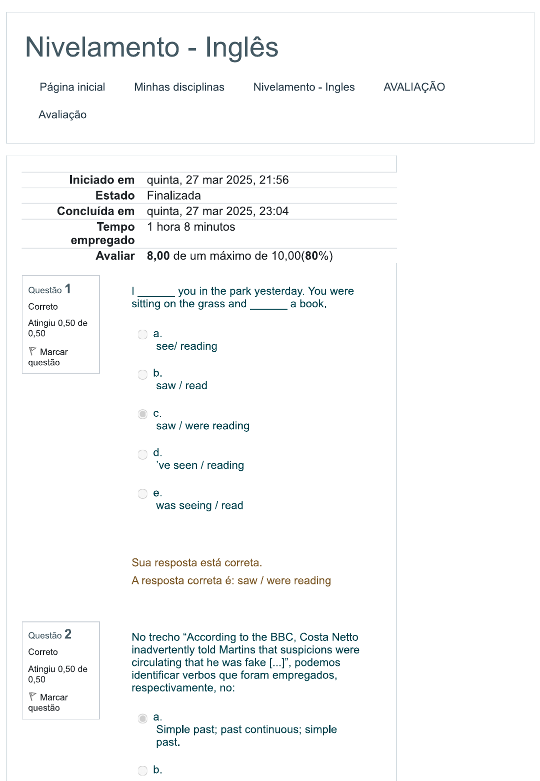 Nivelamento - Inglês Página inicial Minhas disciplinas Nivelamento - Ingles AVALIAÇÃO Avaliação Iniciado em quinta, 27 mar 2025, 21:56 Estado Finalizada Concluída em quinta, 27 mar 2025, 23:04 Tempo 1 hora 8 minutos empregado Avaliar 8,00 de um máximo de 10,00(80%) Questão 1 you in the park yesterday. You were Correto sitting on the grass and a book. Atingiu 0,50 de 0,50 a. Marcar see/ reading questão b. saw / read C. saw / were reading d. 've seen / reading e. was seeing / read Sua resposta está correta. A resposta correta é: saw / were reading Questão 2 No trecho "According to the BBC, Costa Netto Correto inadvertently told Martins that suspicions were circulating that he was fake [...]", podemos Atingiu 0,50 de 0,50 identificar verbos que foram empregados, respectivamente, no: Marcar questão a. Simple past; past continuous; simple past. b.Simple present; present continuous; present perfect. C. Simple future; past continuous; present perfect. d. Simple past; past perfect; present continuous. e. simple future; present continuous; simple past. Sua resposta está correta. A resposta correta é: Simple past; past continuous; simple past. Questão 3 Assinale a alternativa que completa as lacunas Correto a seguir. Atingiu 0,50 de She's trying to sell her apartment for 0,50 more than two years, but she hasn't Marcar buyers. questão a. Be - found b. Had - find C C. Been - found d. Been - finded e. Was - find Sua resposta está correta. A resposta correta é: Been - foundQuestão 4 Leia o texto. Correto "Cracolândia" drug addicts have already spread to more Atingiu 0,50 de than 20 different areas in São Paulo 0,50 I Five days after a police operation in Cracolândia Marcar (Crackland) in the center of São Paulo, drug addicts questão have spread to various parts of the region, such as Paulista avenue, as well as the space underneath the João Goulart 5 overpass, which is also known as the The officers from the GCM (the Metropolitan Civil Guard) have accompanied the movement of those who belonged to the "flow" (fluxo) - a term used to describe outdoor areas where people negotiate and consume Fonte: Folha de São Paulo - Internacional - 26/05/2017 GLOSSARY overpass = viaduto, elevado Os verbos "have spread" e "have accompanied", sublinhados no texto, estão no: a. simple past b. present continuous C. present perfect d. past continuous e. future tense Sua resposta está correta A resposta correta é: present perfect Questão 5 Leia a tirinha para responder à questão. Correto Atingiu 0,50 de 0,50 Marcar questãoI'VE DECIDED TO FOR EXAMPLE, YOU BECOME MORE KEEPING ME AGGRESSIVE IN WORKING RIGHT N BLAMING OTHERS FOR MY LACK OF SUCCESS. ; Acesso em: 23.02.2016. uso do Present Perfect, no primeiro quadrinho da tirinha (em I've decided), pode ser explicado por se tratar de uma ação: a. que ocorre uma única vez no presente. b. que se inicia no passado e termina no passado. C. ocorrida no passado, mas com um resultado importante no presente. d. ocorrida no passado, concluída em um momento bem definido ou explícito. e. que se inicia no presente e se estende até o futuro. Sua resposta está correta. A resposta correta é: ocorrida no passado, mas com um resultado importante no presente. Questão 6 As formas de infinitivo dos verbos "began", Correto "invented", "made", "enabled" and "showed" são, respectivamente: Atingiu 0,50 de 0,50 a. Marcar questão Begin - invent - made - enable - show b. Begun - invent - make - enable - showC. Began - invent - make - enable - show d. Begun - invented - make - enabled - showed e. Begin - invent - make - enable - show Sua resposta está correta. A resposta correta é: Begin - invent - make - enable - show Questão 7 Charles normally water, but now he Incorreto coke. Atingiu 0,00 de 0,50 a. drinks, was drinking. Marcar questão b. drinks; is drinking. C. is drinking; drinks. d. was drinking; drinks. e. drink; is drinking. Sua resposta está incorreta. A resposta correta é: was drinking; drinks. Questão 8 Assinale a alternativa que completa a lacuna. Correto Max ill for three weeks. Atingiu 0,50 de He's still in hospital. 0,50 Marcar a. questão wasb. had been C. has been d. were e. is Sua resposta está correta. A resposta correta é: has been Questão 9 Leia a tirinha. Incorreto The New Year had In spite of all that had He was still finally come happened, he knew he Atingiu 0,00 de had much to be a 0,50 thankful Marcar questão From: https://peanuts.fandom.com/wiki/January 1994 comic_strips tempo verbal do primeiro quadrinho é: a. past continuous. b. past perfect. C. simple past. d. present continuous. e. simple present.Sua resposta está incorreta. A resposta correta é: past perfect. Questão 10 Os tempos verbais em "...our " population was Correto growing faster, which suggested a more youthful and prosperous future... são, Atingiu 0,50 de 0,50 respectivamente: Marcar questão a. present perfect and simple present. b. simple present and present perfect. C. past continuous and past continuous d. past continuous and simple past. e. past perfect and simple past. Sua resposta está correta. A resposta correta é: past continuous and simple past. Questão 11 Assinale a alternativa em que o auxiliar Incorreto expressa uma permissão. Atingiu 0,00 de 0,50 a. Marcar [...] women experience more severe questão withdrawal symptoms than men when quitting smoking, which can make the act of quitting much harder and more uncomfortable for women. b. Todas as alternativas estão incorretas. C. They may get discouraged quickly and end their efforts prematurely. d. The difficulty of smoking cessation based on sex should not be discounted.e. Proper weight management, emotional and psychological support should also be applied to cessation efforts and can facilitate a smoke-free lifestyle long-term. Sua resposta está incorreta. A resposta correta é: Todas as alternativas estão incorretas. Questão 12 Leia o trecho de texto a seguir. Correto Can talking on 