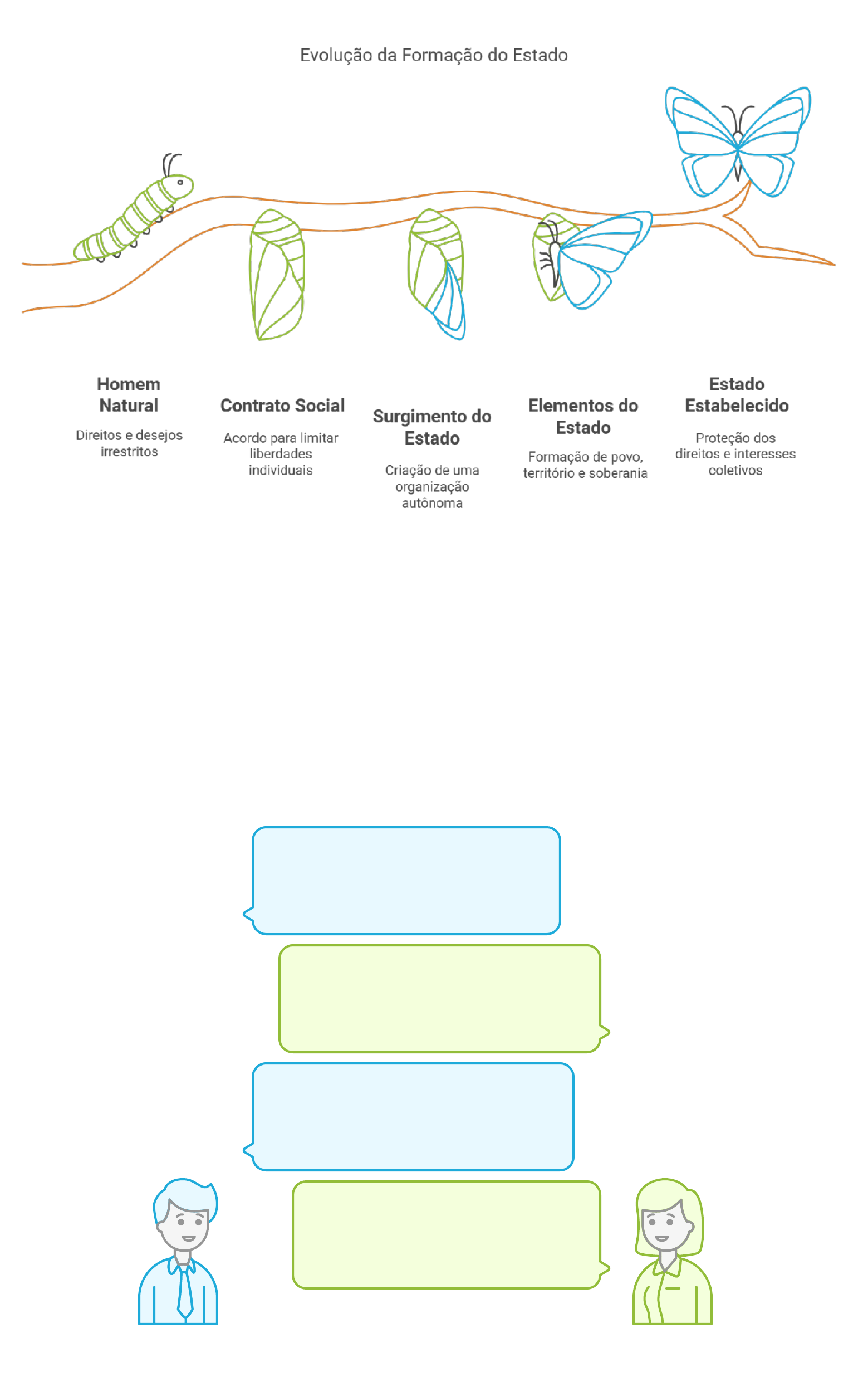 Teoria Geral do Estado: Origem, Formação e Elementos Parte 1: Origem, Formação e Elementos do Estado 1. Origem do Estado: O homem natural, em seu estado de natureza, não reconhecia limites para seus direitos e desejos. No entanto, à medida que a humanidade começou a dominar a natureza e a cultivar a terra, surgiram reflexões sobre direitos, especialmente o direito à vida e à liberdade. O homem natural não reconhecia limites para seus direitos e desejos. O que aconteceu à medida que a humanidade começou a dominar a natureza? O que o homem natural reconhecia em seu estado de natureza? Origem do Estado Surgiram reflexões sobre direitos, especialmente o direito à vida e à liberdade. 2. Contrato Social: Para proteger sua propriedade e direitos, o homem se viu obrigado a entrar em um acordo com outros homens livres e iguais. Esse contrato social implicava a delimitação de algumas liberdades individuais em prol da liberdade coletiva, sendo essencial para a sobrevivência da espécie humana. 3. Estado: A partir do contrato social, surge uma pessoa jurídica, uma organização autônoma responsável por administrar os interesses da sociedade. O Estado é legitimado por seus cidadãos e tem como objetivo primordial a proteção dos direitos e interesses coletivos. 4. Elementos do Estado: O Estado é composto por três elementos fundamentais: • Povo: Agrupamento de indivíduos unidos por laços históricos, culturais, étnicos e identitários. • Território: Espaço físico onde o povo reside e se organiza. • Soberania: Capacidade do povo de impor sua vontade através de uma instituição legitimada, exercendo poder interno e externo sem depender de outros países. A proteção dos direitos e interesses coletivos. Definição Estado Legitimação Objetivo O Estado é legitimado por seus cidadãos. Uma pessoa jurídica que surge do contrato social. Parte 2: Formas de Estado e Sistemas de Governo 1. Estado de Direito: Caracteriza-se pela observância das leis por todos os cidadãos, combatendo o autoritarismo e promovendo a igualdade. A lei é a base que regula as relações sociais. 2. Estado Social de Direito: Surge como uma resposta à frieza do Estado de Direito, intervindo proativamente para garantir direitos sociais básicos, como trabalho, educação e moradia. Agrupamento de indivíduos com identidade compartilhada. Autoridade para exercer poder de forma independente. Elementos do Estado Espaço físico onde a população reside. Povo Soberania Território Refere-se à importância de todos os cidadãos seguirem as leis. Combate ao autoritarismo Destaca a necessidade de igualdade entre os cidadãos. Enfatiza a luta contra regimes autoritários. Estado de Direito Observância das leis Promoção da igualdade 3. Estado Democrático de Direito: Reflete a demanda popular por participação nas decisões governamentais. Este modelo prioriza as liberdades civis e os direitos humanos, assegurando que o poder emane do povo 4. Poder do Povo: A soberania de um Estado Democrático de Direito é fundamentada na vontade do povo, que deve ser exercida para garantir seus direitos e interesses. As funções do Estado são organizadas em três poderes: Legislativo, Judiciário e Executivo. Foco nos direitos sociais Intervenção proativa Neutralidade governamental Foco na justiça Estado Social de Direito Estado de Direito Equilibrando Justiça e Bem-Estar na Governança Destaca a proteção das liberdades individuais e direitos humanos. Enfatiza que a autoridade deve vir da vontade popular. Estado Democrático de Direito Liberdades Civis Participação Popular Poder do Povo Refere-se à importância da inclusão da população nas decisões governamentais. 5. Forma de Estado: Refere-se à organização do povo e da soberania sobre o território. Pode ser: • Unitária: Unidade de poder sobre território e população. • Composta: Divisão de poderes em diferentes regiões. O Brasil adota a forma de Estado Federativa. 6. Forma de Governo: Diz respeito à estrutura do poder na sociedade, podendo ser: • Monarquia: Um governante vitalício, que pode ou não ser democrático. • República: Representantes eleitos periodicamente. O Brasil é uma República. Responsável por criar leis e representar a vontade do povo Poder Legislativo Poder Judiciário Poder Executivo Interpreta as leis e garante justiça Implementa e aplica as leis Estrutura do Poder do Estado Democrático Composta Divisão de poderes em diferentes regiões. Formas de Estado Unidade de poder sobre território e população. Unitária 7. Sistema de Governo: Define a relação entre o chefe de governo e o chefe de Estado. Os sistemas incluem: • Presidencialismo: O mesmo indivíduo exerce as funções de chefe de Estado e chefe de governo. • Parlamentarismo: O chefe de governo é o primeiro-ministro, enquanto a chefia de Estado é exercida por outra pessoa. O Brasil adota o sistema presidencialista. Visão Geral dos Sistemas de Governo PresidencialismoParlamentarismo O primeiro- ministro governa enquanto outra pessoa é chefe de Estado O presidente atua como chefe de Estado e governo Brasil é uma RepúblicaDemocrática ou Não Governante Vitalício Representantes Eleitos Estruturas de Governo: Monarquia e República Forma de Governo Monarquia República