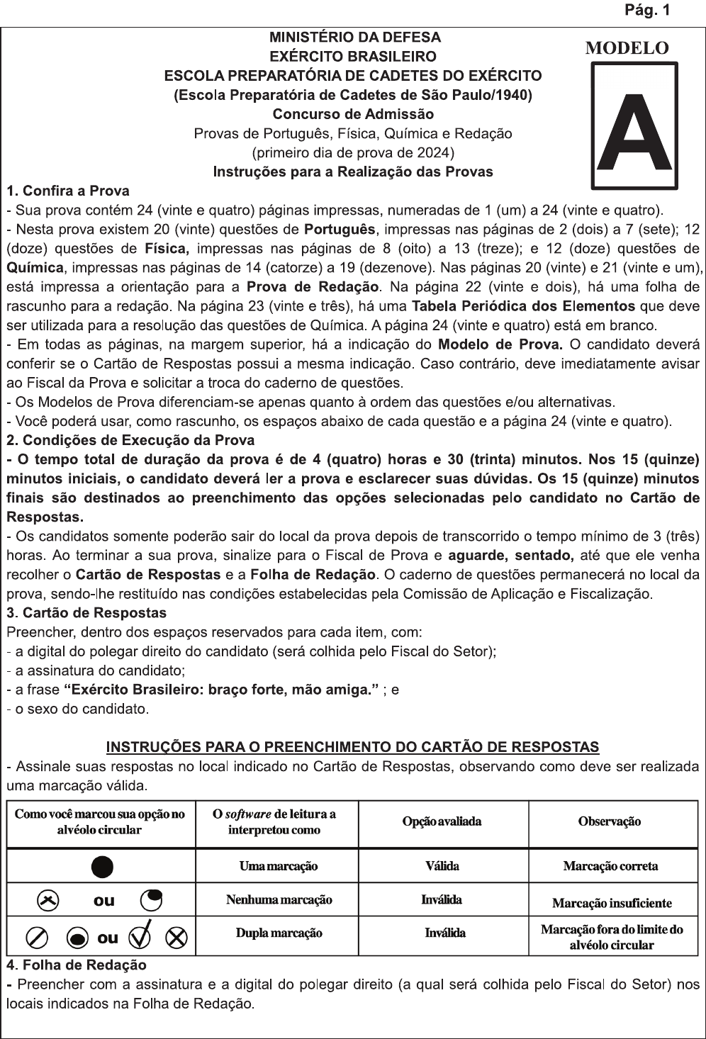 Pág. 1 MINISTÉRIO DA DEFESA EXÉRCITO BRASILEIRO MODELO ESCOLA PREPARATÓRIA DE CADETES DO EXÉRCITO (Escola Preparatória de Cadetes de São Paulo/1940) Concurso de Admissão Provas de Português, Física, Química e Redação (primeiro dia de prova de 2024) A Instruções para a Realização das Provas 1. Confira a Prova Sua prova contém 24 (vinte e quatro) páginas impressas, numeradas de 1 (um) a 24 (vinte e quatro). Nesta prova existem 20 (vinte) questões de Português, impressas nas páginas de 2 (dois) a 7 (sete); 12 (doze) questões de Física, impressas nas páginas de 8 (oito) a 13 (treze); e 12 (doze) questões de Química, impressas nas páginas de 14 (catorze) a 19 (dezenove). Nas páginas 20 (vinte) e 21 (vinte e um), está impressa a orientação para a Prova de Redação. Na página 22 (vinte e dois), há uma folha de rascunho para a redação. Na página 23 (vinte e três), há uma Tabela Periódica dos Elementos que deve ser utilizada para a resolução das questões de Química. A página 24 (vinte e quatro) está em branco. Em todas as páginas, na margem superior, há a indicação do Modelo de Prova. candidato deverá conferir se o Cartão de Respostas possui a mesma indicação. Caso contrário, deve imediatamente avisar ao Fiscal da Prova e solicitar a troca do caderno de questões. Os Modelos de Prova diferenciam-se apenas quanto à ordem das questões e/ou alternativas. Você poderá usar, como rascunho, os espaços abaixo de cada questão e a página 24 (vinte e quatro). 2. Condições de Execução da Prova o tempo total de duração da prova é de 4 (quatro) horas e 30 (trinta) minutos. Nos 15 (quinze) minutos iniciais, o candidato deverá ler a prova e esclarecer suas dúvidas. Os 15 (quinze) minutos finais são destinados ao preenchimento das opções selecionadas pelo candidato no Cartão de Respostas. Os candidatos somente poderão sair do local da prova depois de transcorrido o tempo mínimo de 3 (três) horas. Ao terminar a sua prova, sinalize para o Fiscal de Prova e aguarde, sentado, até que ele venha recolher o Cartão de Respostas e a Folha de Redação. caderno de questões permanecerá no local da prova, sendo-lhe restituído nas condições estabelecidas pela Comissão de Aplicação e Fiscalização. 3. Cartão de Respostas Preencher, dentro dos espaços reservados para cada item, com: a digital do polegar direito do candidato (será colhida pelo Fiscal do Setor); a assinatura do candidato; a frase "Exército Brasileiro: braço forte, mão amiga." e o sexo do candidato. INSTRUÇÕES PARA o PREENCHIMENTO DO CARTÃO DE RESPOSTAS Assinale suas respostas no local indicado no Cartão de Respostas, observando como deve ser realizada uma marcação válida. Como você marcou sua opção no o software de leitura a Opção avaliada Observação alvéolo circular interpretou como Umamarcação Válida Marcação correta ou Nenhumamarcação Inválida Marcação insuficiente ou Dupla marcação Inválida Marcação fora do limite do alvéolo circular 4. Folha de Redação Preencher com a assinatura e a digital do polegar direito (a qual será colhida pelo Fiscal do Setor) nos locais indicados na Folha de Redação.Pág. 2 Provas de Português, Física, Química e Redação Modelo A PROVA DE PORTUGUÊS Escolha a única alternativa correta, dentre as opções apresentadas, que responde ou completa cada questão, assinalando-a, com caneta esferográfica de tinta azul ou preta, no Cartão de Respostas. Após a leitura atenta do texto apresentado a seguir, responda às questões propostas. No princípio eram as árvores Os livros são filhos das árvores, que foram o primeiro lar da nossa espécie e, talvez, o mais antigo receptáculo das palavras escritas. A etimologia da palavra contém um velho relato sobre os primórdios. Em latim, liber, que significa "livro", originariamente dava nome à casca da árvore ou, mais exatamente, à película fibrosa que separa a casca da madeira do tronco. Plínio, o Velho, afirma que os romanos escreviam em cascas de árvore antes de conhecer os rolos egípcios. Durante muitos séculos, diversos materiais o papiro, o pergaminho ocuparam o lugar daquelas antigas páginas de madeira, mas, numa viagem de ida e volta, com adoção do papel, os livros voltaram a nascer das árvores. Como eu já expliquei, os gregos chamavam o livro de biblíon, rememorando a cidade fenícia de Biblos, famosa pela exportação de papiro. Atualmente o emprego dessa palavra, em sua evolução, ficou reduzido ao título de uma única obra, a Bíblia. Para os romanos, liber não evocava cidades nem rotas comerciais, mas o mistério do bosque onde seus antepassados começaram a escrever, em meio aos sussurros do vento nas folhas. Os nomes germânicos book, Buch, boek também descendem de uma palavra arbórea: a faia de tronco esbranquiçado. Em latim, o termo que significa "livro" tem quase o mesmo som que o adjetivo que significa "livre", embora as raízes indo-europeias de ambos os vocábulos tenham origens diferentes. Muitas línguas neolatinas, como o espanhol, o francês, o italiano e o herdaram a coincidência dessa semelhança fonética, que convida ao jogo de palavras, identificando leitura e liberdade. Para os iluministas de todas as épocas, são duas que sempre acabam confluindo. Hoje aprendemos a escrever com luz sobre telas de cristal líquido ou de plasma, mas ainda ouvimos o chamado originário das árvores. Em suas cascas redigimos um disperso inventário amoroso da humanidade. Antonio Machado, em seus passeios pelos Campos de Castela, costumava parar junto ao rio para ler algumas linhas desse livro dos amantes: Voltei a ver os álamos dourados, álamos do caminho na ribeira do Douro, entre San Polo e San Saturio, atrás das muralhas velhas de Soria [...]. Estes choupos do rio, que acompanham com o som de suas folhas secas o som da água, quando o vento sopra, têm em suas cascas gravadas iniciais que são nomes de apaixonados, nú