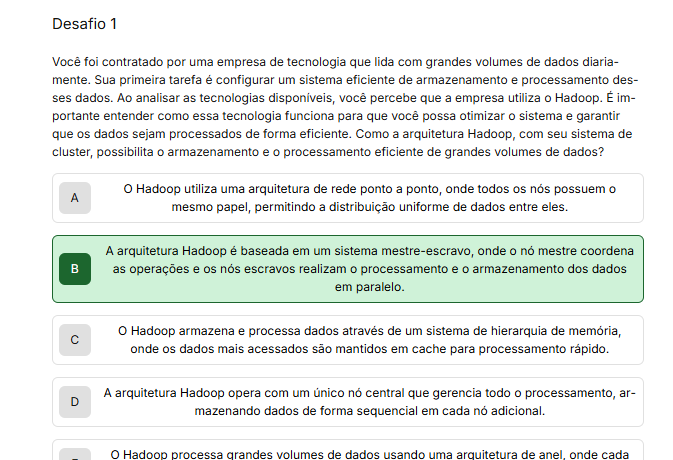 Desafio 1 Você foi contratado por uma empresa de tecnologia que lida com grandes volumes de dados diaria- mente. Sua primeira tarefa é configurar um sistema eficiente de armazenamento e processamento des- ses Ao analisar as tecnologias disponíveis, você percebe que a empresa utiliza Hadoop. É im- portante entender como essa tecnologia funciona para que você possa otimizar sistema e garantir que os dados sejam processados de forma eficiente. Como a arquitetura Hadoop, com seu sistema de cluster, possibilita armazenamento e processamento eficiente de grandes volumes de dados? O Hadoop utiliza uma arquitetura de rede ponto a ponto, onde todos os nós possuem A mesmo papel, permitindo a distribuição uniforme de dados entre eles. A arquitetura Hadoop é baseada em um sistema mestre-escravo, onde nó mestre coordena B as operações e os nós escravos realizam processamento e armazenamento dos dados em paralelo. o Hadoop armazena e processa dados através de um sistema de hierarquia de memória, C onde os dados mais acessados são mantidos em cache para processamento rápido A arquitetura Hadoop opera com um único nó central que gerencia todo processamento, ar- D mazenando dados de forma sequencial em cada adicional. Hadoop processa grandes volumes de dados usando uma arquitetura de anel, onde cada