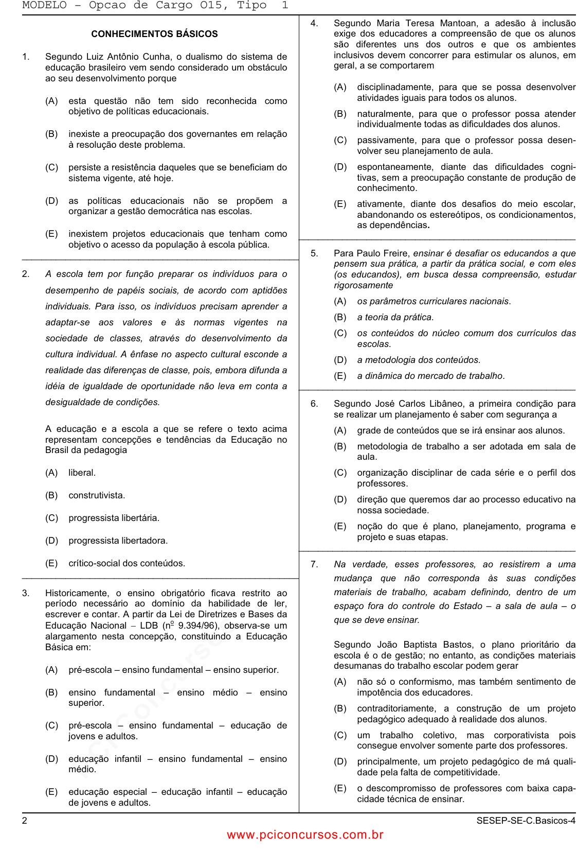 pcimarkpci MjgwNDowMjE0Ojg4ZTE6NjdkZTphNGFkOmVmZmY6ZmU1YjozNDQ3:VGh1LCAyNyBNYXIgMjAyNSAwMDoxNjoxNiAtMDMwMA== www.pciconcursos.com.br 27/11/03 - 08:35 2 SESEP-SE-C.Basicos-4 CONHECIMENTOS BÁSICOS 1. Segundo Luiz Antônio Cunha, o dualismo do sistema de educação brasileiro vem sendo considerado um obstáculo ao seu desenvolvimento porque (A) esta questão não tem sido reconhecida como objetivo de políticas educacionais. (B) inexiste a preocupação dos governantes em relação à resolução deste problema. (C)) persiste a resistência daqueles que se beneficiam do sistema vigente, até hoje. (D) as políticas educacionais não se propõem a organizar a gestão democrática nas escolas. (E) inexistem projetos educacionais que tenham como objetivo o acesso da população à escola pública. _________________________________________________________ 2. A escola tem por função preparar os indivíduos para o desempenho de papéis sociais, de acordo com aptidões individuais. Para isso, os indivíduos precisam aprender a adaptar-se aos valores e às normas vigentes na sociedade de classes, através do desenvolvimento da cultura individual. A ênfase no aspecto cultural esconde a realidade das diferenças de classe, pois, embora difunda a idéia de igualdade de oportunidade não leva em conta a desigualdade de condições. A educação e a escola a que se refere o texto acima representam concepções e tendências da Educação no Brasil da pedagogia (A)) liberal. (B) construtivista. (C) progressista libertária. (D) progressista libertadora. (E) crítico-social dos conteúdos. _________________________________________________________ 3. Historicamente, o ensino obrigatório ficava restrito ao período necessário ao domínio da habilidade de ler, escrever e contar. A partir da Lei de Diretrizes e Bases da Educação Nacional � LDB (no 9.394/96), observa-se um alargamento nesta concepção, constituindo a Educação Básica em: (A) pré-escola – ensino fundamental – ensino superior. (B) ensino fundamental – ensino médio – ensino superior. (C) pré-escola – ensino fundamental – educação de jovens e adultos. (D)) educação infantil – ensino fundamental – ensino médio. (E) educação especial – educação infantil – educação de jovens e adultos. 4. Segundo Maria Teresa Mantoan, a adesão à inclusão exige dos educadores a compreensão de que os alunos são diferentes uns dos outros e que os ambientes inclusivos devem concorrer para estimular os alunos, em geral, a se comportarem (A) disciplinadamente, para que se possa desenvolver atividades iguais para todos os alunos. (B) naturalmente, para que o professor possa atender individualmente todas as dificuldades dos alunos. (C) passivamente, para que o professor possa desen- volver seu planejamento de aula. (D) espontaneamente, diante das dificuldades cogni- tivas, sem a preocupação constante de produção de conhecimento. (E)) ativamente, diante dos desafios do meio escolar, abandonando os estereótipos, os condicionamentos, as dependências. _________________________________________________________ 5. Para Paulo Freire, ensinar é desafiar os educandos a que pensem sua prática, a partir da prática social, e com eles (os educandos), em busca dessa compreensão, estudar rigorosamente (A) os parâmetros curriculares nacionais. (B)) a teoria da prática. (C) os conteúdos do núcleo comum dos currículos das escolas. (D) a metodologia dos conteúdos. (E) a dinâmica do mercado de trabalho. _________________________________________________________ 6. Segundo José Carlos Libâneo, a primeira condição para se realizar um planejamento é saber com segurança a (A) grade de conteúdos que se irá ensinar aos alunos. (B) metodologia de trabalho a ser adotada em sala de aula. (C) organização disciplinar de cada série e o perfil dos professores. (D)) direção que queremos dar ao processo educativo na nossa sociedade. (E) noção do que é plano, planejamento, programa e projeto e suas etapas. _________________________________________________________ 7. Na verdade, esses professores, ao resistirem a uma mudança que não corresponda às suas condições materiais de trabalho, acabam definindo, dentro de um espaço fora do controle do Estado – a sala de aula – o que se deve ensinar. Segundo João Baptista Bastos, o plano prioritário da escola é o de gestão; no entanto, as condições materiais desumanas do trabalho escolar podem gerar (A)) não só o conformismo, mas também sentimento de impotência dos educadores. (B) contraditoriamente, a construção de um projeto pedagógico adequado à realidade dos alunos. (C) um trabalho coletivo, mas corporativista pois consegue envolver somente parte dos professores. (D) principalmente, um projeto pedagógico de má quali- dade pela falta de competitividade. (E) o descompromisso de professores com baixa capa- cidade técnica de ensinar. MODELO − Opcao de Cargo O15, Tipo 1 www.pciconcursos.com.br pcimarkpci MjgwNDowMjE0Ojg4ZTE6NjdkZTphNGFkOmVmZmY6ZmU1YjozNDQ3:VGh1LCAyNyBNYXIgMjAyNSAwMDoxNjoxNiAtMDMwMA== www.pciconcursos.com.br 27/11/03 - 08:35 SESEP-SE-C.Basicos-4 3 8. A valorização dos profissionais da educação, através da garantia de "aperfeiçoamento profissional continuado, inclusive com licenciamento periódico remunerado para este fim"; de "período reservado a estudos, planejamento e avaliação, incluído na carga de trabalho", bem como de "condições adequadas de trabalho", dentre outros aspectos, está prevista (A) na Constituição Federal/1988. (B) na Constituição Estadual de Sergipe. (C)) na Lei de Diretrizes e Bases da Educação Nacional (LDB - no 9.394/96). (D) na Emenda Constitucional no 14/96. (E) no Estatuto da Criança e do Adolescente (ECA). _________________________________________________________ 9. “Algumas vezes se abandona a escala de 6 a 10 ou de A a E ou deixa-se de utilizar conceitos como ‘ótimo’, ‘bom’ ou ‘regular