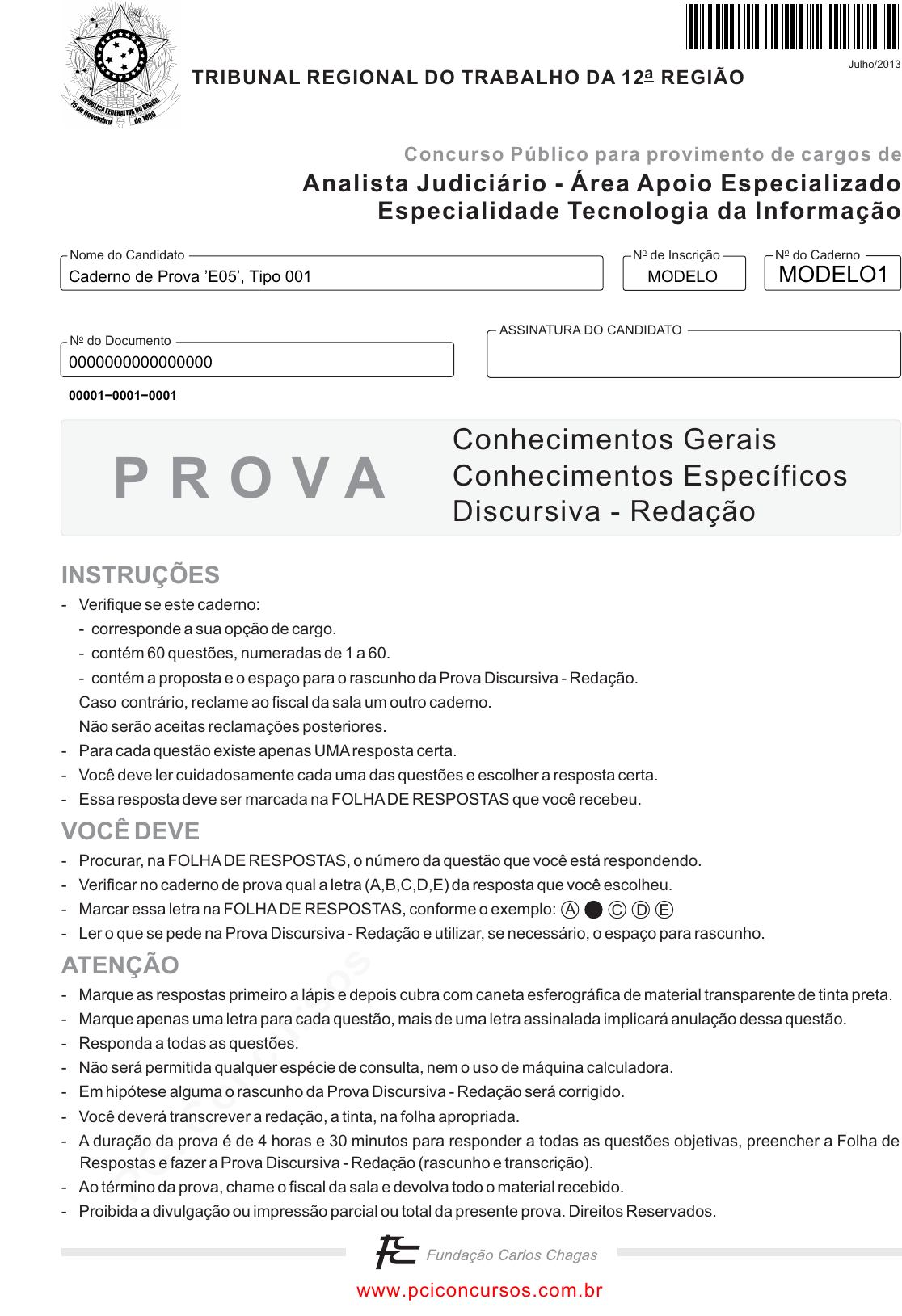 Caderno de Prova ’E05’, Tipo 001 MODELO