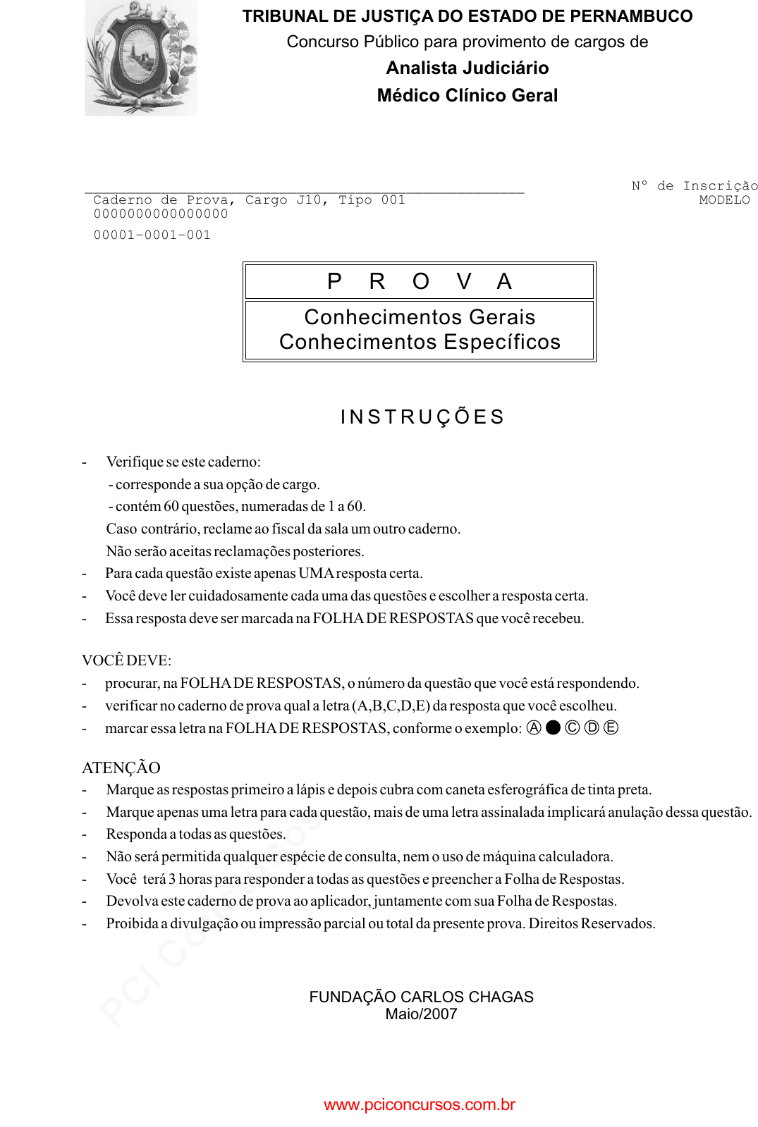 pcimarkpci MDAwMDowMDAwOjAwMDA6MDAwMDowMDAwOmZmZmY6YjViZjozZTlj:U2F0LCAyMiBNYXIgMjAyNSAyMDowNTowMCAtMDMwMA== www.pciconcursos.com.br TRIBUNAL DE JUSTIÇA DO ESTADO DE PERNAMBUCO Concurso Público para provimento de cargos de Analista Judiciário Médico Clínico Geral Conhecimentos Gerais Conhecimentos Específicos I N S T R U Ç Õ E S P R O V A - Verifique se este caderno: - corresponde a sua opção de cargo. - contém 60 questões, numeradas de 1 a 60. Caso contrário, reclame ao fiscal da sala um outro caderno. Não serão aceitas reclamações posteriores. - Para cada questão existe apenas UMAresposta certa. - Você deve ler cuidadosamente cada uma das questões e escolher a resposta certa. - Essa resposta deve ser marcada na FOLHADE RESPOSTAS que você recebeu. VOCÊ DEVE: - procurar, na FOLHADE RESPOSTAS, o número da questão que você está respondendo. - verificar no caderno de prova qual a letra (A,B,C,D,E) da resposta que você escolheu. - marcar essa letra na FOLHADE RESPOSTAS, conforme o exemplo: - Marque as respostas primeiro a lápis e depois cubra com caneta esferográfica de tinta preta. - Marque apenas uma letra para cada questão, mais de uma letra assinalada implicará anulação dessa questão. - Responda a todas as questões. - Não será permitida qualquer espécie de consulta, nem o uso de máquina calculadora. - Você terá 3 horas para responder a todas as questões e preencher a Folha de Respostas. - Devolva este caderno de prova ao aplicador, juntamente com sua Folha de Respostas. - Proibida a divulgação ou impressão parcial ou total da presente prova. Direitos Reservados. ATENÇÃO A C D E FUNDAÇÃO CARLOS CHAGAS Maio/2007 ____________________________________________________ Caderno de Prova, Cargo J10, Tipo 001 0000000000000000 00001−0001−001 Nº de Inscrição MODELO www.pciconcursos.com.br pcimarkpci MDAwMDowMDAwOjAwMDA6MDAwMDowMDAwOmZmZmY6YjViZjozZTlj:U2F0LCAyMiBNYXIgMjAyNSAyMDowNTowMCAtMDMwMA== www.pciconcursos.com.br 2 TJUPE-Conhecimentos Gerais3 CONHECIMENTOS GERAIS LÍNGUA PORTUGUESA Atenção: As questões de números 1 a 15 referem-se ao texto abaixo: Cuidado: o uso desse aparelho pode produzir violência A revista Science publicou, em 2002, o relatório de uma pesquisa coordenada por Jeffrey Johnson, da Universidade de Colúmbia, em Nova York. O estudo mostra uma relação significativa entre o comportamento violento e o número de horas que um sujeito (adolescente ou jovem adulto) passa assistindo à TV. Pela pesquisa de Johnson, os televisores deveriam ser comercializados com um aviso, como os maços de cigarros: cuidado, a exposição prolongada à tela desse aparelho pode produzir violência. Estranho? Nem tanto. É bem provável que a fonte de muita violência moderna seja nossa insubordinação básica: ninguém quer ser ou continuar sendo quem é. Podemos procla- mar nossa nostalgia de tempos mais resignados, mas duvido que queiramos ou possamos renunciar à divisão constante entre o que somos e o que gostaríamos de ser. Para alimentar nossa insatisfação, inventamos a litera- tura e, mais tarde, o cinema. Mas a invenção mais astuciosa talvez tenha sido a televisão. Graças a ela, instalamos em nossas salas uma janela sobre o devaneio, que pode ser aberta a qualquer instante e sem esforço. Pouco importa que fiquemos no zapping (*) ou que paremos para sonhar em ser policiais, gângsteres ou apenas nós mesmos (um pouco piores) no Big brother. A TV confirma uma idéia que está sempre conosco: existe outra dimensão, e nossas quatro paredes são uma jaula. A pesquisa de Johnson constata que, à força de olhar, podemos ficar a fim de sacudir as barras além do permitido. Faz sentido. (*) zapping = uso contínuo do controle remoto. (Contardo Calligaris, Terra de ninguém) 1. Em relação à pesquisa coordenada por Jeffrey Johnson, o autor do texto manifesta (A) sua inteira estranheza, uma vez que tem convicções diametralmente opostas às do pesquisador. (B) sua inteira concordância, detalhando todos os ele- mentos da pesquisa e colando-se à argumentação dela. (C) o acolhimento da conclusão geral da pesquisa, mas não deixa de trilhar um caminho reflexivo pessoal sobre o fenômeno observado. (D) sua parcial concordância, pois julga que o pesquisa- dor se valeu de uma argumentação bastante es- tranha, nem sempre coerente. (E) sua plena discordância, uma vez que não vê qual- quer relação entre assistir à TV e as eventuais ati- tudes de violência do público televisivo. 2. Considere as afirmações abaixo. I. Na pesquisa de Jeffrey Johnson, ficou claro que é um exagero estabelecer uma relação de causa e efeito entre a exposição prolongada a programas de TV e atitudes de violência. II. De acordo com o autor do texto, a literatura e o cinema já estimulavam, antes do surgimento da TV, os mesmos níveis de violência social. III. O autor do texto defende a idéia de que a mídia pode estimular ações de violência que são geradas por nossa insatisfação com nós mesmos. É correto o que se afirma em (A) I, II e III. (B) I e II, apenas. (C) II e III, apenas. (D) II, apenas. (E) III, apenas. _________________________________________________________ 3. Considerando-se o contexto, traduz-se corretamente o sentido de uma expressão do texto em: (A) exposição prolongada = exibição intermitente. (B) nostalgia de tempos mais resignados = remorsos por antigas submissões. (C) uma janela sobre o devaneio = uma refração da realidade. (D) renunciar à divisão constante = recusar o freqüente desacordo íntimo. (E) sacudir as barras além do permitido = ratificar os limites inaceitáveis. _________________________________________________________ 4. Preserva-se plenamente a concordância verbal na frase: (A) Caberia comercializar-se os televisores com uma advertência expressa sobre o perigo que representa as exposições contínuas à tela de uma TV. (B) Boa parte dos atos de violência provém, de acordo com a pe