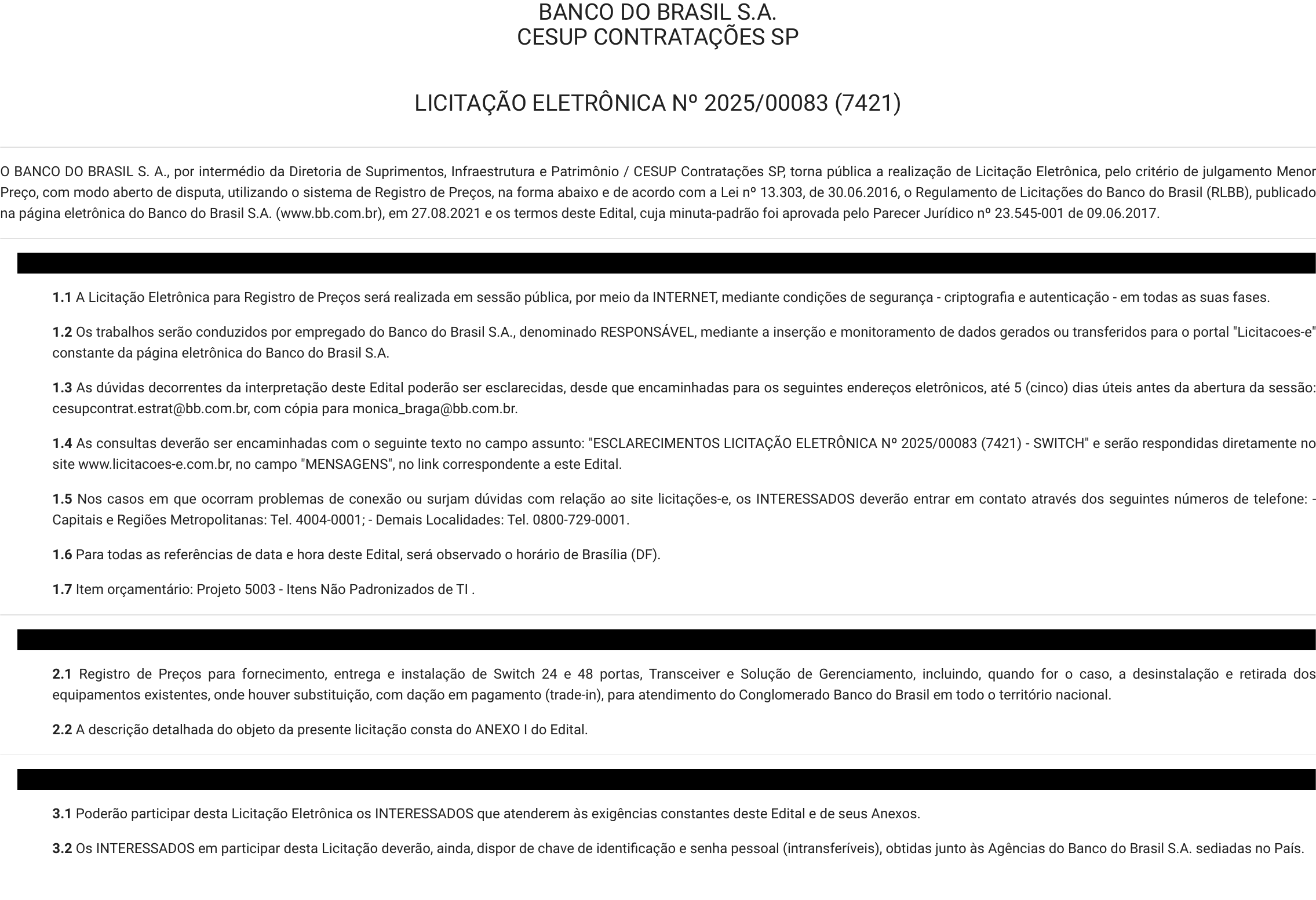 BANCO DO BRASIL S.A. CESUP CONTRATAÇÕES SP LICITAÇÃO ELETRÔNICA Nº 2025/00083 (7421) O BANCO DO BRASIL S. A., por intermédio da Diretoria de Suprimentos, Infraestrutura e Patrimônio / CESUP Contratações SP, torna pública a realização de Licitação Eletrônica, pelo critério de julgamento Menor Preço, com modo aberto de disputa, utilizando o sistema de Registro de Preços, na forma abaixo e de acordo com a Lei nº 13.303, de 30.06.2016, o Regulamento de Licitações do Banco do Brasil (RLBB), publicado na página eletrônica do Banco do Brasil S.A. (www.bb.com.br), em 27.08.2021 e os termos deste Edital, cuja minuta-padrão foi aprovada pelo Parecer Jurídico nº 23.545-001 de 09.06.2017. 1 DISPOSIÇÕES PRELIMINARES 1.1 A Licitação Eletrônica para Registro de Preços será realizada em sessão pública, por meio da INTERNET, mediante condições de segurança - criptografia e autenticação - em todas as suas fases. 1.2 Os trabalhos serão conduzidos por empregado do Banco do Brasil S.A., denominado RESPONSÁVEL, mediante a inserção e monitoramento de dados gerados ou transferidos para o portal "Licitacoes-e" constante da página eletrônica do Banco do Brasil S.A. 1.3 As dúvidas decorrentes da interpretação deste Edital poderão ser esclarecidas, desde que encaminhadas para os seguintes endereços eletrônicos, até 5 (cinco) dias úteis antes da abertura da sessão: cesupcontrat.estrat@bb.com.br, com cópia para monica_braga@bb.com.br. 1.4 As consultas deverão ser encaminhadas com o seguinte texto no campo assunto: "ESCLARECIMENTOS LICITAÇÃO ELETRÔNICA Nº 2025/00083 (7421) - SWITCH" e serão respondidas diretamente no site www.licitacoes-e.com.br, no campo "MENSAGENS", no link correspondente a este Edital. 1.5 Nos casos em que ocorram problemas de conexão ou surjam dúvidas com relação ao site licitações-e, os INTERESSADOS deverão entrar em contato através dos seguintes números de telefone: - Capitais e Regiões Metropolitanas: Tel. 4004-0001; - Demais Localidades: Tel. 0800-729-0001. 1.6 Para todas as referências de data e hora deste Edital, será observado o horário de Brasília (DF). 1.7 Item orçamentário: Projeto 5003 - Itens Não Padronizados de TI . 2 OBJETO 2.1 Registro de Preços para fornecimento, entrega e instalação de Switch 24 e 48 portas, Transceiver e Solução de Gerenciamento, incluindo, quando for o caso, a desinstalação e retirada dos equipamentos existentes, onde houver substituição, com dação em pagamento (trade-in), para atendimento do Conglomerado Banco do Brasil em todo o território nacional. 2.2 A descrição detalhada do objeto da presente licitação consta do ANEXO I do Edital. 3 PARTICIPAÇÃO NA LICITAÇÃO 3.1 Poderão participar desta Licitação Eletrônica os INTERESSADOS que atenderem às exigências constantes deste Edital e de seus Anexos. 3.2 Os INTERESSADOS em participar desta Licitação deverão, ainda, dispor de chave de identificação e senha pessoal (intransferíveis), obtidas junto às Agências do Banco do Brasil S.A. sediadas no País. 28/03/2025, 16:47 about:blank about:blank 1/23 3.2.1 As instruções para obtenção da chave e senha de acesso estão disponíveis na Cartilha do Fornecedor, disponível no endereço: http://www.licitacoes- e.com.br/aop/documentos/CartilhaFornecedor.pdf 3.2.2 As pessoas jurídicas ou firmas individuais deverão credenciar representantes, mediante a apresentação de procuração por instrumento público ou particular, nos moldes do ANEXO V, com firma reconhecida, atribuindo poderes para formular lances de preços e praticar todos os demais atos e operações no "Licitacoes-e". 3.2.2.1 No caso de instrumento particular, deverá ser comprovada a capacidade de o signatário nomear procurador, mediante apresentação de cópia do estatuto ou contrato social em vigor, e, quando se tratar de sociedade anônima, da ata de nomeação do signatário. 3.3 O credenciamento do INTERESSADO e de seu representante legal junto ao sistema eletrônico implica a responsabilidade legal pelos atos praticados e a presunção de capacidade técnica para realização das transações inerentes à licitação. 3.4 Em se tratando de microempresa ou empresa de pequeno porte, nos termos da Lei Complementar nº 123, de 14.12.2006 e do Decreto nº 8.538, de 06.10.2015 e para que essas possam usufruir do tratamento diferenciado previsto no Capítulo V da referida Lei, é necessário, à época do credenciamento, a declaração em campo próprio do sistema eletrônico, identificando-se como microempresa ou empresa de pequeno porte. 3.4.1 Ao credenciarem-se como ME ou EPP no sistema do Banco, os INTERESSADOS declaram, sob as penas da lei, que cumprem os requisitos legais para a qualificação como tal, estando aptos a usufruir do tratamento favorecido estabelecido nos Art. 42 a 49 da Lei Complementar nº 123/2006. 3.5 O INTERESSADO, na condição de ME ou EPP, optante pelo Simples Nacional, deverá avaliar se o objeto da presente licitação se enquadra em uma das vedações citadas nos incisos do art. 17 da lei Complementar nº 123/2006 e não se encontra ressalvado dentre as exceções previstas no parágrafo primeiro do citado artigo. 3.5.1 Constatando a vedação, não poderá beneficiar-se dessa opção e a proposta apresentada não deverá contemplar os benefícios tributários do regime diferenciado. 3.5.2 Caso venha a ser contratado, estará sujeito a retenção na fonte de tributos e contribuições sociais, na forma da legislação em vigor, independentemente de a proposta, indevidamente, contemplar os benefícios tributários do regime diferenciado, obrigando-se, ainda, a apresentar ao Banco a solicitação de exclusão do referido regime, protocolada junto à Receita Federal. 3.6 Será permitida a participação de pessoas jurídicas organizadas em consórcio comprovado por meio de compromisso público ou particular subscrito pelos consorciados, com indicação do consorciado r