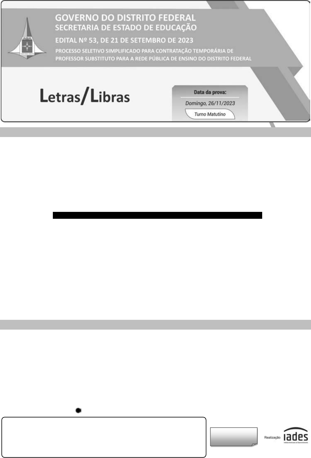 PROVA APLIC ADA Tipo “U” I N S T R U Ç Õ E S • Você recebeu do fiscal: o um caderno da prova objetiva contendo 120 (cento e vinte) itens – cada um deve ser julgado como CERTO ou ERRADO, de acordo com o(s) comando(s) a que se refere –; e o uma folha de respostas personalizada. • Verifique se a numeração dos itens, a paginação do caderno da prova objetiva e a codificação da folha de respostas estão corretas. • Verifique se o componente curricular selecionado por você está explicitamente indicado nesta capa. • Quando autorizado pelo fiscal do IADES, no momento da identificação, escreva, no espaço apropriado da folha de respostas, com a sua caligrafia usual, a seguinte frase: A confiança em si mesmo é o primeiro segredo do sucesso. • Você dispõe de 3 (três) horas e 30 (trinta) minutos para fazer a prova objetiva, devendo controlar o tempo, pois não haverá prorrogação desse prazo. Esse tempo inclui a marcação da folha de respostas. • Somente 1 (uma) hora após o início da prova, você poderá entregar sua folha de respostas e o caderno da prova e retirar-se da sala. • O candidato somente poderá retirar-se do local de aplicação da prova, levando o caderno da prova objetiva quando faltarem 52 (cinquenta e dois) minutos para o final do tempo destinado à realização da prova. • Deixe sobre a carteira apenas o documento de identidade e a caneta esferográfica de tinta preta, fabricada com material transparente. • Não é permitida a utilização de nenhum tipo de aparelho eletrônico ou de comunicação. • Não é permitida a consulta a livros, dicionários, apontamentos e (ou) apostilas. • Você somente poderá sair e retornar à sala de aplicação da prova na companhia de um fiscal do IADES. • Não será permitida a utilização de lápis em nenhuma etapa da prova. I NS T RUÇ Õ ES P A RA A P ROVA O B J ET I VA • Verifique se os seus dados estão corretos na folha de respostas da prova objetiva. Caso haja algum dado incorreto, comunique ao fiscal. • Leia atentamente cada item e assinale sua resposta na folha de respostas. • A folha de respostas não pode ser dobrada, amassada, rasurada ou manchada e nem pode conter registro fora dos locais destinados às respostas. • O candidato deverá transcrever, com caneta esferográfica de tinta preta, fabricada com material transparente, as respostas da prova objetiva para a folha de respostas. • A maneira correta de assinalar a alternativa na folha de respostas é cobrir, fortemente, com caneta esferográfica de tinta preta, fabricada com material transparente, o espaço a ela correspondente. • Marque as respostas assim: PROVA APLIC ADA PROCESSO SELETIVO SIMPLIFICADO – SEEDF PROFESSOR SUBSTITUTO TEMPORÁRIO LETRAS/LIBRAS TIPO “U” PÁGINA 2/11 P R O V A O B J E T I V A CONHECIMENTOS BÁSICOS Itens de 1 a 40 1 4 7 10 12 Há escolas que são gaiolas e há escolas que são asas. Escolas que são gaiolas existem para que os pássaros desaprendam a arte do voo. Pássaros engaiolados são pássaros sob controle. Engaiolados, o seu dono pode levá-los para onde quiser. Pássaros engaiolados sempre têm um dono. Deixaram de ser pássaros. Porque a essência dos pássaros é o voo. Escolas que são asas não amam pássaros engaiolados. O que elas amam são pássaros em voo. Existem para dar aos pássaros coragem para voar. Ensinar o voo, isso elas não podem fazer, porque o voo já nasce dentro dos pássaros. O voo não pode ser ensinado. Só pode ser encorajado. ALVES, Rubem. In: Por uma educação romântica. 8. ed. Campinas: Papirus, 2009, p. 29-32. Com base nas informações do texto e nos recursos responsáveis pelas relações entre elas, julgue (C ou E) os itens a seguir. 1. Segundo o autor, as escolas que são gaiolas contribuem para que os pássaros desaprendam a arte do voo, enquanto as escolas que são asas ensinam os pássaros a voar. 2. No período composto “Escolas que são gaiolas existem para que os pássaros desaprendam a arte do voo” (linhas 2 e 3), o pronome relativo “que” retoma o termo “Escolas” e a locução “para que” introduz ideia de finalidade em relação à oração anterior. 3. No período “Existem para dar aos pássaros coragem para voar.” (linha 9), o termo sublinhado poderia, sem comprometer a relação de sentido original, ser substituído pelo pronome lhes. 4. Para representar os tipos de escola e as diferenças entre eles, o autor utiliza-se da metáfora e da antítese. Professor e estudantes criam jornal digital 1 4 7 10 11 A busca por diferentes práticas que conquistem a dedicação dos estudantes levou o professor Eduardo Alves e a sua turma ao mundo das notícias: juntos, criaram o CEMTN News, um jornal veiculado na internet com notícias e opiniões produzidas na escola. O nome do jornal digital é uma referência à própria escola, já que a turma estuda no Centro de Ensino Médio de Taguatinga Norte (CEMTN). A plataforma virou um meio de expressão dos estudantes. Lá, diferentes temas são trabalhados, e o professor regente estimula o respeito social. CRUZ, Íris. Disponível em: . Acesso em: 19 out. 2023, com adaptações. Considerando as informações do texto e as questões morfossintáticas que o constituem, julgue (C ou E) os itens a seguir. 5. A redação Afim de encontrarem práticas diferentes que motivassem a dedicação dos alunos, o professor Eduardo Alves e a sua turma, foram levados ao mundo das notícias está totalmente de acordo com a norma-padrão e reproduz uma mensagem compatível com o texto. 6. Na linha 1, a forma verbal “conquistem” poderia ter sido empregada na terceira pessoa do singular para concordar com o sujeito “A busca”. 7. O uso do sinal indicativo de crase é obrigatório no trecho “é uma referência à própria escola” (linhas 6 e 7). 8. No lugar da locução “já que” (linha 7), estaria correto o emprego da forma porque. 9. A função sintática desempenhada pelo termo