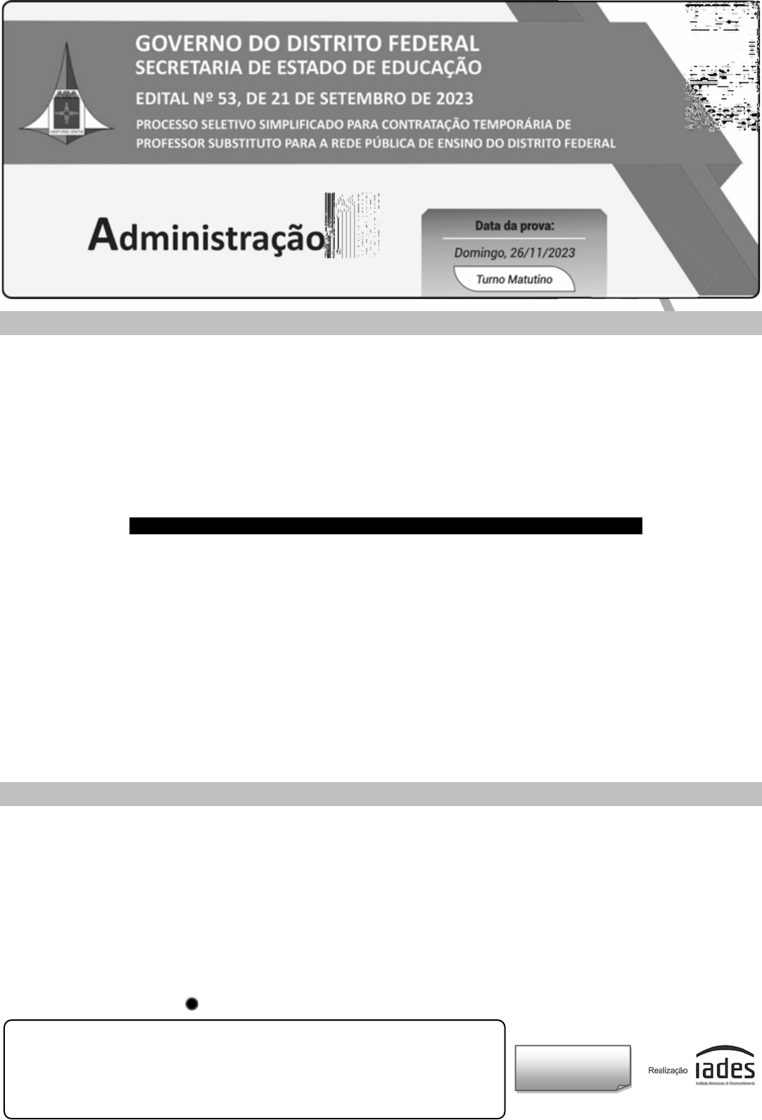 PROVA APLIC ADA Tipo “U” I N S T R U Ç Õ E S • Você recebeu do fiscal: o um caderno da prova objetiva contendo 120 (cento e vinte) itens – cada um deve ser julgado como CERTO ou ERRADO, de acordo com o(s) comando(s) a que se refere –; e o uma folha de respostas personalizada. • Verifique se a numeração dos itens, a paginação do caderno da prova objetiva e a codificação da folha de respostas estão corretas. • Verifique se o componente curricular selecionado por você está explicitamente indicado nesta capa. • Quando autorizado pelo fiscal do IADES, no momento da identificação, escreva, no espaço apropriado da folha de respostas, com a sua caligrafia usual, a seguinte frase: A confiança em si mesmo é o primeiro segredo do sucesso. • Você dispõe de 3 (três) horas e 30 (trinta) minutos para fazer a prova objetiva, devendo controlar o tempo, pois não haverá prorrogação desse prazo. Esse tempo inclui a marcação da folha de respostas. • Somente 1 (uma) hora após o início da prova, você poderá entregar sua folha de respostas e o caderno da prova e retirar-se da sala. • O candidato somente poderá retirar-se do local de aplicação da prova, levando o caderno da prova objetiva quando faltarem 52 (cinquenta e dois) minutos para o final do tempo destinado à realização da prova. • Deixe sobre a carteira apenas o documento de identidade e a caneta esferográfica de tinta preta, fabricada com material transparente. • Não é permitida a utilização de nenhum tipo de aparelho eletrônico ou de comunicação. • Não é permitida a consulta a livros, dicionários, apontamentos e (ou) apostilas. • Você somente poderá sair e retornar à sala de aplicação da prova na companhia de um fiscal do IADES. • Não será permitida a utilização de lápis em nenhuma etapa da prova. I NS T R UÇ Õ ES P A R A A P R OVA O B J ET I VA • Verifique se os seus dados estão corretos na folha de respostas da prova objetiva. Caso haja algum dado incorreto, comunique ao fiscal. • Leia atentamente cada item e assinale sua resposta na folha de respostas. • A folha de respostas não pode ser dobrada, amassada, rasurada ou manchada e nem pode conter registro fora dos locais destinados às respostas. • O candidato deverá transcrever, com caneta esferográfica de tinta preta, fabricada com material transparente, as respostas da prova objetiva para a folha de respostas. • A maneira correta de assinalar a alternativa na folha de respostas é cobrir, fortemente, com caneta esferográfica de tinta preta, fabricada com material transparente, o espaço a ela correspondente. • Marque as respostas assim: APLIC ADA PROVA APLIC ADA PROCESSO SELETIVO SIMPLIFICADO – SEEDF PROFESSOR SUBSTITUTO TEMPORÁRIO ADMINISTRAÇÃO TIPO “U” PÁGINA 2/9 P R O V A O B J E T I V A CONHECIMENTOS BÁSICOS Itens de 1 a 40 1 4 7 10 12 Há escolas que são gaiolas e há escolas que são asas. Escolas que são gaiolas existem para que os pássaros desaprendam a arte do voo. Pássaros engaiolados são pássaros sob controle. Engaiolados, o seu dono pode levá-los para onde quiser. Pássaros engaiolados sempre têm um dono. Deixaram de ser pássaros. Porque a essência dos pássaros é o voo. Escolas que são asas não amam pássaros engaiolados. O que elas amam são pássaros em voo. Existem para dar aos pássaros coragem para voar. Ensinar o voo, isso elas não podem fazer, porque o voo já nasce dentro dos pássaros. O voo não pode ser ensinado. Só pode ser encorajado. ALVES, Rubem. In: Por uma educação romântica. 8. ed. Campinas: Papirus, 2009, p. 29-32. Com base nas informações do texto e nos recursos responsáveis pelas relações entre elas, julgue (C ou E) os itens a seguir. 1. Segundo o autor, as escolas que são gaiolas contribuem para que os pássaros desaprendam a arte do voo, enquanto as escolas que são asas ensinam os pássaros a voar. 2. No período composto “Escolas que são gaiolas existem para que os pássaros desaprendam a arte do voo” (linhas 2 e 3), o pronome relativo “que” retoma o termo “Escolas” e a locução “para que” introduz ideia de finalidade em relação à oração anterior. 3. No período “Existem para dar aos pássaros coragem para voar.” (linha 9), o termo sublinhado poderia, sem comprometer a relação de sentido original, ser substituído pelo pronome lhes. 4. Para representar os tipos de escola e as diferenças entre eles, o autor utiliza-se da metáfora e da antítese. Professor e estudantes criam jornal digital 1 4 7 10 11 A busca por diferentes práticas que conquistem a dedicação dos estudantes levou o professor Eduardo Alves e a sua turma ao mundo das notícias: juntos, criaram o CEMTN News, um jornal veiculado na internet com notícias e opiniões produzidas na escola. O nome do jornal digital é uma referência à própria escola, já que a turma estuda no Centro de Ensino Médio de Taguatinga Norte (CEMTN). A plataforma virou um meio de expressão dos estudantes. Lá, diferentes temas são trabalhados, e o professor regente estimula o respeito social. CRUZ, Íris. Disponível em: . Acesso em: 19 out. 2023, com adaptações. Considerando as informações do texto e as questões morfossintáticas que o constituem, julgue (C ou E) os itens a seguir. 5. A redação Afim de encontrarem práticas diferentes que motivassem a dedicação dos alunos, o professor Eduardo Alves e a sua turma, foram levados ao mundo das notícias está totalmente de acordo com a norma-padrão e reproduz uma mensagem compatível com o texto. 6. Na linha 1, a forma verbal “conquistem” poderia ter sido empregada na terceira pessoa do singular para concordar com o sujeito “A busca”. 7. O uso do sinal indicativo de crase é obrigatório no trecho “é uma referência à própria escola” (linhas 6 e 7). 8. No lugar da locução “já que” (linha 7), estaria correto o emprego da forma porque. 9. A função sintática desempenh