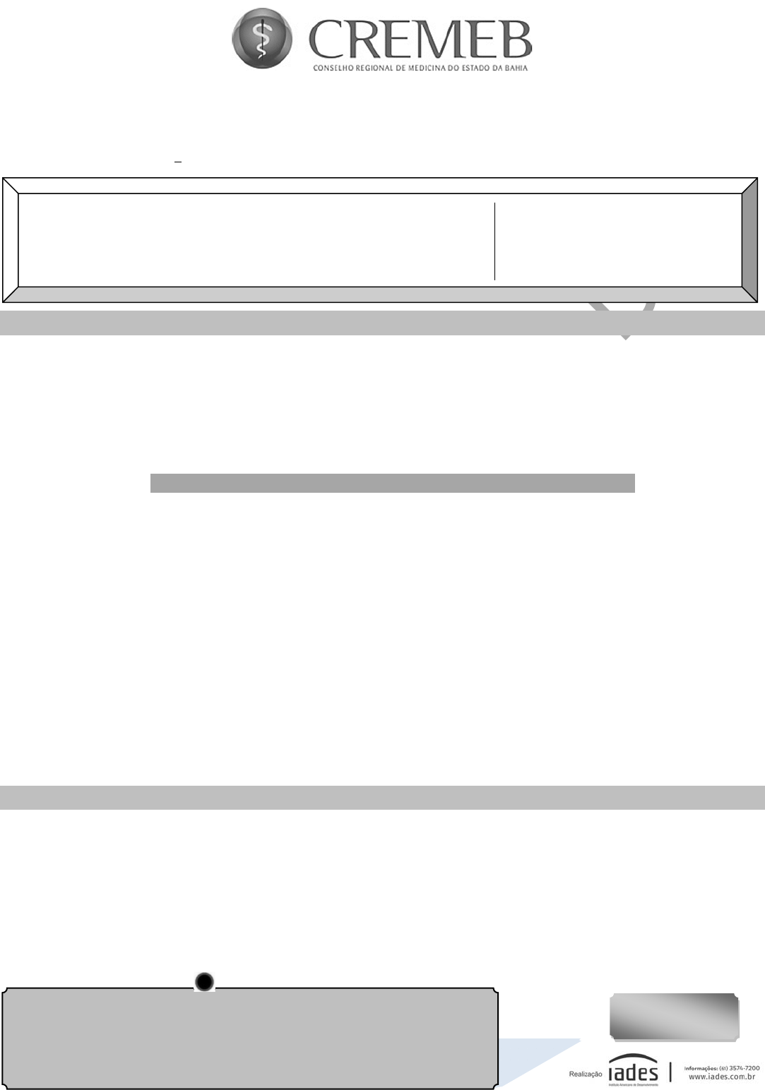PROVA APLIC ADA Tipo “A” CONCURSO PÚBLICO PARA PROVIMENTO DE VAGAS E FORMAÇÃO DE CADASTRO RESERVA EM CARGOS DE NÍVEL SUPERIOR E NÍVEL MÉDIO EDITAL NO 1 DO CONCURSO PÚBLICO 1/2017 – CREMEB - NORMATIVO I N S T R U Ç Õ E S Você receberá do fiscal: o um caderno de questões da prova objetiva e discursiva contendo 50 (cinquenta) questões de múltipla escolha, com 5 (cinco) alternativas de resposta cada uma e apenas 1 (uma) alternativa correta, e 1 (uma) questão discursiva; o uma folha de respostas personalizada da prova objetiva; e o uma folha de texto definitivo da prova discursiva. Quando autorizado pelo fiscal do IADES, no momento da identificação, escreva no espaço apropriado da folha de respostas da prova objetiva, com a sua caligrafia usual, a seguinte frase: Somos do tamanho que sonhamos. Verifique se estão corretas a numeração das questões, a paginação do caderno de questões e a codificação da folha de respostas da prova objetiva e da folha de texto definitivo da prova discursiva. Você dispõe de 4 (quatro) horas para fazer a prova objetiva e discursiva e deve controlar o tempo, pois não haverá prorrogação desse prazo. Esse tempo inclui a marcação da folha de respostas da prova objetiva e o preenchimento da folha de texto definitivo da prova discursiva. Somente 1 (uma) hora após o início da prova, você poderá entregar sua folha de respostas da prova objetiva, a folha de texto definitivo da prova discursiva e o caderno de provas e retirar-se da sala. Somente será permitido levar o caderno de questões da prova objetiva e discursiva 3 (três) horas e 30 (trinta) minutos após o início da prova. Após o término da prova, entregue ao fiscal do IADES a folha de texto definitivo da prova discursiva e a folha de respostas da prova objetiva devidamente assinada. Deixe sobre a carteira apenas o documento de identidade e a caneta esferográfica de tinta preta, fabricada com material transparente. Não é permitida a utilização de qualquer aparelho eletrônico ou de comunicação. Não é permitida a consulta a livros, dicionários, apontamentos e apostilas. Você somente poderá sair e retornar à sala de aplicação de provas na companhia de um fiscal do IADES. Não será permitida a utilização de lápis em qualquer etapa da prova. I N S T R U Ç Õ E S P A R A A P R O V A OB J E T I V A E D I S C U R S I V A Verifique se os seus dados estão corretos na folha de respostas da prova objetiva e na folha de texto definitivo da prova discursiva. Caso haja algum dado incorreto, escreva apenas no(s) campo(s) a ser(em) corrigido(s), conforme instruções na folha de respostas. Leia atentamente cada questão e assinale, na folha de respostas da prova objetiva, uma única alternativa. A folha de respostas da prova objetiva e a folha de texto definitivo da prova discursiva não podem ser dobradas, amassadas, rasuradas ou manchadas e nem podem conter qualquer registro fora dos locais destinados às respostas. O candidato deverá transcrever, com caneta esferográfica de tinta preta, as respostas da prova objetiva para a folha de respostas e o texto definitivo da prova discursiva para a folha de texto definitivo. A maneira correta de assinalar a alternativa na folha de respostas da prova objetiva é cobrir, fortemente, com caneta esferográfica de tinta preta, o espaço a ela correspondente. Marque as respostas assim: 101 Data e horário da prova: Domingo, 19/11/2017, às 14h MÉDICO FISCAL I www.pciconcursos.com.br PROVA APLIC ADA CONCURSO PÚBLICO – CREMEB 101 – MÉDICO FISCAL I – TIPO “A” PÁGINA 2/14 P R O V A O B J E T I V A LÍNGUA PORTUGUESA Questões de 1 a 8 Texto 1 para responder às questões de 1 a 3. 1 4 7 10 13 15 16 Denúncias Para realizar uma denúncia para o CREMEB, é necessário cumprir alguns requisitos processuais: – denúncia por escrito, digitada ou a punho, assinada e contendo dados de identificação e contato do denunciante; – cópia da carteira de identidade do denunciante; – comprovante de residência do denunciante. Os documentos podem ser enviados pelos Correios ao CREMEB ou entregues pessoalmente na sede da instituição (Rua Guadalajara, no 175, Morro do Gato, Barra, CEP: 40.140-460 – Salvador/BA) ou na delegacia regional mais próxima. Quem preferir pode levar o formulário de denúncia já preenchido e assinado. A denúncia deve ser acompanhada, sempre que possível, de documentos que comprovem as alegações (cópias de prontuários, exames, receitas, fotos, laudos, raio X etc.). Disponível em: . Acesso em: 23 set. 2017, com adaptações. QUESTÃO 1 _______________________ Relacionando-se as informações ao modo como elas estão organizadas, é correto afirmar que o (a) (A) texto classifica-se como predominantemente dissertativo, pois tem como finalidade principal convencer o cidadão a realizar denúncia para o CREMEB. (B) denúncia para o CREMEB só será aceita se o denunciante cumprir com pelo menos dois dos requisitos apresentados, já que eles estão dispostos no texto em uma ordem decrescente de importância. (C) formulário de denúncia deve ser levado já preenchido e assinado à sede do CREMEB ou à delegacia regional mais próxima, caso o denunciante resolva entregá-lo pessoalmente. (D) apresentação de documentos que comprovem as alegações do denunciante não é indispensável para que a denúncia para o CREMEB seja aceita. (E) texto, por apresentar uma sequência de fatos, deve ser classificado como predominantemente narrativo. QUESTÃO 2 _______________________ Considerando apenas as regras de concordância prescritas pela norma-padrão, assinale a alternativa correta. (A) Caso o autor julgasse conveniente acrescentar a construção com as devidas cópias logo após os termos sublinhados no trecho “Os documentos podem ser enviados pelos Correios ao CREMEB” (linhas 8 e 9), seria correta apenas uma das redações a seguir: Os documentos, com as devidas cópias, podem ser enviados pe