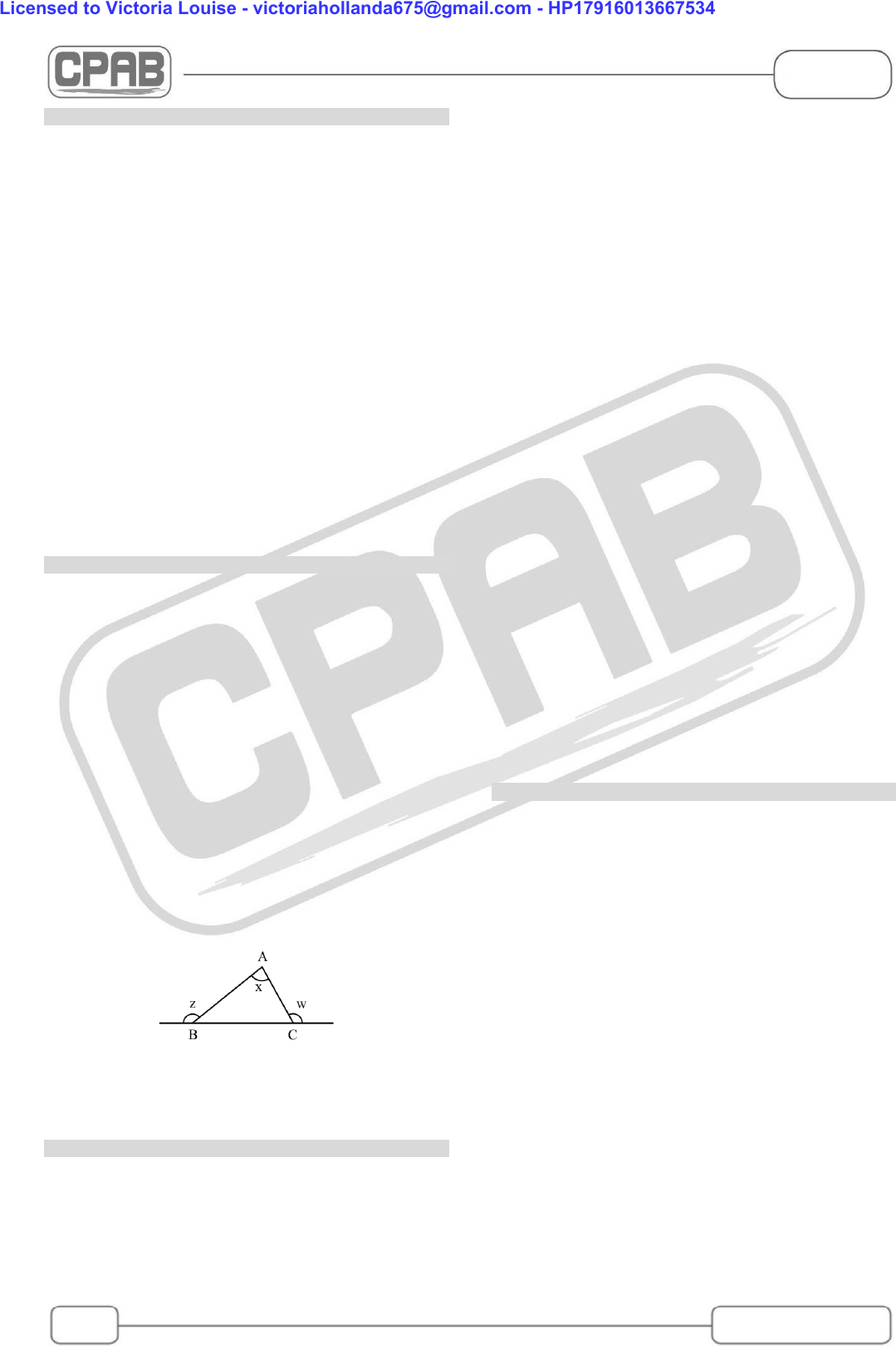 Matemática 138 138 COLETÂNEA DE PROVAS FUNÇÃO LOGARÍTMICA 142. (EEAr – 2017.2) As funções logarítmicas 𝑓(𝑥) = log0,4 𝑥 e 𝑔(𝑥) = log4 𝑥 são, respectivamente, A) crescente e crescente B) crescente e decrescente C) decrescente e crescente D) decrescente e decrescente 143. (EEAr – 2011) Sejam as funções logarítmicas 𝑓(𝑥) = log𝑎 𝑥 e 𝑔(𝑥) = log𝑏 𝑥. Se 𝑓(𝑥) é crescente e 𝑔(𝑥) é decrescente, então: A) 𝑎 > 1 e 𝑏 < 1. B) 𝑎 > 1 e 0 < 𝑏 < 1. C) 0 < 𝑎 < 1 e 𝑏 > 1. D) 0 < 𝑎 < 1 e 0 < 𝑏 < 1. 144. (EEAr – 2006) O menor número inteiro que satisfaz a inequação log2(3𝑥 − 5) > 3 é um número A) par negativo. B) par positivo. C) ímpar negativo. D) ímpar positivo. ÂNGULO 145. (EEAr – 2018.2) O complemento do suplemento do ângulo de 112° mede. A) 18° B) 28° C) 12° D) 22° 146. (EEAr – 2016-2) Os ângulos 𝐵 e 𝐴 são congruentes. Sendo 𝐴 = 2𝑥 + 15º e 𝐵 = 5𝑥 − 9º. Assinale a alternativa que representa, corretamente, o valor de 𝑥. A) 2º B) 8º C) 12º D) 24º 147. (EEAr – 2020.2) No triângulo ABC da figura, x é a medida de um ângulo interno e z e w são medidas de ângulos externos. Se z + w = 220° e z − 20° = w, então x é A) complemento de 120° B) complemento de 60° C) suplemento de 140° D) suplemento de 50° POLÍGONO CONVEXO 148. (EEAr – 2017.1) Ao somar o número de diagonais e o número de lados de um dodecágono obtém-se: A) 66 B) 56 C) 44 D) 42 149. (EEAr – 2013) Se 𝐴 é o número de diagonais de um icoságono e 𝐵 o número de diagonais de um decágono, então 𝐴 − 𝐵 é igual a: A) 85 B) 135 C) 165 D) 175 150. (EEAr – 2015) Se um dos ângulos internos de um pentágono mede 100° então a soma dos outros ângulos internos desse polígono é A) 110° B) 220° C) 380° D) 440° 151. (EEAr – 2007) Dois polígonos convexos têm o número de lados expresso por 𝑛 e por 𝑛 + 3. Sabendo que um polígono tem 18 diagonais a mais que o outro, o valor de 𝑛 é: A) 10 B) 8 C) 6 D) 4 152. (EEAr – 2006) Sejam 𝐴, 𝐵 e 𝐶 três polígonos convexos. Se 𝐶 tem 3 lados a mais que 𝐵, e este tem 3 lados a mais que 𝐴, e a soma das medidas dos ângulos internos dos três polígonos é 3240°, então o número de diagonais de 𝐶 é: A) 46 B) 44 C) 42 D) 40 POLÍGONO REGULAR 153. (EEAr – 2017.2) O polígono regular cujo ângulo externo mede 24° tem _____ lados. A) 20 B) 15 C) 10 D) 5 154. (EEAr – 2018.1) A metade da medida do ângulo interno de um octógono regular, em graus, é: A) 67,5 B) 78,6 C) 120 D) 85 155. (EEAr – 2008) Em um polígono regular, a medida de um ângulo interno é o triplo da medida de um ângulo externo. Esse polígono é o A) hexágono. B) octógono. C) eneágono. D) decágono. Licensed to Victoria Louise - victoriahollanda675@gmail.com - HP17916013667534