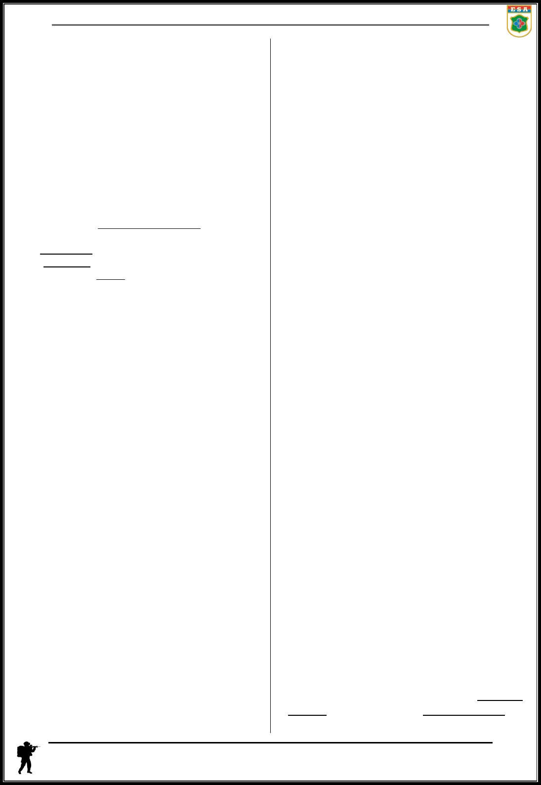CADERNO DE EXERCÍCIOS PARA O EXAME INTELECTUAL AOS CURSOS DE FORMAÇÃO E GRADUAÇÃO DE SARGENTOS – ESA __________________________________________________________________________________ 408 SÉRIE: GAC/ESA2024VPNE 128. (QUESTÃO) - Considering the following sentence, select the correct alternative to fulfill out the lines: “The apartment __________ (To Belong) to Mary for 5 years before she _________ (To Sell) it.” a) Had belonged / sold. b) Belonged / sold. c) Had been belonging / sold. d) Belong / Sell. e) Had belonged / had sold. 129. (QUESTÃO) - Analyse the current sentences and choose the option that describes their verb tense: I - My brother has been teasing me since this morning. II - I am reading an excellent book. III - I have been to England twice. IV - My husband works everyday. a) Present continuous – Present perfect continuous – Present simple – Present perfect. b) Present perfect continuous – Present perfect – Simple past – Present simple. c) Present perfect continuous – Present continuous – Present perfect – Present simple. d) Present perfect – Present simple – Present perfect – Present continuous. e) Present perfect continuous – Present continuous – Past perfect – Present simple. 130. (QUESTÃO) - Complete the sentence with the correct verb form: Hans ___________ at the library, that’s why he _________ with us right now. a) is studying – can’t be b) is not studying – are c) studies – were d) studied – have been e) study – used to be 131. (QUESTÃO) - Read these sentences. 1. Laura WALKS around the airport and looks at the shops. 2. She IS WAITING for her flight now. 3. She STARTS asking people where the bathroom is. The verbs in these sentences are in the following tenses, respectively: a) present simple / present continuous / present continuous. b) present simple / present continuous / present simple. c) present continuous / present simple / present continuous. d) present continuous / present continuous / present continuous. e) present simple / present simple / presente simple. 132. (QUESTÃO) - A Oração: “Doctors are investigating 29 related infant deaths” encontra- se em que tempo verbal? a) Past Perfect tense. b) Present tense c) Past continuous tense. d) Present continuous tense. e) Present Perfect tense. 133. (QUESTÃO) - Which alternative best completes the sentence below? (* means no article) _______ good book is ________ best medicine for ________ loneliness. , a) * - the – a b) The - a - * c) A - the - * d) The – * – a e) * - the – the 134. (QUESTÃO) - Which is the correct option to complete the text below? ______ (1) last month I spent four days in _______ (2) Angra with ______ (3) cousin from _______ (4) Paraná. Her father is ________ (5) uncle of mine who moved to ______ (6) south 2 years ago. a) Ø - the - a - the - the - the b) The - Ø - a - Ø - an - the c) Ø - Ø - a - Ø - an - the d) The - the - a - the - the - the e) Ø - Ø - the - Ø - an - Ø. 135. (QUESTÃO) - Select the alternative that best completes the extract below. Workplace Accident Statistics Every year, millions of people in ___ United States are hurt on the job. Each day 16 workers die from injuries at work and more than 17,000 are injured. Accidents also cause the companies to spend more. Last year, ___ total cost was more than $121 billion. a) the – a b) a – the c) the – an d) the – the e) an – a 136. (QUESTÃO) - Which alternative does not express the same idea as "Always do right" in the sentence below?