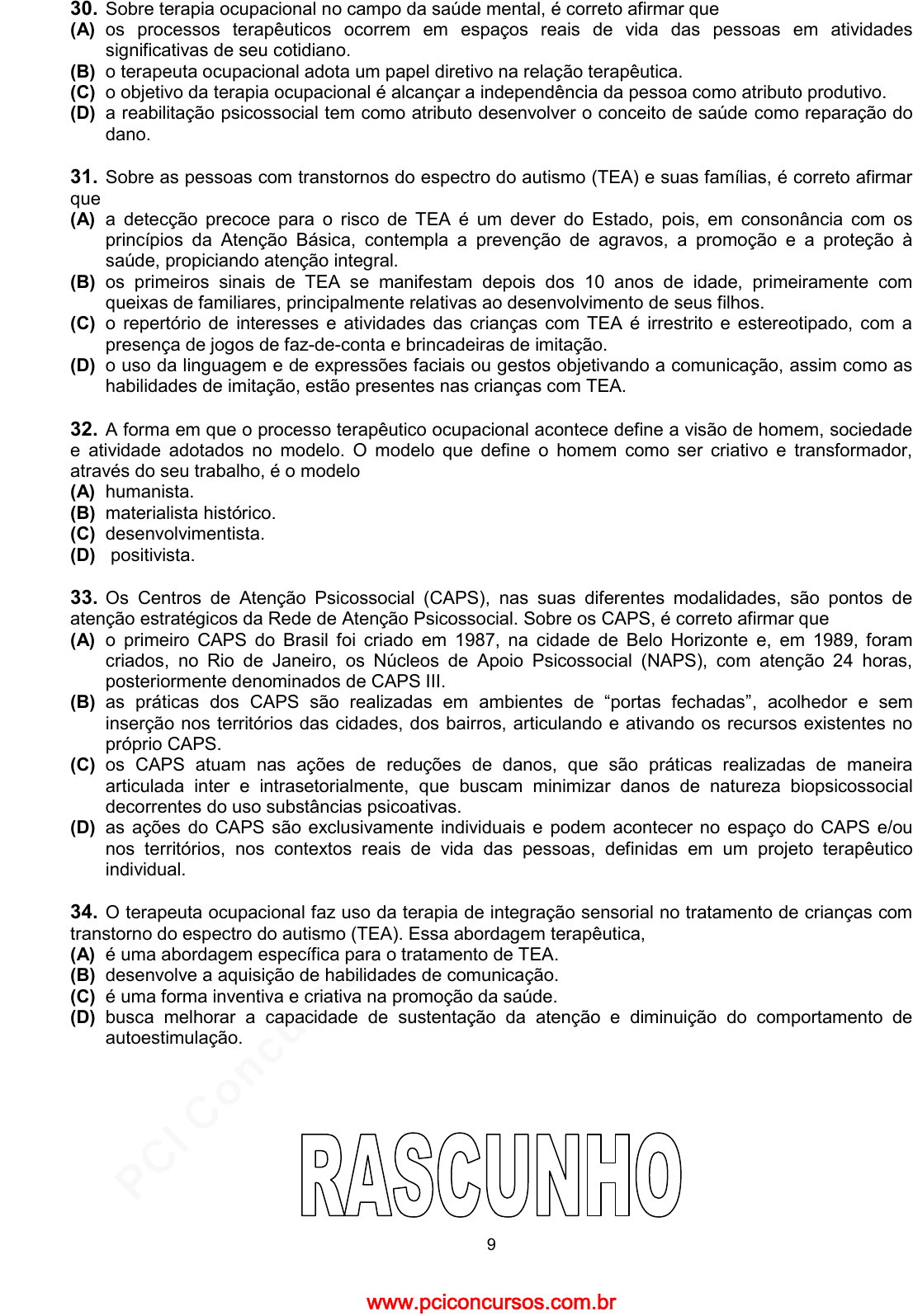 pcimarkpci MDAwMDowMDAwOjAwMDA6MDAwMDowMDAwOmZmZmY6ZDhlZTo3Njk1:U2F0LCAyOSBNYXIgMjAyNSAxNToyNDozMyAtMDMwMA== www.pciconcursos.com.br 9 30. Sobre terapia ocupacional no campo da saúde mental, é correto afirmar que (A) os processos terapêuticos ocorrem em espaços reais de vida das pessoas em atividades significativas de seu cotidiano. (B) o terapeuta ocupacional adota um papel diretivo na relação terapêutica. (C) o objetivo da terapia ocupacional é alcançar a independência da pessoa como atributo produtivo. (D) a reabilitação psicossocial tem como atributo desenvolver o conceito de saúde como reparação do dano. 31. Sobre as pessoas com transtornos do espectro do autismo (TEA) e suas famílias, é correto afirmar que (A) a detecção precoce para o risco de TEA é um dever do Estado, pois, em consonância com os princípios da Atenção Básica, contempla a prevenção de agravos, a promoção e a proteção à saúde, propiciando atenção integral. (B) os primeiros sinais de TEA se manifestam depois dos 10 anos de idade, primeiramente com queixas de familiares, principalmente relativas ao desenvolvimento de seus filhos. (C) o repertório de interesses e atividades das crianças com TEA é irrestrito e estereotipado, com a presença de jogos de faz-de-conta e brincadeiras de imitação. (D) o uso da linguagem e de expressões faciais ou gestos objetivando a comunicação, assim como as habilidades de imitação, estão presentes nas crianças com TEA. 32. A forma em que o processo terapêutico ocupacional acontece define a visão de homem, sociedade e atividade adotados no modelo. O modelo que define o homem como ser criativo e transformador, através do seu trabalho, é o modelo (A) humanista. (B) materialista histórico. (C) desenvolvimentista. (D) positivista. 33. Os Centros de Atenção Psicossocial (CAPS), nas suas diferentes modalidades, são pontos de atenção estratégicos da Rede de Atenção Psicossocial. Sobre os CAPS, é correto afirmar que (A) o primeiro CAPS do Brasil foi criado em 1987, na cidade de Belo Horizonte e, em 1989, foram criados, no Rio de Janeiro, os Núcleos de Apoio Psicossocial (NAPS), com atenção 24 horas, posteriormente denominados de CAPS III. (B) as práticas dos CAPS são realizadas em ambientes de “portas fechadas”, acolhedor e sem inserção nos territórios das cidades, dos bairros, articulando e ativando os recursos existentes no próprio CAPS. (C) os CAPS atuam nas ações de reduções de danos, que são práticas realizadas de maneira articulada inter e intrasetorialmente, que buscam minimizar danos de natureza biopsicossocial decorrentes do uso substâncias psicoativas. (D) as ações do CAPS são exclusivamente individuais e podem acontecer no espaço do CAPS e/ou nos territórios, nos contextos reais de vida das pessoas, definidas em um projeto terapêutico individual. 34. O terapeuta ocupacional faz uso da terapia de integração sensorial no tratamento de crianças com transtorno do espectro do autismo (TEA). Essa abordagem terapêutica, (A) é uma abordagem específica para o tratamento de TEA. (B) desenvolve a aquisição de habilidades de comunicação. (C) é uma forma inventiva e criativa na promoção da saúde. (D) busca melhorar a capacidade de sustentação da atenção e diminuição do comportamento de autoestimulação. www.pciconcursos.com.br pcimarkpci MDAwMDowMDAwOjAwMDA6MDAwMDowMDAwOmZmZmY6ZDhlZTo3Njk1:U2F0LCAyOSBNYXIgMjAyNSAxNToyNDozMyAtMDMwMA== www.pciconcursos.com.br 10 35. Sobre a terapia ocupacional e a definição de Atividades da Vida Diária (AVD) e Atividades Instrumentais da Vida Diária (AIVD), é correto afirmar que (A) muitos documentos oficiais, livros e artigos da área de terapia ocupacional, passaram a utilizar a expressão “Atividades da Vida diária” somente na década de 90. (B) a especificidade da terapia ocupacional reside no fato de que nenhum outro profissional apresenta uma prática fundamentada na recuperação da capacidade/independência para a realização das Atividades da Vida Diária. (C) as AVD e AIVD independem de cada cultura, que regularia os detalhes para que as mesmas fossem desempenhadas de forma adequada. (D) o conhecimento dos componentes motores é suficiente para um trabalho conciso e eficiente para a recuperação ou desenvolvimento das capacidades necessárias à realização das AVD e AIVD. 36. Na reabilitação de pacientes que sofreram traumatismo cranioencefálico, o terapeuta ocupacional utiliza a terapia de estimulação sensorial. Considerando-se as modalidades de estimulação sensorial, é correto afirmar que (A) a mudança de postura é um tipo de estímulo vestibular. (B) o toque de objetos, o balanço e os comandos verbais são exemplos de estímulos táteis e auditivos. (C) a movimentação em superfícies móveis com bola e o toque leve com pressão são exemplos de estímulos vestibulares. (D) a escovação com uso de esponja é um tipo de estímulo proprioceptivo. 37. A intervenção do terapeuta ocupacional na área de traumatologia e ortopedia compreende diversos aspectos e fases no processo de tratamento. As condutas básicas para o restabelecimento de funções e estruturas corporais afetadas são (A) reduzir o edema e controlar o processo inflamatório. (B) simular a introdução de atividades para realização de funções no ambiente do paciente e desenvolver habilidades. (C) estimular funções motoras e treinar as habilidades funcionais. (D) restaurar padrões de desempenho das tarefas cotidianas e de atividades de participação social. 38. Sobre a terapia ocupacional e a manutenção da capacidade funcional do idoso, é correto afirmar que (A) a perda da capacidade funcional do idoso é uma doença e suas consequências devem ser analisadas. (B) as restrições da participação de um idoso numa situação da vida real devem ser entendidas unicamente como característica do indivíduo, sem a análise da tarefa e do ambiente. (C) os