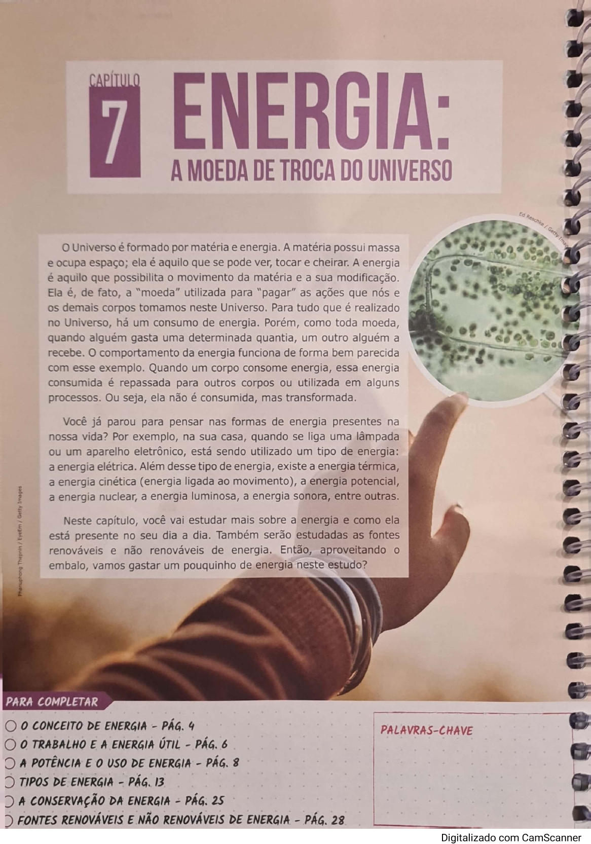 CAPÍTULO 7 ENERGIA: A MOEDA DE TROCA DO UNIVERSO Ed o Universo é formado por matéria e energia. A matéria possui massa e ocupa espaço; ela é aquilo que se pode ver, tocar e cheirar. A energia é aquilo que possibilita o movimento da matéria e a sua modificação. Ela é, de fato, a "moeda" utilizada para "pagar" as ações que nós e os demais corpos tomamos neste Universo. Para tudo que é realizado no Universo, há um consumo de energia. Porém, como toda moeda, quando alguém gasta uma determinada quantia, um outro alguém a recebe. o comportamento da energia funciona de forma bem parecida com esse exemplo. Quando um corpo consome energia, essa energia consumida é repassada para outros corpos ou utilizada em alguns processos. Ou seja, ela não é consumida, mas transformada. Você já parou para pensar nas formas de energia presentes na nossa vida? Por exemplo, na sua casa, quando se liga uma lâmpada ou um aparelho eletrônico, está sendo utilizado um tipo de energia: a energia elétrica. Além desse tipo de energia, existe a energia térmica, a energia cinética (energia ligada ao movimento), a energia potencial, a energia nuclear, a energia luminosa, a energia sonora, entre outras. Neste capítulo, você vai estudar mais sobre a energia e como ela está presente no seu dia a dia. Também serão estudadas as fontes renováveis e não renováveis de energia. Então, aproveitando o embalo, vamos gastar um pouquinho de energia neste estudo? PARA COMPLETAR CONCEITO DE ENERGIA - 4 PALAVRAS-CHAVE TRABALHO E A ENERGIA - PÁG. 6 A POTÊNCIA E USO DE ENERGIA - 8 TIPOS DE ENERGIA PAG. 13 A CONSERVAÇÃO DA ENERGIA - 25 FONTES RENOVÁVEIS E NÃO RENOVÁVEIS DE ENERGIA - 287 Energia: a moeda de troca do Universo 1. o conceito de energia Você já pensou no que significa a palavra "energia"? Como ela é usada no contexto científico e como é usada no nosso dia a dia? A palavra "energia" vem do grego energeia, que significa algo como "ação", "movimento" ou mesmo "força em movimento". Essa é a noção utilizada no cotidiano, por exemplo, quando se diz que uma pessoa tem muita energia. Há, ainda, outros usos da ideia de energia. Por exemplo, é comum ouvir dizer que alguém possui uma "energia boa" quando essa pessoa tem um bom astral. No entanto, o uso do conceito de energia na ciência possui algumas diferenças em relação ao seu uso no cotidiano e é um pouco mais e difícil de definir. A energia está relacionada ao movimento e, também, a situações estáticas, isto é, que não envolvem o movimento. Podemos dizer que um objeto que possua energia está em movimento ou tem condições de entrar em movimento. Apesar de termos uma noção do que seja energia, não há um conceito formal para esse termo na ciência e nem um consenso sobre o seu significado. o que se faz, em geral, é estudar as diversas formas e as propriedades da energia nos processos naturais e tecnológicos. Seguem alguns princípios e características da energia que são muito importantes para a ciência: A energia se conserva: isso significa dizer que a quantidade total de energia no Universo sempre foi e sempre será a mesma. Qualquer que seja o processo pelo qual passa a natureza, o total de energia permanece constante. A energia pode ser transformada: há diversas formas de energia e essas diversas formas podem se transformar umas nas outras. Os processos naturais e tecnológicos ocorrem mediante transformação de energia. Para poder ler este texto, por exemplo, você está transformando energia em seu corpo. A energia pode ser armazenada: parte da energia existente está armazenada de diversas formas e pode ser utilizada para gerar movimento. Por exemplo, há energia armazenada na gasolina que, ao ser queimada nos motores dos automóveis, é transformada em energia cinética (energia de movimento), térmica e sonora. É possível expressar a energia de diversas formas, com muitas unidades de medida diferentes. Cada uma delas possui uma definição específica. Você já deve ter lido em embalagens de produtos alimentícios a unidade kcal, que significa quilocaloria. A quilocaloria é uma unidade de medida de energia que indica a quantidade de energia fornecida por um alimento se ele for totalmente utilizado pelo organismo. Outro exemplo é a conta das companhias de energia elétrica em que é utilizado kWh, o quilowatt-hora. Na ciência, a unidade padronizada para a energia é o joule, cujo símbolo é o J. o nome dessa unidade foi dado em homenagem ao físico inglês James Prescott Joule que, juntamente com outros cientistas, desenvolveu o conceito de energia em meados do século XIX. Figura 1. o cientista James Prescott Joule trouxe importantes contribuições para o estudo da energia. 4 Coleção EF8 Digitalizado com CamScannerE ENERGIA A unidade joule representa uma quantidade de energia muito pequena. As outras unidades de energia citadas, quilocaloria e quilowatt-hora, possuem uma equivalência com o joule. Para que se uma comparação, têm-se as seguintes conversões: 1 kcal = 180 J 1 kWh = 3 ENTENDI EXERCÍCIOS DE APRENDIZAGEM 01. Ao longo de um dia, você terá realizado inúmeras transformações de energia em processos biológicos e tecnológicos. Respirar, digerir alimentos, correr, pensar, ver televisão ou usar celular são exemplos de processos em que há transformação de energia. Diante desse fato, responda: a quantidade de energia total no Universo está diminuindo? JUSTIFIQUE a sua resposta. 02. Quando foi comprar um aparelho elétrico, uma pessoa tentou ler a quantidade de energia elétrica consumida pelo equipamento. No entanto, o adesivo fixado estava com diversas informações apagadas, somente aparecendo as unidades de medida e os valores, como mostra a figura a seguir: CONGELADOR Energia (Elétrica) HORIZONTAL Fabricante Marca Tipo de degelo Mais eficiente A A B C D E Menos eficiente CONSUMO DE 45,7 293 -18 (kg/24h) 14.9 (h) 28 de Manual PROCEL CONSERVAÇÃO INMETRO A REMOÇÃ