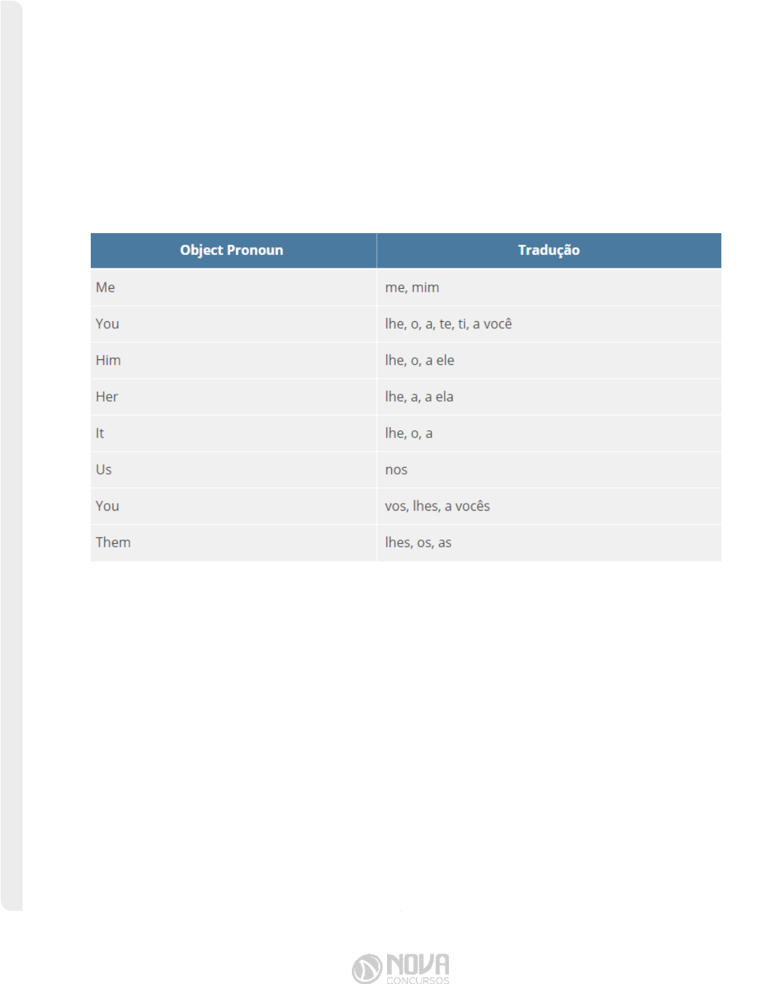 36 LÍ N G UA IN G LE SA Pronomes (pessoais (I, he, they, etc), objeto (me, him, them, etc), adjetivos possessivos (my, his, their / mine, his,theirs, etc), interrogativos (who, what, when, where, etc), relativos (who, that, which, etc). Pronomes Pronome é a classe de palavras que acompanha ou substitui um substantivo ou um outro pronome, indicando sua posição em relação às pessoas do discurso ou mesmo situando-o no espaço e no tempo. Os pronomes nos ajudam a evitar repetições desnecessárias na fala e na escrita. São divididos em: - Pronomes Pessoais (Personal Pronouns) Os pronomes pessoais são termos que indicam pessoas, lugares e objetos. São classificados em: Pronomes Pessoais do Caso Reto (Subject Pronoun): funcionam como sujeitos, por exemplo: She is beautiful (Ela é linda). Pronomes Pessoais do Caso Oblíquo (Object Pronoun): funcionam como objetos, por exemplo: Juan wants to meet her (Juan quer conhecê-la). - Pronomes Possessivos (Possessive Pronouns) Os pronomes possessivos em inglês, tal qual no português, indicam que algo pertence a alguém ou alguma coisa. São classificados em pronomes adjetivos e pronomes substantivos. Pronomes Adjetivos (Possessive Adjectives): diferentes da língua portuguesa, os pronomes adjetivos não são flexionados em grau (singular e plural). Sempre são acompanhados por substantivos, modificando-os. Exemplo: My house is located on Avenue de Paris (Minha casa está localizada na Avenida de Paris).