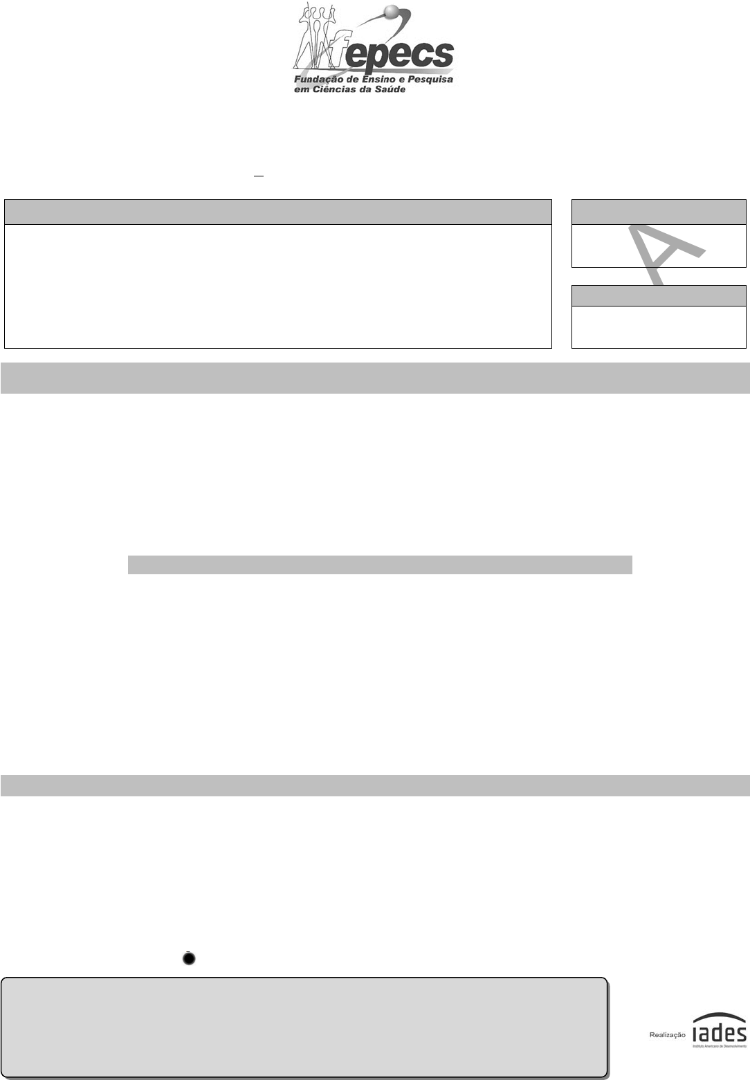 PROVA APLIC ADA GOVERNO DO DISTRITO FEDERAL SECRETARIA DE ESTADO DE SAÚDE DO DISTRITO FEDERAL FUNDAÇÃO DE ENSINO E PESQUISA EM CIÊNCIAS DA SAÚDE EDITAL NORMATIVO NO 1 – RM/SES-DF/2022, DE 28 DE SETEMBRO DE 2021. P R O G R A M A S – G R U P O 0 2 8 Data e horário da prova: Ortopedia e Traumatologia em Cirurgia da Coluna – R4 (701). Terça-feira, 30/11/2021. Tipo “U” I N S T R U Ç Õ E S Você receberá do fiscal: o um caderno da prova objetiva contendo 120 (cento e vinte) itens – cada um deve ser julgado como CERTO ou ERRADO, de acordo com o(s) comando(s) a que se refere –; e o uma folha de respostas personalizada. Verifique se a numeração dos itens, a paginação do caderno da prova objetiva e a codificação da folha de respostas estão corretas. Verifique se o programa selecionado por você está explicitamente indicado nesta capa. Quando autorizado pelo fiscal do IADES, no momento da identificação, escreva, no espaço apropriado da folha de respostas, com a sua caligrafia usual, a seguinte frase: Toda força será fraca, se não estiver unida. Você dispõe de 3 (três) horas e 30 (trinta) minutos para fazer a prova objetiva, devendo controlar o tempo, pois não haverá prorrogação desse prazo. Esse tempo inclui a marcação da folha de respostas. Somente 1 (uma) hora após o início da prova, você poderá entregar sua folha de respostas e o caderno da prova e retirar-se da sala. Somente será permitido levar o caderno da prova objetiva 3 (três) horas após o início da prova. Deixe sobre a carteira apenas o documento de identidade e a caneta esferográfica de tinta preta, fabricada com material transparente. Não é permitida a utilização de nenhum tipo de aparelho eletrônico ou de comunicação. Não é permitida a consulta a livros, dicionários, apontamentos e (ou) apostilas. Você somente poderá sair e retornar à sala de aplicação da prova na companhia de um fiscal do IADES. Não será permitida a utilização de lápis em nenhuma etapa da prova. I N S T R U Ç Õ E S P A R A A P R O V A O B J E T I V A Verifique se os seus dados estão corretos na folha de respostas da prova objetiva. Caso haja algum dado incorreto, comunique ao fiscal. Leia atentamente cada item e assinale sua resposta na folha de respostas. A folha de respostas não pode ser dobrada, amassada, rasurada ou manchada e nem pode conter registro fora dos locais destinados às respostas. O candidato deverá transcrever, com caneta esferográfica de tinta preta, fabricada com material transparente, as respostas da prova objetiva para a folha de respostas. A maneira correta de assinalar a alternativa na folha de respostas é cobrir, fortemente, com caneta esferográfica de tinta preta, fabricada com material transparente, o espaço a ela correspondente. Marque as respostas assim: PROVA APLIC ADA PROCESSO SELETIVO – RM/SES – DF/2022 GRUPO 028 – TIPO “U” PÁGINA 2/7 ORTOPEDIA E TRAUMATOLOGIA Itens de 1 a 120 Uma criança de 7 anos de idade foi levada a consulta por dor e edema em joelho esquerdo há dois dias, sem história de trauma. Apresenta Tax = 38,5 oC, VHS = 47 mm/h, PCR = 7 mg/dL, contagem global de leucócitos de 12.500 células/mm e radiografia do joelho sem diferença da distância no espaço articular. Com base nesse caso clínico e nos conhecimentos médicos correlatos, julgue os itens a seguir. 1. Nessa criança, a probabilidade preditiva de artrite séptica é maior que 95%. 2. O pico de elevação da VHS ocorre entre três e cinco dias após o início da infecção, retornando ao normal em aproximadamente três semanas após o início do tratamento. 3. A PCR aumenta até seis horas após o início da infecção, atingindo o pico de elevação dois dias depois, retornando ao normal em seguida, uma semana após o início do tratamento adequado. 4. O VHS é a melhor maneira de acompanhar a resposta da infecção ao tratamento. 5. Na análise do líquido sinovial dessa criança, provavelmente a contagem de células é superior a 80.000/mm3 e com mais de 75% das células sendo neutrófilos. 6. Radiografias simples mostram edema dos tecidos moles, estreitamento ou alargamento do espaço articular e destruição óssea e são muito úteis no diagnóstico das infecções ósseas e articulares agudas. Um paciente de 72 anos de idade, vítima de queda de altura com trauma em coluna cervical, refere mecanismo de flexoextensão exagerado. Após realização dos exames de imagem, foi verificada uma fratura de processo odontoide tipo II, de Anderson e D`alonzo. Considerando esse caso clínico e os conhecimentos médicos correlatos, julgue os itens a seguir. 7. As fraturas do tipo II ocorrem acima do ligamento transverso. Geralmente, acontecem por avulsão pelo ligamento apical ou alar. 8. As fraturas de odontoide do tipo II são mais estáveis que as fraturas do tipo III, e o tratamento pode ser feito de forma conservadora ou cirúrgica. 9. Com tratamento conservador, o risco de pseudoartrose varia de 26% a 80% na literatura. Esse risco elevado de pseudoartrose é atribuído à instabilidade da fratura. 10. Os fatores de risco para pseudoartrose são desvio inicial maior do que 4 mm a 6 mm, angulação maior do que 10 graus e retardo no diagnóstico. 11. As fraturas do processo odontoide correspondem à fratura cervical mais comum na população com mais de 70 anos de idade. 12. O envolvimento neurológico varia de 2% a 27%, sendo de alta gravidade ou, até mesmo, fatal quando presente. Um atleta de luta esportiva de 33 anos de idade relata que, há três meses, teve entorse do joelho, evoluindo com dor, aumento de volume e bloqueios articulares esporádicos desde então. Apresenta hipotrofia muscular do quadríceps direito, estabilidade ligamentar em todos os testes realizados e manobras de Mcmurray, Thessaly e Apley positivas para menisco medial. A respeito desse caso clínico e com base nos conhecimentos médicos correlatos, julgue os itens a seguir. 13. As manobras de 