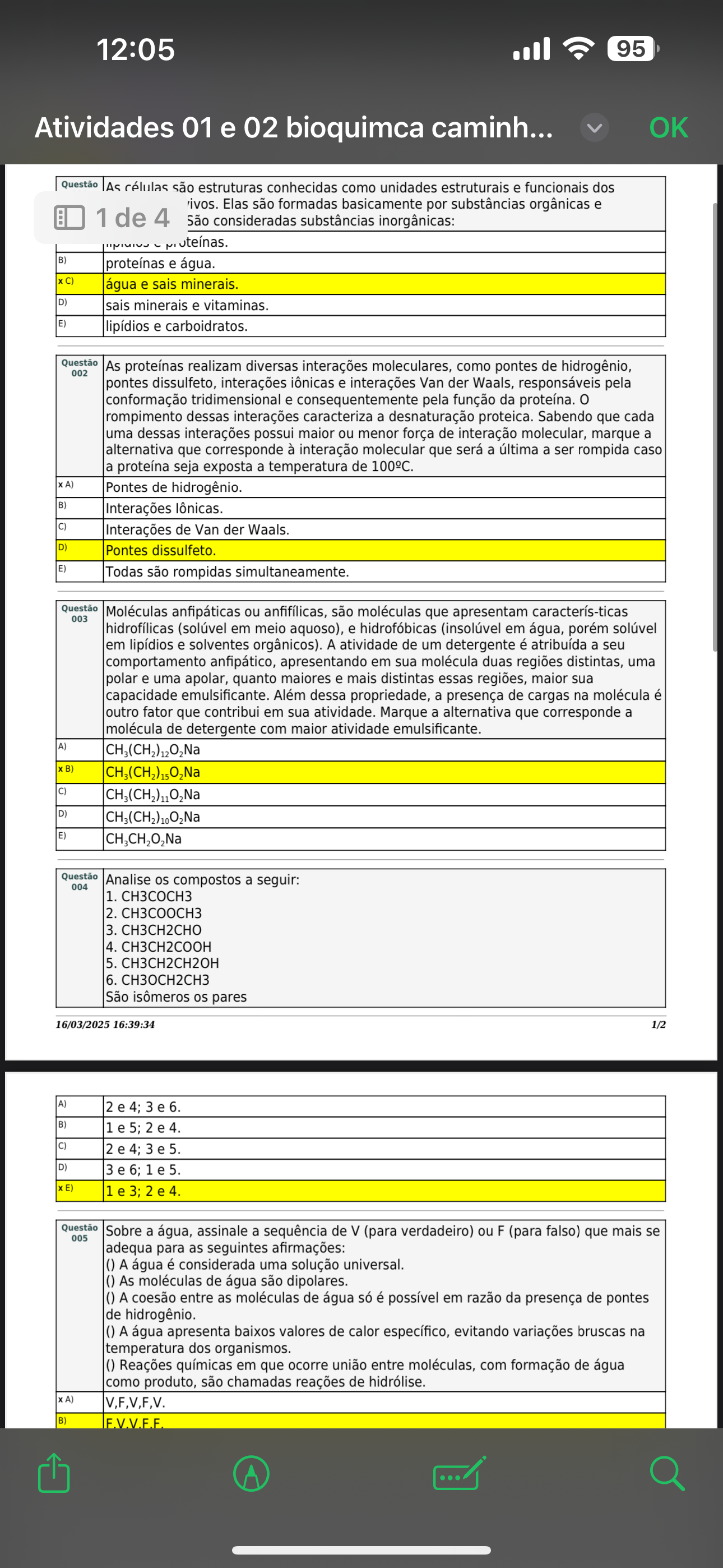 12:05 95 Atividades 01 e 02 bioquimca caminh.. OK Questão As células são estruturas conhecidas como unidades estruturais e funcionais dos vivos. Elas são formadas basicamente por substâncias orgânicas e B 1 de 4 São consideradas substâncias inorgânicas: B) proteínas e água. água e sais minerais. D) sais minerais e vitaminas. E) lipídios e carboidratos. Questão 002 As proteínas realizam diversas interações moleculares, como pontes de hidrogênio, pontes dissulfeto, interações e interações Van der Waals, responsáveis pela conformação tridimensional e consequentemente pela função da proteína. o rompimento dessas interações caracteriza a desnaturação proteica. Sabendo que cada uma dessas interações possui maior ou menor força de interação molecular, marque a alternativa que corresponde à interação molecular que será a última a ser rompida caso a proteína seja exposta a temperatura de 100°C. x A) Pontes de hidrogênio. B) Interações C) Interações de Van der Waals. D) Pontes dissulfeto. E) Todas são rompidas simultaneamente. Questão 003 anfipáticas ou anfifílicas, são moléculas que apresentam caracterís-ticas hidrofílicas (solúvel em meio aquoso), e hidrofóbicas (insolúvel em água, porém solúvel em lipídios e solventes orgânicos). A atividade de um detergente é atribuída a seu comportamento anfipático, apresentando em sua molécula duas regiões distintas, uma polar e uma apolar, quanto maiores e mais distintas essas regiões, maior sua capacidade emulsificante. Além dessa propriedade, a presença de cargas na molécula é outro fator que contribui em sua atividade. Marque a alternativa que corresponde a molécula de detergente com maior atividade emulsificante. A) x B) CH3(CH2)15O2Na C) D) E) Questão 004 Analise os compostos a seguir: 1. CH3COCH3 2. CH3COOCH3 3. CH3CH2CHO 4. CH3CH2COOH 5. CH3CH2CH2OH 6. CH3OCH2CH3 São isômeros os pares 16/03/2025 16:39:34 1/2 A) 2 e 4; 3 e 6. B) 1 e 5; 2 e 4. C) 2 e 4; 3 e 5. D) 3 e 6; 1 e 5. x E) 1 e 3; 2 e 4. Questão 005 Sobre a água, assinale a sequência de V (para verdadeiro) ou F (para falso) que mais se adequa para as seguintes afirmações: () A água é considerada uma solução universal. () As moléculas de água são dipolares. () A coesão entre as moléculas de água só é possível em razão da presença de pontes de hidrogênio. () A água apresenta baixos valores de calor específico, evitando variações bruscas na temperatura dos organismos. () Reações químicas em que ocorre união entre moléculas, com formação de água como produto, são chamadas reações de hidrólise. x A) B) F.V.V.F.F.