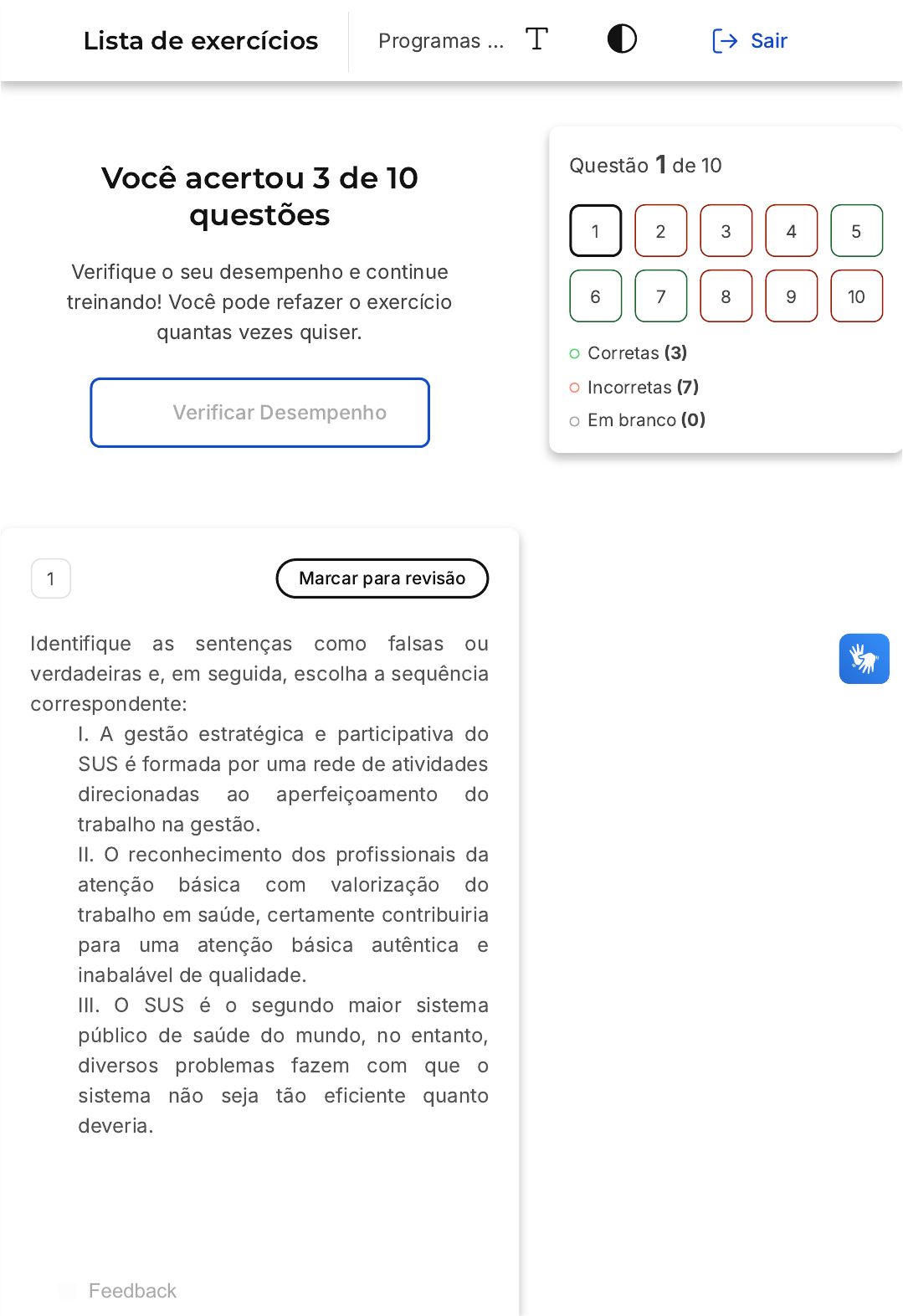 Você acertou 3 de 10 questões Verifique o seu desempenho e continue treinando! Você pode refazer o exercício quantas vezes quiser. Verificar Desempenho 1 Marcar para revisão Identifique as sentenças como falsas ou verdadeiras e, em seguida, escolha a sequência correspondente: I. A gestão estratégica e participativa do SUS é formada por uma rede de atividades direcionadas ao aperfeiçoamento do trabalho na gestão. II. O reconhecimento dos profissionais da atenção básica com valorização do trabalho em saúde, certamente contribuiria para uma atenção básica autêntica e inabalável de qualidade. III. O SUS é o segundo maior sistema público de saúde do mundo, no entanto, diversos problemas fazem com que o sistema não seja tão eficiente quanto deveria. Questão 1 de 10 Corretas (3) Incorretas (7) Em branco (0) 1 2 3 4 5 6 7 8 9 10 Lista de exercícios Programas … Sair Feedback A B C D E I é falsa. Estão corretas a II e a III. Somente a III está correta. I, II e III estão corretas. I e II estão corretas. Resposta incorreta Opa! A alternativa correta é a letra E. Confira o gabarito comentado! Gabarito Comentado As sentenças I e II estão corretas. A sentença I afirma que a gestão estratégica e participativa do SUS é formada por uma rede de atividades direcionadas ao aperfeiçoamento do trabalho na gestão, o que é verdadeiro. A gestão do SUS é estratégica e participativa, visando sempre o aperfeiçoamento do trabalho na gestão. A sentença II também é verdadeira, pois o reconhecimento e a valorização dos profissionais da atenção básica contribuiriam para uma atenção básica de qualidade. No entanto, a sentença III é falsa. O SUS não é o segundo maior sistema público de saúde do mundo. Portanto, a alternativa correta é a E: "I e II estão corretas". A B C 2 Marcar para revisão (Instituto Excelência/2019 - adaptado) O Ministério da Saúde elaborou a Política Nacional de Saúde Integral de Gays, Lésbicas, Bissexuais, Travestis e Transexuais. Sobre a Política Nacional de Saúde Integral de LGBT, analise as afirmativas abaixo. I - É organizada na promoção da saúde, na atenção e no cuidado em saúde, priorizando a redução das desigualdades por orientação sexual e identidade de gênero. II - Suas diretrizes e objetivos estão voltados para a promoção da desigualdade na saúde, assim como o combate à homofobia, à lesbofobia e à transfobia e à discriminação nas instituições e serviços do Sistema Único de Saúde. III - É constituída por um conjunto de princípios éticos e políticos expressos em uma marca que reconhece os efeitos perversos dos processos de discriminação e de exclusão sobre a saúde. Marque a alternativa que apresenta a(s) afirmativa(s) correta(s). As afirmativas I, II e III estão corretas. Apenas as afirmativas I e III estão corretas. Apenas as afirmativas I e II estão corretas. D E Apenas as afirmativas II e III estão corretas. Apenas a afirmativa I está correta. Resposta incorreta Opa! A alternativa correta é a letra B. Confira o gabarito comentado! Gabarito Comentado A alternativa B é a correta, pois as afirmativas I e III estão corretas. A afirmativa I está correta porque a Política Nacional de Saúde Integral de LGBT é de fato organizada na promoção da saúde, na atenção e no cuidado em saúde, priorizando a redução das desigualdades por orientação sexual e identidade de gênero. A afirmativa III também está correta, pois a política é constituída por um conjunto de princípios éticos e políticos que reconhecem os efeitos prejudiciais dos processos de discriminação e de exclusão sobre a saúde. No entanto, a afirmativa II está incorreta, pois as diretrizes e objetivos da política não estão voltados para a promoção da desigualdade na saúde, mas sim para a promoção da equidade na saúde, além do combate à homofobia, à lesbofobia, à transfobia e à discriminação nas instituições e serviços do Sistema Único de Saúde. 3 Marcar para revisão A B C D E A Portaria no 4.279, de 30 de dezembro de 2010, estabeleceu diretrizes para a organização da Rede de Atenção à Saúde no âmbito do SUS. Essa portaria visa, prioritariamente, à: Universalidade do acesso. Regionalização Humanização Integralidade do cuidado Equidade Resposta incorreta Opa! A alternativa correta é a letra B. Confira o gabarito comentado! Gabarito Comentado RESPOSTA CORRETA: Regionalização 4 Marcar para revisão (FEPESE/2021 - adaptada) Um dos principais programas de saúde pública do Brasil são a Estratégia Saúde da Família (ESF) e o Núcleo de Apoio à Saúde da Família (NASF). Assinale a alternativa correta em relação à Estratégia Saúde da Família (ESF) e ao Núcleo A B C de Apoio à Saúde da Família e Atenção Básica (NASF-AB). O NASF-AB tem como proposta diminuir a instabilidade da Atenção Básica, aumentando a oferta de serviços de saúde pública e gratuita, resultando em um sistema mais resolutivo com ampliação no foco das ações. Os NASF-AB fazem parte da atenção básica e se constituem como serviços com unidades físicas independentes ou especiais. Para exercer suas atividades, as equipes NASF devem ocupar o espaço físico das unidades às quais estão vinculadas, ou ainda outros espaços disponíveis no território, como o espaço das academias da saúde, escolas, parques, dentre outros. A ESF visa à reorganização do SUS em todos os seus níveis de assistência: atenção primária, secundária e terciária. D E Os NASF-AB configuram-se como equipes multiprofissionais que atuam de forma integrada com as equipes de Saúde da Família (eSF), com as equipes de Atenção Secundária, e com o Programa Academia da Saúde. Ainda não existem critérios que definam apropriadamente como deve ser a composição de cada um dos NASF-AB. Dessa forma, a composição é definida exclusivamente de acordo com as prioridades elencadas pelos gestores municip