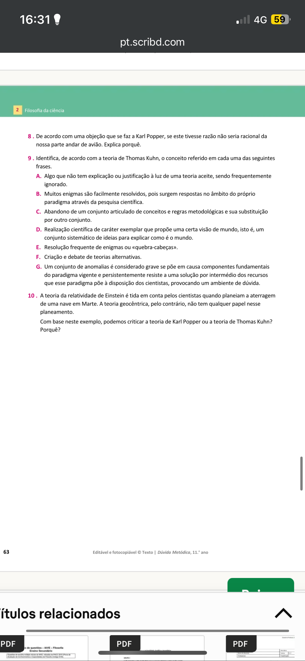 16:31 4G 59 pt.scribd.com 2 Filosofia da ciência 8 . De acordo com uma objeção que se faz a Karl Popper, se este tivesse razão não seria racional da nossa parte andar de avião. Explica 9. Identifica, de acordo com a teoria de Thomas Kuhn, o conceito referido em cada uma das seguintes frases. A. Algo que não tem explicação ou justificação à luz de uma teoria aceite, sendo frequentemente ignorado. B. Muitos enigmas são facilmente resolvidos, pois surgem respostas no âmbito do próprio paradigma através da pesquisa científica. C. Abandono de um conjunto articulado de conceitos e regras metodológicas e sua substituição por outro conjunto. D. Realização científica de caráter exemplar que propõe uma certa visão de mundo, isto é, um conjunto sistemático de ideias para explicar como é o mundo. E. Resolução frequente de enigmas ou F. Criação e debate de teorias alternativas. G. Um conjunto de anomalias é considerado grave se em causa componentes fundamentais do paradigma vigente e persistentemente resiste a uma solução por intermédio dos recursos que esse paradigma à disposição dos cientistas, provocando um ambiente de dúvida. 10 A teoria da relatividade de Einstein é tida em conta pelos cientistas quando planeiam a aterragem de uma nave em Marte. A teoria geocêntrica, pelo contrário, não tem qualquer papel nesse planeamento. Com base neste exemplo, podemos criticar a teoria de Karl Popper ou a teoria de Thomas Kuhn? Porquê? 63 Editável e fotocopiável Texto Dúvida Metódica, ano ítulos relacionados PDF PDF PDF de questões JAVE Filosofia Secundário