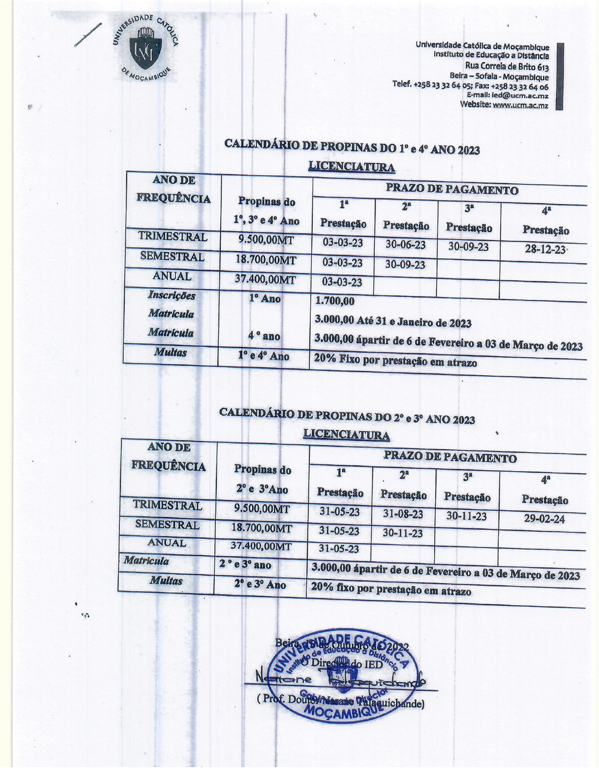 ADE Universidade Católica de Instituto de Educação a Distância Rua Correia de Brito 613 Beira - Sofala - Moçambique Telef. +258 23 32 64 05; Fax: +258 23 32 64 06 E-mail: ied@ucm.ac.mz Website: www.ucm.ac.mz CALENDÁRIO DE PROPINAS DO 1° e ANO 2023 LICENCIATURA ANO DE PRAZO DE PAGAMENTO Propinas do 3° e Ano Prestação Prestação Prestação Prestação TRIMESTRAL 9.500,00MT 03-03-23 30-06-23 30-09-23 28-12-23 SEMESTRAL 18.700,00MT 03-03-23 30-09-23 ANUAL 37.400,00MT 03-03-23 Inscrições Ano 1.700,00 3.000,00 Até 31 e Janeiro de 2023 ano 3.000,00 ápartir de 6 de Fevereiro a 03 de Março de 2023 Multas 1° e Ano 20% Fixo por prestação em atrazo CALENDÁRIO DE PROPINAS DO 2° e 3° ANO 2023 LICENCIATURA ANO DE PRAZO DE PAGAMENTO FREQUÊNCIA Propinas do 2° e Prestação Prestação Prestação Prestação TRIMESTRAL 9.500,00MT 31-05-23 31-08-23 30-11-23 29-02-24 SEMESTRAL 18.700,00MT 31-05-23 30-11-23 ANUAL 31-05-23 e ano 3.000,00 ápartir de 6 de Fevereiro a 03 de Março de 2023 Multas 2° e 3° Ano 20% fixo por prestação em atrazo de do (Prof. MOCAMBIQUEDADE Universidade Católica de Moçambique Instituto de Educação a Distância Rua Correia de Brito 613 DEMOCAMBIQUE Beira - Sofala Telef. +258 23 32 64 05; Fax: E-mail: ied@ucm.ac.mz Website: www.ucm.ac.mz PEMBA CALENDÁRIO DE PROPINAS DO 1° e ANO 2023 LICENCIATURA ANO DE PRAZO DE PAGAMENTO Propinas do 1°, e Ano Prestação Prestação Prestação Prestação TRIMESTRAL 8.550,00MT 03-03-23 30-06-23 30-09-23 28-12-23 SEMESTRAL 16.830,00MT 03-03-23 30-09-23 ANUAL 33.660,00MT 03-03-23 Inscrições 1° Ano 1.700,00 Matrícula 3.000,00 Até 31 e Janeiro de 2023 Matrícula ano 3.000,00 ápartir de 6 de Fevereiro a 03 de Março de 2023 Multas 1° e 4° Ano 20% Fixo por prestação em atrazo PEMBA CALENDÁRIO DE PROPINAS DO 2° e 3° ANO 2023 LICENCIATURA ANO DE PRAZO DE PAGAMENTO Propinas do 2° e Prestação Prestação Prestação Prestação TRIMESTRAL 8.550,00MT 31-05-23 31-08-23 30-11-23 29-02-24 SEMESTRAL 16.830,00MT 31-05-23 30-11-23 ANUAL 33.660,00MT 31-05-23 Matrícula e 3° ano 3.000,00 ápartir de 6 de Fevereiro a 03 de Março de 2023 Multas 2° e Ano 20% fixo por prestação em atrazo CA 2023 de do (Prof.