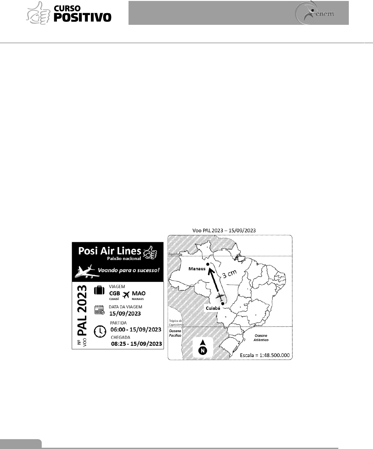 40 LINGUAGENS, CIÊNCIAS HUMANAS E REDAÇÃO EXAME NACIONAL DO ENSINO MÉDIO 2023 2.o SIMULADO ENEM 66. Região de aproximadamente 400 mil quilômetros quadrados de área, sujeita a climas subtropicais úmidos de planaltos com invernos relativamente brandos. Em sua acepção mais ampla, coincide com o setor do Planalto Meridional brasileiro – que se estende ao sul de São Paulo e norte do Paraná – posto que sua área mais típica coincida com o planalto basáltico sul-brasileiro, do Paraná ao Rio Grande do Sul (Almeida, 1956). Trata-se de planaltos de altitude média, variando entre 800 e 1300 m, revestidos por bosques de diferentes densidades e extensões, inclusive mosaicos de pradarias mistas e bosquetes de pinhais, ora em galeria ora nas encostas e eventualmente nas cabeceiras de drenagem. Com base nos conhecimentos sobre a vegetação brasileira, pode-se afirmar que o texto se refere ao domínio a) araucárias. c) várzea. e) mata de cocais. b) pantanal. d) cerrado. 67. O oceano é um corpo contínuo de água salgada que recobre mais de 70% da superfície terrestre. Sua importância para a vida no planeta Terra é significativa. Porém, todos os dias são despejados nesse corpo d’água milhões de litros de esgotos sanitários não tratados. Esse despejo constitui-se em uma grande ameaça para a vida marinha, bem como para as pessoas que vivem e tiram seu sustento dessas águas. A melhor forma de minimizar esse impacto é a) despejar os esgotos sanitários nos rios interiores. b) lançar os esgotos sanitários nos lençóis freáticos. c) armazenar os esgotos sanitários nas lagoas costeiras. d) jogar os esgotos sanitários nos lagos das usinas hidrelétricas. e) tratar os esgotos sanitários antes de despejá-los no oceano. 68. Mapa disponível em: Acesso em: 21.05.2023 (com adaptações). Considerando as informações, durante a realização do voo PAL 2023, a) a aeronave seguiu na direção subcolateral Nordeste (NE). b) a aeronave manteve-se na zona climática temperada do hemisfério Sul. c) foi percorrida uma distância de aproximadamente 1.450 quilômetros. d) os raios solares incidiram no lado esquerdo da aeronave. e) ocorreu diminuição da longitude e aumento na latitude, 41LINGUAGENS, CIÊNCIAS HUMANAS E REDAÇÃO EXAME NACIONAL DO ENSINO MÉDIO 2023 2.o SIMULADO ENEM 69. Olhar O Brasil e não ver o sertão É como negar o queijo com a faca na mão Esse gigante em movimento Movido a tijolo e cimento Precisa de arroz com feijão Que tenha comida na mesa Que agradeça sempre a grandeza De cada pedaço de pão Agradeça a Clemente Que leva a semente Em seu embornal Zezé e o penoso balé De pisar no cacau Maria que amanhece o dia Lá no milharal VANDER LEE. Do Brasil, In: Pensei que fosse o céu: ao vivo. Rio de Janeiro: Indie Records, 2006 (fragmento). A letra da canção valoriza uma dimensão do espa- ço rural brasileiro em sua relação com a cidade ao ressaltar sua função de a) fornecer a mão de obra qualificada. b) incorporar a inovação tecnológica. c) preservar a diversidade biológica. d) promover a produção alimentar. e) garantir a moradia básica. 70. Embora inegáveis os benefícios que ambas as economias têm auferido do intercâmbio comercial, o Brasil tem reiterado seu objetivo de desenvolver com a China uma relação comercial menos assimé- trica. Os números revelam com clareza a assimetria. As exportações brasileiras de produtos básicos, es- pecialmente soja, minério de ferro e petróleo, com- põem, dependendo do ano, algo entre 75% e 80% da pauta, ao passo que as importações brasileiras consistem, aproximadamente, em 95% de produtos industrializados chineses, que vão desde os mais variados bens de consumo até máquinas e equipa- mentos de alto valor. LEÃO, V. C. Prefácio. in: CINTRA. M. A. M.; SILVA FILHO, E. B.; PINTO, E. C. (Org). China em transformação: dimensões econômicas e geopolíticas do desenvolvimento. Rio de Janeiro: Ipea, 2015. Uma ação estatal de longo prazo capaz de reduzir a assimetria na balança comercial brasileira, confor- me exposto no texto, é o (a) a) expansão do setor extrativista. b) incremento da atividade agrícola. c) diversificação da matriz energética. d) fortalecimento da pesquisa científica. e) monitoramento do fluxo alfandegário. 71. PEREIRA, E. B. et al. Atlas brasileiro de energia solar. São José dos Campos: Inpe, 2006. Uma característica regional que justifica o maior po- tencial anual médio para o aproveitamento da ener- gia solar é a reduzida a) declividade do relevo. b) extensão longitudinal. c) nebulosidade atmosférica. d) irregularidade pluviométrica. e) influência da continentalidade. 42 LINGUAGENS, CIÊNCIAS HUMANAS E REDAÇÃO EXAME NACIONAL DO ENSINO MÉDIO 2023 2.o SIMULADO ENEM 72. No dia 28 de fevereiro de 1985, era inaugurada a Estrada de Ferro Carajás, pertencente e dire- tamente operada pela Companhia Vale do Rio Doce (CVRD), na região Norte do país, ligando o interior ao principal porto da região, em São Luís. Por seus, aproximadamente, 900 quilômetros de linha, passam, hoje, 5353 vagões e 100 locomo- tivas. Dísponivel em: http://www.transportes.gov.br. Acesso em 27 jul.2010 (adaptado). A ferrovia em questão é de extrema importância para a logística do setor primário da economia bra- sileira, em especial para porções dos estados do Pará e Maranhão. Um argumento que destaca a importância estratégi- ca dessa porção do território é a a) produção de energia para as principais áreas industriais do país. b) produção sustentável de recursos minerais não metálicos. c) capacidade de produção de minerais metálicos. d) logística de importação de matérias-primas industriais. e) produção de recursos minerais energéticos. 73. Constatou-se uma ínfima inserção da indústria brasileira nas novas tecnologias ancoradas na mi- croeletrônica, capazes de acarretar elevação da produtividade nacional de forma sustentada. Os motores 