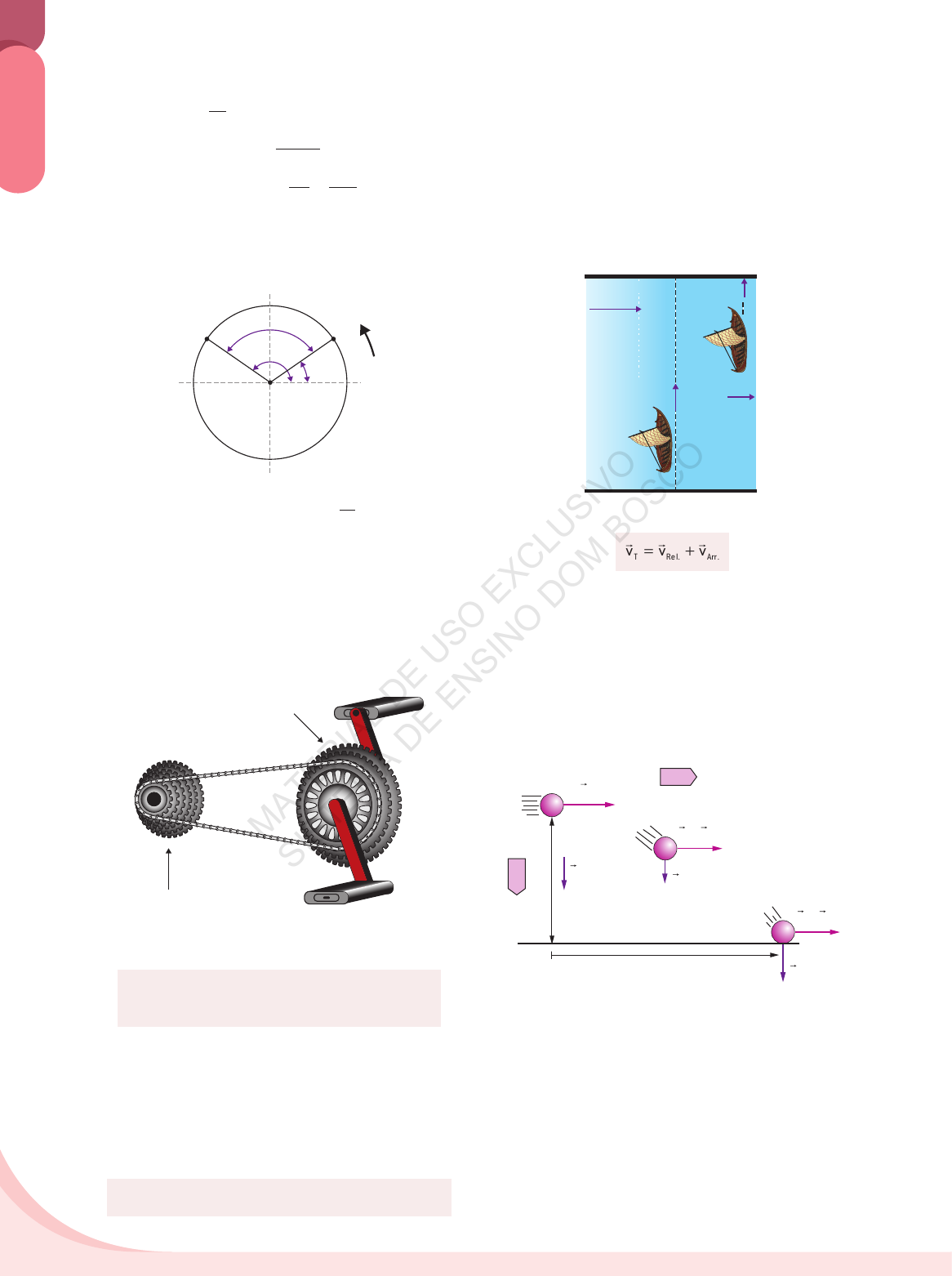 FÍ SI CA 66 • Frequência (ƒ) − número de voltas por unidade de tempo: f n t = ∆ . Unidade no SI: [f] = Hz (hertz) • Velocidade linear: v R T R f= ⋅ ⋅ = ⋅ ⋅ ⋅2 2p p • Velocidade angular: ω θ p p= = ⋅ = ⋅ ⋅∆ ∆t T f2 2 Unida- de no SI: [ω] = rad/s • Relação entre v e ω: v = ω · R • Função horária da fase (posição angular): θ = θ0 + ω · t t 0 t0 θ0 θ ∆θ • Vetor aceleração: at = 0 e a = ac = v2 R ; perpendicular ao vetor velocidade e orientado para o centro da trajetória. B.6. Movimentos concêntricos e transmissão de MCU As coroas e as catracas de uma bicicleta com marchas constituem um exemplo de movimentos concêntricos (mes- mo centro) e de transmissão de movimento circular por meio de uma corrente (coroa-catraca). 6 catracas 3 coroas Movimentos concêntricos (3 coroas ou 6 catracas): Todos os pontos das coroas (catracas) giram com a mesma velocidade angular (ω1 = ω2 = ω3). Quanto mais o ponto estiver afastado do centro de rotação, maior será a velocidade escalar. • Transmissão de MCU (coroa e catraca ligadas por cor- rente): coroa e catraca apresentam a mesma veloci- dade escalar: vcoroa = vcatraca ωcor. · Rcor. = ωcat. · Rcat. fcor. · Rcor. = fcat. · Rcat. A engrenagem de menor raio gira com maior frequência. B.7. Composição de movimentos O movimento de um corpo pode ser o resultado da com- posição de outros movimentos realizados simultaneamente (princípio da simultaneidade de Galileu). Exemplos: • Barco movimentando-se em um rio (velocidades constantes) − A velocidade do barco em relação à mar- gem ( vTotal) é a soma vetorial da velocidade do barco em relação às águas ( vRelativo) com a velocidade da corrente- za das águas em relação à margem ( vArrastamento): Margem Margem Rel�v Arr�v Correnteza Tv v v vT l Arr= +Re � � • Lançamento horizontal Na horizontal – o movimento é retilíneo e uniforme: a ve- locidade horizontal é constante, a aceleração escalar é igual a zero, e a função horária do espaço é dada por x = v0 · t. Na vertical – o movimento é de queda livre (MRV), com ve- locidade inicial v0 = 0, aceleração igual à aceleração de gravida- de e funções da velocidade (v = g · t), do espaço h = (g · t2)/2) e equação de Torricelli (v2 = 2 · g · h). v0 vy vy vx v0 g h MU M UV = vx v0= D Ilustração dos vetores velocidades em um lançamento horizontal. • Lançamento oblíquo Na horizontal – o movimento da bola é retilíneo e unifor- me. O componente horizontal da velocidade de lançamento da bola permanece constante. Na vertical – o movimento da bola é retilíneo uniforme- mente variado (retardado na subida e acelerado na descida). Trata-se de um lançamento vertical, no qual o módulo do com- ponente vertical da velocidade de lançamento da bola dimi- nui até zero (ponto de altura máxima) e aumenta até atingir o solo. 701360214 DB EM PV ENEM 91 AN LV 01 TE TEOR UN_MIOLO.indb 66 24/01/2019 09:05 MATERIA L D E U SO E XCLU SIV O SIS TEMA D E E NSIN O D OM B OSCO FÍ SI CA 67 y xv0x v0y vy vx v0x g= M U V MU θ Ilustração dos vetores velocidades em um lançamento oblíquo. v0x = v0 · cos θ e v0y = v0 · sen θ Movimento horizontal MUV ax = 0 vx = v0x (cte) x = v0x · t Movimento vertical MUV ay = –g vg = v0y – g · t y = v0y · t - g 2 · t2 B.8. Características dos movimentos Movimento Trajetória Retilínea Curvilínea Uniforme a a a v t c= ⇒ = =0 0 constante a a at c= ⇒ = ≠ = ° 0 0 90θ Acelerado a a ac t= ⇒ = ≠ = ° 0 0 0θ a at c≠ ≠ ° P ⇒ T = M · (g + a); • descendo acelerado ou subindo retardado: Tum deslocamento. • Força constante dA B θ F O trabalho de uma força constante é o produto da força ( F) pelo deslocamento (d ) e pelo cosseno do ângulo (θ) for- mado entre a força e o deslocamento: T = F · d · cos θ Unidade no SI: [T ] = joule (J) Dependendo do ângulo θ, o trabalho de uma força pode ser motor (T > 0), resistente (T