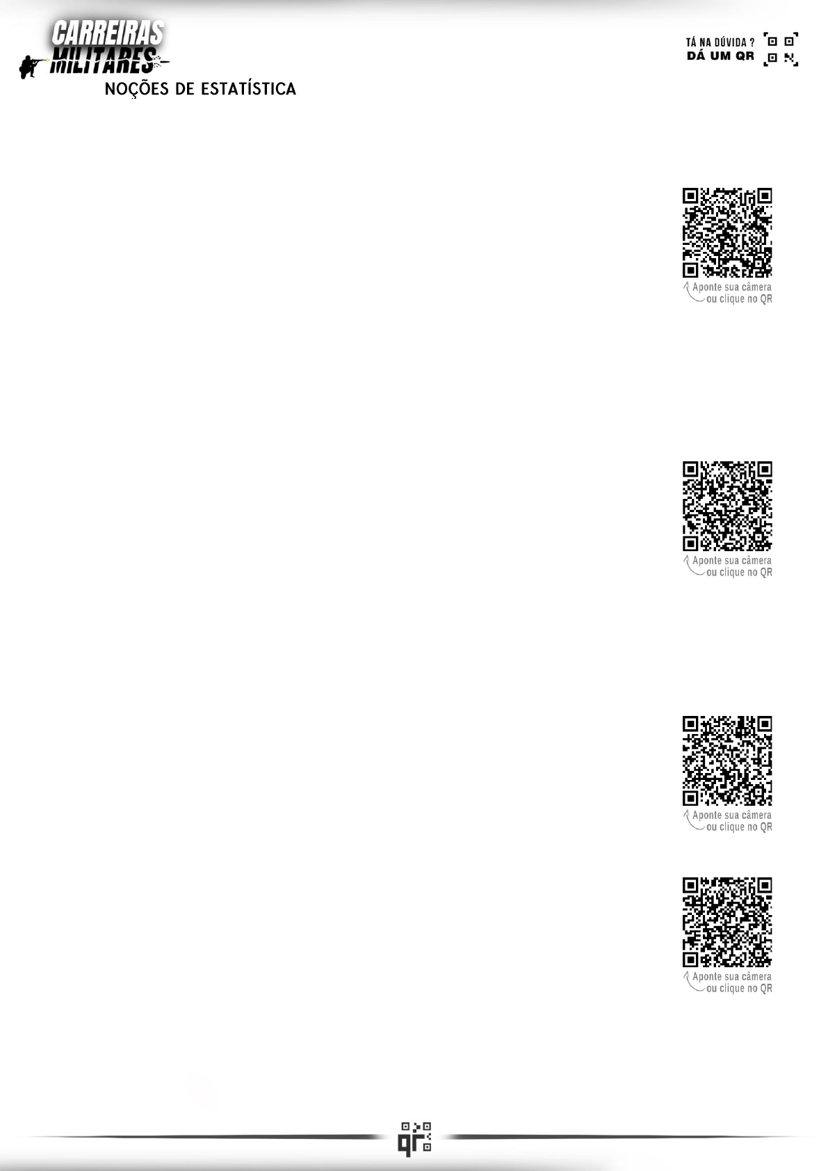 58 58 1) (PROVA – 2008) A média aritmética das notas de Matemática em uma turma de 25 alunos em um dos doze Colégios Militares existentes no Brasil diminui em 0,1, se alterarmos uma das notas para 6,8. A referida nota sem ser alterada é: A) 4,3 B) 8,8 C) 4,8 D) 9,3 E) 9,8 2) (PROVA – 2010) Numa sala de aula, a média das idades dos 50 alunos era de 22,5 anos. No cálculo da média, foram consideradas idades com anos completos. Transcorridas algumas semanas, houve a desistência de um aluno e a média das idades caiu para 22 anos. Considerando- se que nesse período nenhum dos alunos da turma fez aniversário, então a idade do aluno que desistiu é igual a: A) 47 anos. B) 45 anos. C) 37 anos. D) 35 anos. E) 27 anos. 3) (PROVA – 2011) Em uma turma a média aritmética das notas é 7,5. Sabe-se que a média aritmética das notas das mulheres é 8 e das notas dos homens é 6. Se o número de mulheres excede o de homens em 8, pode-se afirmar que o número total de alunos da turma é A) 4. B) 8. C) 12. D) 16. E) 20. 4) (PROVA – 2011) A média aritmética de n números é 29. Retirando-se o número 12 a média aumenta para 30. Podemos afirmar que o valor de n será A) 17. B) 11. C) 42. D) 41. E) 18. 5) (PROVA – 2012) A média aritmética de todos os candidatos de um concurso foi 9,0, dos candidatos selecionados foi 9,8 e dos eliminados foi 7,8. Qual o percentual de candidatos selecionados? https://app.metodoqr.com.br/curso-questao-video/9748 https://app.metodoqr.com.br/curso-questao-video/13299 https://app.metodoqr.com.br/curso-questao-video/13291 https://app.metodoqr.com.br/curso-questao-video/13292 59 59 A) 20% B) 25% C) 30% D) 50% E) 60% 6) (PROVA – 2013) Qual é a média de idade de um grupo em que há 6 pessoas de 14 anos, 9 pessoas de 20 anos e 5 pessoas de 16 anos? A) 17,2 anos B) 18,1 anos C) 17,0 anos D) 17,5 anos E) 19,4 anos 7) (PROVA – 2013) Identifique a alternativa que apresenta a frequência absoluta (fi) de um elemento (xi) cuja frequência relativa (fr) é igual a 25 % e cujo total de elementos (N) da amostra é igual a 72. A) 18. B) 36 C) 9. D) 54. E) 45. 8) (PROVA – 2015) O exército realizou um concurso de seleção para contratar sargentos e cabos. A prova geral foi igual para ambos. Compareceram 500 candidatos para sargento e 100 para cabo. Na prova, a média de todos os candidatos foi 4, porém, a média apenas entre os candidatos a sargento foi 3,8. Desse modo, qual foi a média entre os candidatos a cabo? A) 3,9 B) 1,0 C) 6,0 D) 4,8 E) 5 9) (PROVA – 2017) Uma pesquisa feita em uma Organização Militar constatou que as idades de 10 militares eram: 25, 20 30, 30, 23, 35, 22, 20, 30 e 25. Analisando essas idades, a média aritmética, a moda e a mediana, respectivamente, são: A) 25, 25, 30 B) 26, 30, 20 C) 35, 20, 25 D) 26, 30, 25 E) 25, 30, 26 https://app.metodoqr.com.br/curso-questao-video/13284 https://app.metodoqr.com.br/curso-questao-video/9738 https://app.metodoqr.com.br/curso-questao-video/9739 https://app.metodoqr.com.br/curso-questao-video/13264 https://app.metodoqr.com.br/curso-questao-video/13273 60 60 GABARITO “Não somos responsáveis apenas pelo que fazemos, mas também pelo que deixamos de fazer”. (Moliere) 1 – D 4 – E 7 – A 2 – A 5 – E 8 – E 3 – D 6 – A 9 – D