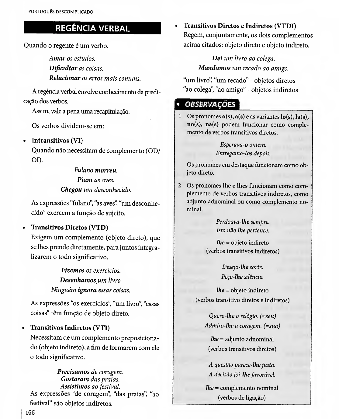 PORTUGUÊS DESCOMPLiCADO REGÊNCIA VERBAL Quando o regente é um verbo. Amar os estudos. Dificultar as coisas. Relacionar os erros mais comuns. A regência verbal envolve conhecimento da predi- cação dos verbos. Assim, vale a pena uma recapitulação. Os verbos dividem-se em: • Intransitivos (VI) Quando não necessitam de complemento (OD/ OI). Fulano morreu. Piam as aves. Chegou um desconhecido. As expressões "fulano", "as aves", "um desconhe- cido" exercem a função de sujeito. • Transitivos Diretos (VTD) Exigem um complemento (objeto direto), que se lhes prende diretamente, para juntos integra- lizarem o todo significativo. Fizemos os exercícios. Desenhamos um livro. Ninguém ignora essas coisas. As expressões "os exercícios", "um livro", "essas coisas" têm função de objeto direto. • Transitivos Indiretos (VTI) Necessitam de um complemento preposiciona- do (objeto indireto), a fim de formarem com ele o todo significativo. Precisamos de coragem. Gostaram das praias. Assistimos ao festival. As expressões "de coragem", "das praias", "ao festival" são objetos indiretos. 166 • Transitivos Diretos e Indiretos (VTDI) Regem, conjuntamente, os dois complementos acima citados: objeto direto e objeto indireto. Dei um livro ao colega. Mandamos um recado ao amigo. "um livro", "um recado" - objetos diretos "ao colega", "ao amigo" - objetos indiretos 1 Os pronomes ojs), a(s) e as variantes lo(s), la(s), no(s), na(s) podem funcionar como comple- mento de verbos transitivos diretos. Esperava-o ontem. Entregamo-los depois. Os pronomes em destaque funcionam como ob- jeto direto, 2 Os pronomes lhe e lhes funcionam como com- plemento de verbos transitivos indiretos, como adjunto adnominal ou como complemento no- minal. Perdoava-lhe sempre. Isto não lhe pertence. lhe = objeto indireto (verbos transitivos indiretos) Desejo-lhe sorte. Peço-lhe silêncio. lhe = objeto indireto (verbos transitivo diretos e indiretos) Quero-lhe o relógio. (=seu) Admiro-lhe a coragem. (=sua) lhe = adjunto adnominal (verbos transitivos diretos) A questão parece-lhe justa. A decisão foi-lhe favorável. lhe = complemento nominal (verbos de ligação) FLÁVIA RITA COUTINHO SARMENTO 3 Os pronomes me, te, se, nos, vos podem tam- bém servir como complementos de verbos transitivos diretos, transitivos indiretos, transi- tivos diretos e indiretos e como adjuntos adno- minais ou como complementos nominais. Eu vejo-te amanhã. Ele feriu-se todo. pronomes; OD / verbos; TD Pago-vos amanhã. Ela nos obedeceu. pronomes; OI / verbos; TI Pegou-me a mão. (=minha) Quer-nos a casa. (=nossa) pronomes: ADJ.ADN. / verbos: TD Dê-nos dinheiro. Peço-te licença. pronomes: OI / verbos: TDI 4 As formas lho, lha, lhos, lhas são complemen- tos de verbos transitivos diretos e indiretos, bem como servem de adjunto adnominal. A blusa? Em casa lha dou. fí [= Em casa, darei a blusa a você. lha = lhe (OI) + a (OD) (= a você) (= a blusa) Não lhe sei o nome, nem que lho soubesse o diria. í\ [= Nem que soubesse o seu nome o diria.] lho = lhe (ADJ. ADN.) + o (OD) (= seu) (= o nome) 5 Há verbos transitivos indiretos que não se usam com o pronome lhe, mas com os pronomes oblíquos tônicos ele, ela, eles, elas, antecedidos da preposição a: aludir, aspirar (-desejar), assis- tir (=ver), tomar, recorrer, preferir, proceder, visar (-desejar). Aludimos à religião. Aludimos a ela. Aspiramos a um cargo. Aspiramos a ele. Assistiram aos jogos. Assistiram a eles. Recorri ao diretor. Recorri a ele. Procederam ao sorteio. Procederam a ele. Viso a um cargo. Viso a ele. REGÊNCIA DE ALGUNS VERBOS A aborrecer-se com abster-se de aconselhar-se a / com ajuntar-se com almejar por antecipar-se a apegar-se a apiedar-se de aproximar-se a / de assentir a atentar contra / em atrair a aviar-se de absolver de acercar-se de ajuntar a amercear-se de apaixonar-se por apelar para apoderar-se de arriscar-se a assinalar com ater-se a ausentar-se de avir-se com acautelar-se com acomodar-se a admirar-se de alimentar com / de amoíinar-se com apartar de aperceber-se de apressar-se a / em / por assemelhar a / com atinar com autorizar a avizinhar-se de B bandear-se para bastar a brigar com blasfemar contra batalhar com brindar com bater em / a bater (TD) baixar a bater a (TI) brindar (TD) 167 PORTUGUÊS DESCOMPÜCADO cair em / sobre comprazer-se em/com casar-se com comungar com chamar por / de condescender com cingir de consentir em clamar por contribuir para / com coincidir com corresponder-se com combinar com coxear de comerciar com / em curtir-se em competir com carecer de comprometer-se a certificar-se de concorrer a / com chegar-se a conformar-se com / a circunscrever a contrapor a coexistir com convir com / a / em combater contra cotejar com comedir-se em cruel com / para com compelir a capitular com comprazer a ceder a comutar em chamar (TD) condoer-se de cingir-se a conter-se em cobrir de converter em / a coligar-se com corresponder a começar a / por cristalizar em comparar a / com curar-se de D decidir-se sobre deter-se em / com dependurar em / de distrair-se com desempenhar-se de deleitar-se com / em / de discrepar em desavir-se com decidir sobre dignar-se de / a desapegar-se de dotar com / em E embaraçar-se com engalanar-se com / em entreter-se com especular com / em enfurecer-se com / contra exceder a / em envaidecer-se com / por engolgar-se com estimular a / com excusar de estribar-se em exercitar-se em empenhar-se por / em / com ensaiar-se em / com esforçar-se em / por / para faltar com / a fiar-se de / em feder a franquear de / a fartar com / de gabar-se de guardar-se de gloriar-se de folgar de / com fincar-se em / de fatigar-se de / com fundar-se em forrar de / com guarnecer com graduar-se em guindar-se a H habilitar-se com / para haver-se com herdar de hombrear-se com harpejar humilhar-se a I impenetrável a induzir a / em irmanar com intrometer-se em incorrer em igualar com incidir em insistir sobre / em imbuir-se de / em impor a inferir de int