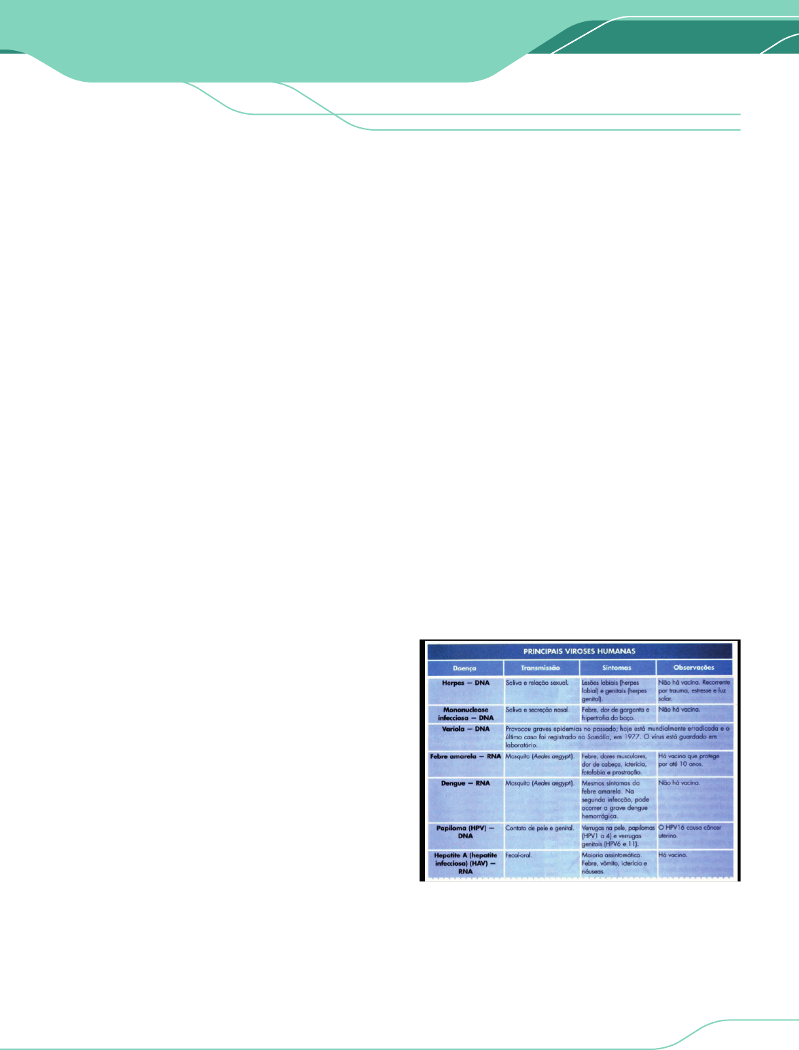 BIOLOGIA I MEDICINA ENEM 1PROENEM.COM.BR 07 PRINCIPAIS VIROSES São doenças causadas por vírus que podem ser transmitidos pelo ar, água, relação sexual, através de objetos contaminados e através de vetores. Algumas doenças possuem com prevenção a vacinação outras ainda não foram criadas vacinas. POLIOMIELITE É uma doença muito grave que pode levar à paralisia dos membros inferiores e até à morte dos portadores, também chamada de paralisia infantil. A contaminação ocorre pela ingestão de água e alimentos contaminados com coliformes fecais, além das fezes e secreções dos contaminados (espirro, tosse, saliva, etc.), sendo muito contagiosa, logo, as pessoas que contraíram o vírus devem permanecer afastadas durante o tratamento. Os sintomas podem surgir cerca de três dias depois de contraído o vírus, sendo que os principais são febre baixa, diarreia, fadiga, náuseas e vômitos, dor de cabeça e garganta, sendo a prevenção através de vacinação. AIDS OU SIDA A Síndrome da imunodeficiência adquirida causada pelo vírus HIV, causa uma queda no sistema imunológico, uma vez que os vírus se reproduzem em nossas células de defesa, chamadas de linfócitos T auxiliares(CD4), responsáveis por coordenar as defesas do organismos, como por exemplo estimular a produção de anticorpos pelos linfócitos B. Quando o número destes linfócitos diminui, ocorre um colapso no sistema imune, que abre caminho para doenças oportunistas e tumores que podem provocar a morte do indivíduo. O contágio pode ocorrer de diversas formas como através da relação sexual desprotegida, uso de objetos cortantes compartilhados, transfusão de sangue, placenta, leite materno, caso a mãe esteja contaminada. Os sintomas mais comuns são febre, dor de garganta e muscular, gânglios e ínguas, manchas na pele etc. FEBRE AMARELA É transmitida pela picada do Aedes aegypti, não ocorrendo a transmissão direta de pessoa a pessoa, o vírus afeta o fígado e diversos outros órgãos ,podendo levar à morte. Vale ressaltar que os macacos não transmitem os vírus, mas sim os mosquitos. A forma de prevenção é a vacinação. Os principais sintomas são febre, forte dor de cabeça , dores nas costas, dores musculares, vômitos e fraqueza. HEPATITE A hepatite viral é uma inflamação no fígado podendo ser do tipo A, B, C, D, sendo a vacina uma forma de prevenção contra o vírus causador da hepatite A e B, no entanto a vacina contra o tipo B também protege contra a hepatite D; não havendo vacina para a hepatite C. A hepatite A é transmitida através da ingestão de água e alimentos contaminados, porem a hepatite B, C e D é transmitida pelo sangue, sexo desprotegido ou compartilhar seringas, agulhas, lâminas de barbear, alicates de unha e outros objetos que furam ou cortam, também pode ocorrer da mãe para o filho durante a gravidez, no parto e na amamentação. Os sintomas são bem semelhantes e podem causar dor abdominal, fadiga, febre, perda de apetite e peso, amarelamento dos olhos e da pele, náusea, vômito etc. RAIVA É transmitida através do contato com a saliva de animais contaminados, através de lambidas ou mordidas. O vírus se espalha pelo sistema nervoso do novo hospedeiro, atingindo diversos órgãos e se proliferando nas glândulas salivares, os sintomas surgem cerca de a 10 a 90 dias. Os animais contaminados apresentam alteração comportamental, mudanças de hábitos, salivação excessiva, latidos ou miados com maior frequência e agressividade, com o agravamento do quadro, o animal passa a ter os músculos rígidos, fazendo com que tenha dificuldade para deglutir e mastigar, causando a famosa “boca espumando”, já que não consegue engolir a saliva. A prevenção consiste na vacinação dos animais, porém caso uma pessoa seja mordida por um animal contaminado, esta deverá tomar o soro antirrábico. GRIPE É uma doença causada pelo vírus influenza, transmitida pelo ar e objetos contaminados, sendo os sintomas calafrios, febre, dores de garganta, dores musculares, dores de cabeça, tosse, fadiga etc. Como prevenção algumas medidas podem ser tomadas como evitar manter contato muito próximo com uma pessoa que esteja infectada, lavar sempre as mãos com água e sabão e evite levar as mãos ao rosto e, principalmente, à boca, não compartilhe utensílios de uso pessoal, como toalhas, copos, talheres e travesseiros. A vacina da gripe previne aproximadamente 70-90% dos casos de gripe. https://www.slideshare.net/alexandrefalchi/2011-viroses-16951789/45 MEDICINA ENEMPROENEM.COM.BR2 BIOLOGIA I 07 PRINCIPAIS VIROSES 01. (ENEM) Na família Retroviridae encontram-se diversos vírus que infectam aves e mamíferos, sendo caracterizada pela produção de DNA a partir de uma molécula de RNA. Alguns retrovírus infectam exclusivamente humanos, não necessitando de outros hospedeiros, reservatórios ou vetores biológicos. As infecções ocasionadas por esses vírus vêm causando mortes e grandes prejuízos ao desenvolvimento social e econômico. Nesse contexto, pesquisadores têm produzido medicamentos que contribuem para o tratamento dessas doenças. Que avanços tecnológicos têm contribuído para o tratamento dessas infecções virais? a) Melhoria dos métodos de controle dos vetores desses vírus. b) Fabricação de soros mutagênicos para combate desses vírus. c) Investimento da indústria em equipamentos de proteção individual. d) Produção de vacinas que evitam a infecção das células hospedeiras. e) Desenvolvimento de antirretrovirais que dificultam a reprodução desses vírus. Resolução: E O desenvolvimento de vacinas contra vírus portadores de RNA é complexo e difícil, porque esses agentes patogênicos são altamente mutagênicos. Os avanços tecnológicos para o tratamento das infecções viróticas é a criação de antirretrovirais que vão dificultar a multiplicação desses vírus. EXERCÍCIO RESOLVIDO 02. (ENEM) Durante as estações chuvo