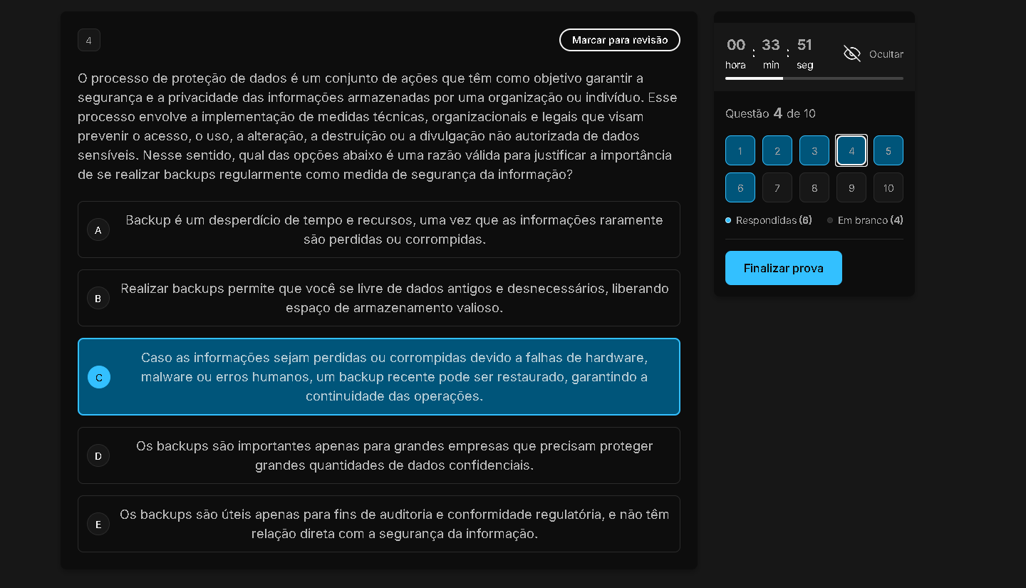 4 Marcar para revisão 00 33 51 : : Ocultar hora min seg O processo de proteção de dados é um conjunto de ações que têm como objetivo garantir a segurança e a privacidade das informações armazenadas por uma organização ou indivíduo. Esse processo envolve a implementação de medidas técnicas, organizacionais e legais que visam Questão 4 de 10 prevenir acesso, uso, a alteração, a destruição ou a divulgação não autorizada de dados Nesse sentido, qual das opções abaixo é uma razão válida para justificar a importância 1 2 3 4 5 de se realizar backups regularmente como medida de segurança da informação? 6 7 8 g 10 Backup é um desperdício de tempo e recursos, uma vez que as informações raramente Respondidas (6) Em branco (4) A são perdidas ou corrompidas. Finalizar prova Realizar backups permite que você se livre de dados antigos e desnecessários, liberando espaço de armazenamento Caso as informações sejam perdidas ou corrompidas devido a falhas de hardware, C malware ou erros humanos, um backup recente pode ser restaurado, garantindo a continuidade das operações. Os backups são importantes apenas para grandes empresas que precisam proteger D grandes quantidades de dados confidenciais. Os backups são úteis apenas para fins de auditoria e conformidade regulatória, e não têm E relação direta com a segurança da informação.