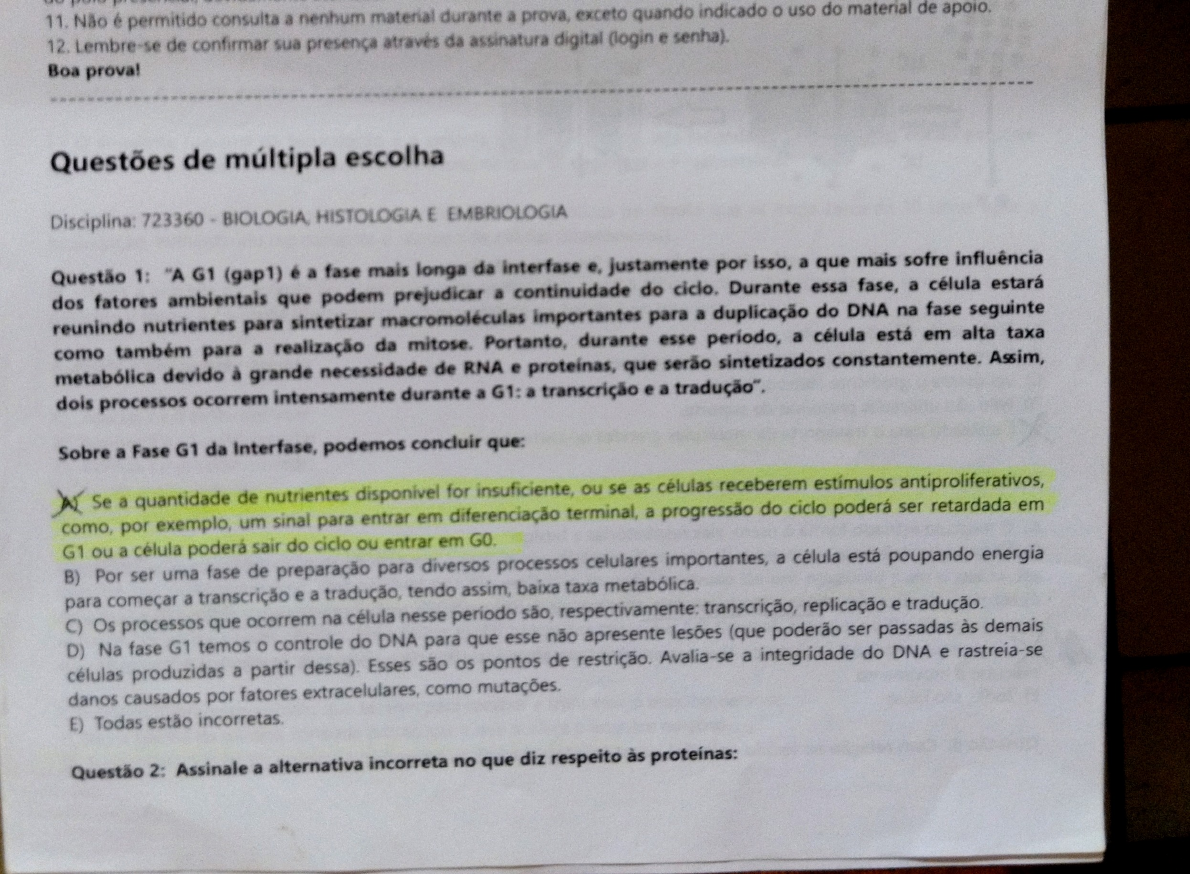 11. Não é permitido consulta a nenhum material durante a prova, exceto quando indicado o uso do material de apoio. 12. Lembre-se de confirmar sua presença através da assinatura digital (login e senha). Boa proval Questões de múltipla escolha Disciplina: 723360 HISTOLOGIA E EMBRIOLOGIA Questão 1: "A G1 (gap1) é a fase mais longa da interfase e, justamente por isso, a que mais sofre influência dos fatores ambientais que podem prejudicar a continuidade do ciclo. Durante essa fase, a célula estará reunindo nutrientes para sintetizar importantes para a duplicação do DNA na fase seguinte como também para a realização da mitose. Portanto, durante esse período, a célula está em alta taxa metabólica devido à grande necessidade de RNA e proteínas, que serão sintetizados constantemente. Assim, dois processos ocorrem intensamente durante a G1: a transcrição e a tradução". Sobre a Fase G1 da Interfase, podemos concluir que: Se a quantidade de nutrientes disponível for insuficiente, ou se as células receberem estímulos antiproliferativos, como, por exemplo, um sinal para entrar em diferenciação terminal, a progressão do ciclo poderá ser retardada em G1 ou a célula poderá sair do ciclo ou entrar em GO. B) Por ser uma fase de preparação para diversos processos celulares importantes, a célula está poupando energia para começar a transcrição e a tradução, tendo assim, baixa taxa metabólica. C) Os processos que ocorrem na célula nesse são, transcrição, replicação e tradução. D) Na fase G1 temos o controle do DNA para que esse não apresente lesões (que poderão ser passadas às demais células produzidas a partir dessa). Esses são os pontos de restrição. Avalia-se a integridade do DNA e rastreia-se danos causados por fatores extracelulares, como mutações. E) Todas estão incorretas. Questão 2: Assinale a alternativa incorreta no que diz respeito às proteínas:A) Sua estrutura pode apresentar-se de 4 formas: primária, terciária e C) São macromoléculas formadas por aminoácidos Todas as proteínas são enzimas D) Estão presentes na membrana celular. Podem como catalisadoras de reações químicas. E) 3: agir A membrana células é uma bicamada com entrada hidrofilicas de substâncias e benéficas A a membrana ela, é como tem Questão a função de proteger Essa a célula característica da entrada da de célula invasores chama-se e permitir permeabilidade a seletiva. A membrana não permitindo nutrientes, por que exemplo. haja movimentos em sua extensão, para a entrada e saída dessas Sobre o texto, assinale a alternativa que explica o movimento de pinocitose: É o movimento que a célula faz para permitir a entrada de uma dentro de si. Ela produz um canal B) para É que o movimento que a célula faz para a saída de substâncias sólida da célula. Ela produz um canal que expulsa a molécula entre na célula, fundindo suas bordas para englobá-la. a molécula C) É o movimento para fora. que a célula faz para englobar uma partícula sólida para dentro de si. Ela cria pseudópodes para envolver a substância, colocando-a para dentro da célula. D) É o movimento que a célula faz para permitir a saída de uma partícula líquida para fora da célula. Nesse processo ela cria fagossomos que digerem a partícula líquida e a expulsam. E) Todas as alternativas estão incorretas. Questão 4: Observe a figura a seguir: LEC LEC Membrana plasmática LIC LIC Assinale a alternativa que está relacionada com a imagem anterior: A) Trata-se de difusão simples. B) É uma difusão facilitada por auxílio de perméases. C) Vai contra o gradiente eletroquímico. D) Não são utilizadas proteínas de suporte. É utilizado para o transporte de grandes ou carregadas. Questão 5: Assinale a alternativa correta: A) o músculo estriado forma o útero, vias respiratórias e bexiga. B) o coração é feito de um músculo chamado estriado cardíaco, só encontrado no coração e com movimento voluntário. C) o músculo liso tem movimento involuntário, como os movimentos do estômago e intestino, responsáveis pela digestão. o músculo estriado esquelético tem movimento involuntário, ou seja, funciona sem que se precise pensar em executar o movimento. E) Todas são falsas Questão 6: Com relação ao tecido epitelial, considere as afirmativas a seguir:intestino o epitélio de revestimento com comum relacionados com como o As formadas pelo epitélio que secretor o ou seja, eliminam apenas a permanecendo epitélio estratificado queratinizado apresenta uma única camada de As epiteliais recebem a sua nutrição a partir do tecido conjuntivo que que Denominamos aquelas que lançam parte de seus produtos de secreção sanguinea e parte em cavidades ou na superficie do corpo. se todas forem B) se todas forem se e III forem se IV e V forem E) se e IV forem Questão 7: As células portam-se de maneiras diferentes quanto à possibilidade de realizarem mitose. Algumas não se dividem, outras fazem isso tempo todo. Assinale a alternativa que contém as células que se reproduzem para acompanhar o crescimento de um órgão no período de Essas células são encontradas no músculo esquelético liso e no endotélio do cristalino. A) Células estáticas Células em renovação lenta C) Células em renovação D) Células em renovação rápida E) Células estáveis Questão 8: A seguir existem 3 afirmações sobre Embriologia: ambiente habitual da fecundação é a ampola tubária. Caso não seja fecundado nesse local, o oócito percorre lentamente a tuba uterina até a cavidade do útero, na qual se degenera e é reabsorvido. - A clivagem constitui uma série de repetidas divisões mitóticas do zigoto que se inicia cerca de 30 horas após a fecundação, aumentando rapidamente o número de células (blastômeros). III Após a entrada da mórula no útero, cerca de quatro dias após a o líquido uterino atravessa a zona e forma a cavidade (espaço repleto de líquido) no i