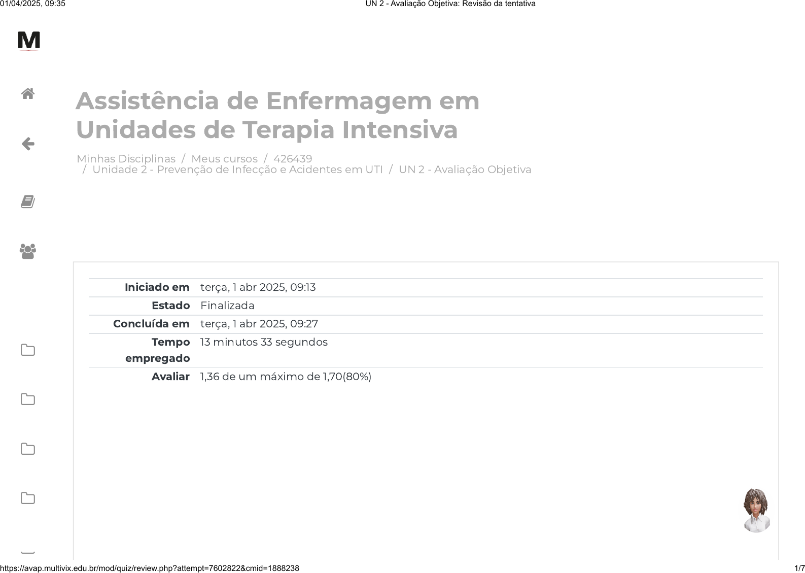 Minhas Disciplinas / Meus cursos / 426439 / Unidade 2 - Prevenção de Infecção e Acidentes em UTI / UN 2 - Avaliação Objetiva Assistência de Enfermagem em Unidades de Terapia Intensiva Iniciado em terça, 1 abr 2025, 09:13 Estado Finalizada Concluída em terça, 1 abr 2025, 09:27 Tempo empregado 13 minutos 33 segundos Avaliar 1,36 de um máximo de 1,70(80%) 01/04/2025, 09:35 UN 2 - Avaliação Objetiva: Revisão da tentativa https://avap.multivix.edu.br/mod/quiz/review.php?attempt=7602822&cmid=1888238 1/7 https://avap.multivix.edu.br/my/ https://avap.multivix.edu.br/course/view.php?id=33578 https://avap.multivix.edu.br/course/view.php?id=33578§ion=3 https://avap.multivix.edu.br/mod/quiz/view.php?id=1888238 https://avap.multivix.edu.br/my/ https://avap.multivix.edu.br/course/view.php?id=33578 https://avap.multivix.edu.br/user/index.php?id=33578 https://avap.multivix.edu.br/course/view.php?id=33578§ion=1 https://avap.multivix.edu.br/course/view.php?id=33578§ion=2 https://avap.multivix.edu.br/course/view.php?id=33578§ion=3 https://avap.multivix.edu.br/course/view.php?id=33578§ion=4 https://avap.multivix.edu.br/course/view.php?id=33578§ion=5 https://avap.multivix.edu.br/ https://avap.multivix.edu.br/ https://avap.multivix.edu.br/ https://avap.multivix.edu.br/ https://avap.multivix.edu.br/ https://avap.multivix.edu.br/ https://avap.multivix.edu.br/ https://avap.multivix.edu.br/ Questão 1 Correto Atingiu 0,34 de 0,34 O controle comunitário de vetores e reservatórios é essencial para a prevenção de zoonoses virais. A vacinação de cães e gatos contra a Raiva e o controle de populações de roedores e morcegos são estratégias preventivas eficazes, especialmente em áreas urbanas e rurais. BRASIL. Ministério da Saúde. Secretaria de Vigilância em Saúde. Guia de vigilância em saúde. 5. ed. Brasília: Ministério da Saúde, 2022. Considerando o texto apresentado, avalie as asserções a seguir e a relação proposta entre elas. I. A vacinação de cães e gatos é uma medida importante para prevenir a transmissão da Raiva para humanos. PORQUE II. O vírus da Raiva é transmitido apenas por animais silvestres, como morcegos e raposas, não afetando animais domésticos. A respeito dessas asserções, assinale a opção correta. Escolha uma opção: a. As asserções I e II são proposições verdadeiras, mas a II não é uma justificativa correta da I. b. As asserções I e II são proposições falsas. c. A asserção I é uma proposição falsa, e a II é uma proposição verdadeira. d. As asserções I e II são proposições verdadeiras, e a II é uma justificativa correta da I. e. A asserção I é uma proposição verdadeira e a II é uma proposição falsa. 01/04/2025, 09:35 UN 2 - Avaliação Objetiva: Revisão da tentativa https://avap.multivix.edu.br/mod/quiz/review.php?attempt=7602822&cmid=1888238 2/7 https://avap.multivix.edu.br/ https://avap.multivix.edu.br/ https://avap.multivix.edu.br/ https://avap.multivix.edu.br/ https://avap.multivix.edu.br/ https://avap.multivix.edu.br/ https://avap.multivix.edu.br/ https://avap.multivix.edu.br/ Questão 2 Incorreto Atingiu 0,00 de 0,34 As hepatites virais e zoonoses como Raiva, Hantavirose e Monkeypox são doenças de importância na saúde pública devido à sua transmissão de pessoa para pessoa ou de animais para humanos. O diagnóstico precoce e a prevenção, seja por vacinação ou controle de vetores, são fundamentais para reduzir surtos e minimizar complicações. BRASIL. Ministério da Saúde. Secretaria de Vigilância em Saúde. Protocolo clínico e diretrizes terapêuticas para hepatites virais. Brasília: Ministério da Saúde, 2021. Disponível em: https://www.gov.br/aids/pt-br/central-de-conteudo/pcdts. Acesso em: 19 set. 2024. Considerando o texto apresentado, avalie as afirmações a seguir. I. A vacinação contra Hepatite B protege também contra a Hepatite C. II. O contato com roedores é a principal forma de transmissão da Hantavirose para humanos. III. A Raiva humana é invariavelmente fatal se não tratada antes do início dos sintomas. É correto o que se afirma em: Escolha uma opção: a. II, apenas. b. I, apenas. c. I e III, apenas. d. III, apenas. e. I e II, apenas. 01/04/2025, 09:35 UN 2 - Avaliação Objetiva: Revisão da tentativa https://avap.multivix.edu.br/mod/quiz/review.php?attempt=7602822&cmid=1888238 3/7 https://www.gov.br/aids/pt-br/central-de-conteudo/pcdts https://avap.multivix.edu.br/ https://avap.multivix.edu.br/ https://avap.multivix.edu.br/ https://avap.multivix.edu.br/ https://avap.multivix.edu.br/ https://avap.multivix.edu.br/ https://avap.multivix.edu.br/ https://avap.multivix.edu.br/ Questão 3 Correto Atingiu 0,34 de 0,34 As hepatites virais transmitidas por contato sexual, como HBV, HCV e HDV, são de grande preocupação em saúde pública devido às complicações que podem causar a longo prazo, incluindo cirrose e carcinoma hepatocelular. A vacinação e o uso de antivirais são algumas das principais estratégias para prevenir a disseminação dessas infecções. BRASIL. Ministério da Saúde. Secretaria de Vigilância em Saúde. Protocolo clínico e diretrizes terapêuticas para hepatites virais. Brasília: Ministério da Saúde, 2021. Disponível em: https://www.gov.br/aids/pt-br/central-de-conteudo/pcdts. Acesso em: 19 set. 2024. Classifique as afirmações a seguir como falsas (F) ou verdadeiras (V): I. ( ) A Hepatite C é principalmente transmitida pelo contato sexual, sendo mais comum em pessoas com múltiplos parceiros. II. ( ) A Hepatite B pode ser transmitida de mãe para filho durante o parto, além de ser sexualmente transmissível. III. ( ) A coinfecção com Hepatite D só ocorre em pacientes previamente infectados com Hepatite B. Assinale a alternativa com a sequência correta. Escolha uma opção: a. V, V, F. b. V, F, V. c. F, F, V. d. F, V, V. 01/04/2025, 09:35 UN 2 - Avaliação Objetiva: Revisão da tentativa https://avap.multivix.edu.br/mod/quiz/r