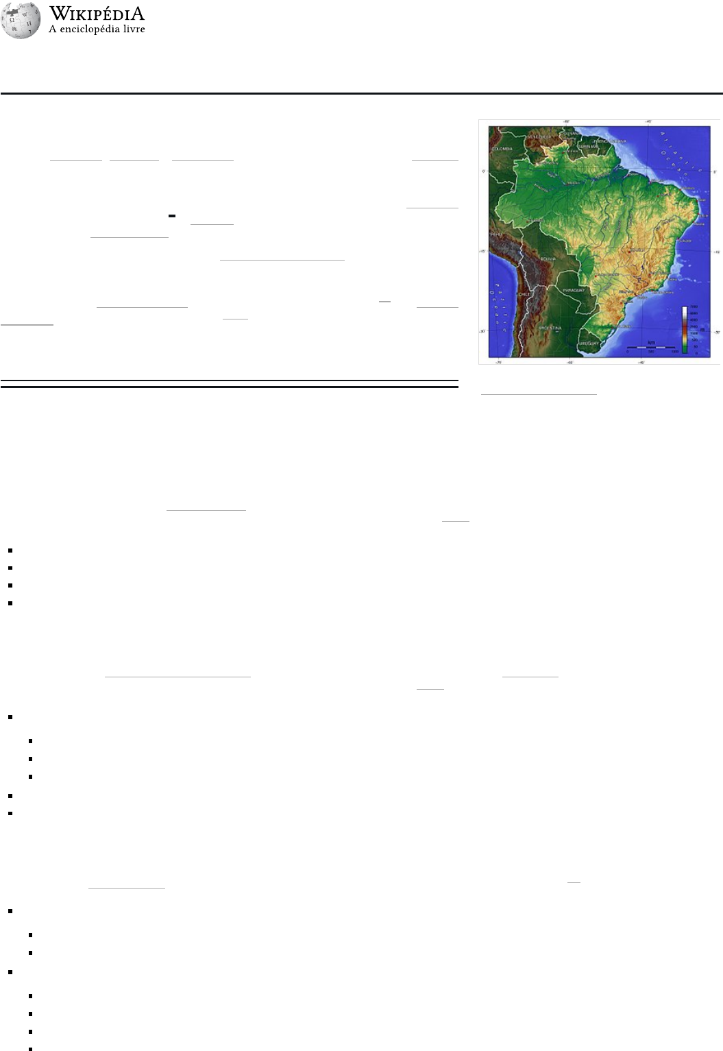 Carta topográfica do Brasil, representando a altimetria ou hipsometria. Relevo do Brasil O relevo do Brasil tem formação muito antiga, resultando principalmente de atividades internas do planeta Terra e de vários ciclos climáticos. Apresenta diversos planaltos, planícies e depressões, decorrentes das formações da litosfera no Brasil. O Brasil é um país de altitudes modestas: cerca de 40% do seu território encontra-se abaixo de 200 m de altitude, 45% entre 200 e 600 m, e 12%, entre 600 e 900 m.[carece de fontes?] O território não apresenta grandes formações montanhosas, pois não existe nenhum dobramento moderno em seu território. Os pontos mais altos do relevo brasileiro (que, no geral, é marcado por baixas altitudes) são: o Pico da Neblina (com 2995,3 metros de altitude)[1] e o Pico 31 de Março (com 2974,18 m. de altitude).[2][1] A seguir, são apresentadas de maneira geral algumas classificações antigas do relevo brasileiro, seguidas das classificações mais recentes de Ab'Saber e Ross, descritas em maiores detalhes. Embora o esquema do padre Aires de Casal (1817), um dos primeiros a tratar do assunto do relevo do Brasil, não tenha tido boa aceitação no país, nele são distinguidas, de modo sintético, quatro "serranias":[3][4] a serrania da Borborema (ou dos Cariris) a serrania da Mantiqueira; a serrania dos Órgãos (ou dos Aimorés) a serrania da Mangabeira (ou do Paraná) A classificação de Alexander von Humboldt (1825), baseada em parte nos trabalhos de Eschwege, teve boa aceitação ao longo do século XIX, e definiu as seguintes unidades para o território brasileiro:[5][6] o grupo das montanhas do Brasil, composto por três grandes cadeias paralelas, dispostas no sentido norte-sul: a cadeia oriental: Serra do Mar a cadeia central: Serra do Espinhaço e Serra da Mantiqueira a cadeia ocidental: a imaginária Serra das Vertentes as planícies do Amazonas as planícies dos pampas De acordo com Orville Derby (1884), foram estabelecidas as seguintes unidades físicas para o Brasil:[7] Regiões montanhosas Cadeia oriental ou marítima Cadeia central ou goiana Chapadões Chapadão do Paraná Chapadão do Amazonas Chapadão do São Francisco Chapadão do Parnaíba Classificações Aires de Casal (1817) Humboldt (1825) Derby (1884) 01/04/2025, 10:10 Relevo do Brasil – Wikipédia, a enciclopédia livre https://pt.wikipedia.org/wiki/Relevo_do_Brasil 1/9 https://pt.wikipedia.org/wiki/Ficheiro:Brazil_topo.jpg https://pt.wikipedia.org/wiki/Ficheiro:Brazil_topo.jpg https://pt.wikipedia.org/wiki/Altimetria https://pt.wikipedia.org/wiki/Wikip%C3%A9dia:P%C3%A1gina_principal https://pt.wikipedia.org/wiki/Planalto https://pt.wikipedia.org/wiki/Plan%C3%ADcie https://pt.wikipedia.org/wiki/Depress%C3%A3o_(geografia) https://pt.wikipedia.org/wiki/Litosfera https://pt.wikipedia.org/wiki/Territ%C3%B3rio https://pt.wikipedia.org/wiki/Altitude https://pt.wikipedia.org/wiki/Wikip%C3%A9dia:Livro_de_estilo/Cite_as_fontes https://pt.wikipedia.org/wiki/Dobramento_moderno https://pt.wikipedia.org/wiki/Pico_da_Neblina https://pt.wikipedia.org/wiki/Pico_31_de_Mar%C3%A7o https://pt.wikipedia.org/wiki/Pico_31_de_Mar%C3%A7o https://pt.wikipedia.org/wiki/Aires_de_Casal https://pt.wikipedia.org/wiki/Alexander_von_Humboldt https://pt.wikipedia.org/wiki/Wilhelm_Ludwig_von_Eschwege https://pt.wikipedia.org/wiki/Orville_Derby Planalto da Guiana Depressões Depressão do Amazonas Depressão do Paraguai Região atlântica A classificação de O. D. Von Engeln (1942) foi a primeira realizada para a América do Sul como um todo.[8][9] Nela, o território do Brasil abrange as seguintes unidades geomorfológicas, no original em inglês: A-1, Coastal Plains A-2, Piemont Plains A-4, Fluvial, Lacustrine and Deltaic Plains B-8, Interior Plateaus B-9, Open Basins with Centripetal Dips B-10, Lava Flow Plains and Plateaus E-17, Ancient Igneous Masses Aroldo de Azevedo (1949) reconheceu as seguintes unidades principais no conjunto do relevo brasileiro:[10] 1. Planalto Brasileiro a. Planalto Atlântico Serras Cristalinas: Serra do Mar (com suas diversas denominações locais), Paranapiacaba, Mantiqueira e Espinhaço Planalto Cristalinos: Planalto Nordestino (incluindo Borborema), Chapada Diamantina (Planalto Baiano), Planalto do Sul de Minas (ou do Alto Rio Grande) e Planalto do Pampa b. Planalto Central Escudo Sul-Antagónico (ou Bóreo-Brasília) Escudo Araguaio-Tocantino c. Planalto Meridional Depressão Periférica: Depressão Paulista, Planalto dos Campos-Gerais (ou Segundo Planalto paranaense), Depressão do Jacuí (no Rio Grande do Sul) Planalto Arenito-Basáltico: “cuestas” (serras de Maracaju, Caiapó, Itaquerí, São Pedro, Botucatu, Fartura, Esperança, Geral, Botucaraí, São Xavier, etc.), Planalto do Alto Paraná, Triângulo Mineiro, Planalto Ocidental de São Paulo, sudeste de Mato-Grosso, Planalto de Guarapuava (ou Terceiro Planalto paranaense), Planalto do Alto Uruguai (ou das Missões) 2. Planalto das Guianas 3. Planície Amazônica 4. Planície do Alto Paraguai ou do Pantanal 5. Planícies Costeiras Segundo com a classificação do geógrafo paulista Ab'Saber (de 1964, aprimorada em trabalhos subsequentes), pioneiro na identificação dos grandes domínios morfoclimáticos nacionais, podem ser identificados dois grandes tipos de unidades de relevo no território brasileiro: planaltos e planícies.[11][12] De acordo com o geógrafo, as unidades de relevo do Brasil são as seguintes, apresentando alguns termos variantes:[11] Planaltos Planalto das Guianas Planalto Brasileiro, com cinco unidades: Planalto Central (ou Goiano Mato-grossense) Planalto Meridional (ou Gonduânico sul-brasileiro), Planalto do Maranhão-Piauí (ou do Meio-Norte) Planalto Nordestino (ou da Borborema) Serras e Planaltos do Leste e do Sudeste (ou Planalto Oriental e Sul-oriental, ou ainda, Planalto Atlântico do Brasil) Engeln (1942) Azevedo (1949) Ab'Saber (1964) 01/04/2025, 10:10 Relevo do Brasil – Wikipédia,