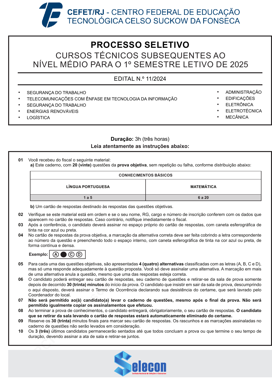 pcimarkpci MjgwNDowMTRkOjE0ODU6OTI5MDowOGQ5OmI2NWI6Y2MxOToxMDc0:VHVlLCAwMSBBcHIgMjAyNSAxODo1ODo1MyAtMDMwMA== www.pciconcursos.com.br 01 Você recebeu do fiscal o seguinte material: a) Este caderno, com 20 (vinte) questões da prova objetiva, sem repetição ou falha, conforme distribuição abaixo: b) Um cartão de respostas destinado às respostas das questões objetivas. 02 Verifique se este material está em ordem e se o seu nome, RG, cargo e número de inscrição conferem com os dados que aparecem no cartão de respostas. Caso contrário, notifique imediatamente o fiscal. 03 Após a conferência, o candidato deverá assinar no espaço próprio do cartão de respostas, com caneta esferográfica de tinta na cor azul ou preta. 04 No cartão de respostas da prova objetiva, a marcação da alternativa correta deve ser feita cobrindo a letra correspondente ao número da questão e preenchendo todo o espaço interno, com caneta esferográfica de tinta na cor azul ou preta, de forma contínua e densa. Exemplo: A C D 05 Para cada uma das questões objetivas, são apresentadas 4 (quatro) alternativas classificadas com as letras (A, B, C e D), mas só uma responde adequadamente à questão proposta. Você só deve assinalar uma alternativa. A marcação em mais de uma alternativa anula a questão, mesmo que uma das respostas esteja correta. 06 O candidato poderá entregar seu cartão de respostas, seu caderno de questões e retirar-se da sala de prova somente depois de decorrido 30 (trinta) minutos do início da prova. O candidato que insistir em sair da sala de prova, descumprindo o aqui disposto, deverá assinar o Termo de Ocorrência declarando sua desistência do certame, que será lavrado pelo Coordenador do local. 07 Não será permitido ao(à) candidato(a) levar o caderno de questões, mesmo após o final da prova. Não será permitido igualmente copiar os assinalamentos que efetuou. 08 Ao terminar a prova de conhecimentos, o candidato entregará, obrigatoriamente, o seu cartão de respostas. O candidato que se retirar da sala levando o cartão de respostas estará automaticamente eliminado do certame. 09 Reserve os 30 (trinta) minutos finais para marcar seu cartão de respostas. Os rascunhos e as marcações assinaladas no caderno de questões não serão levados em consideração. 10 Os 3 (três) últimos candidatos permanecerão sentados até que todos concluam a prova ou que termine o seu tempo de duração, devendo assinar a ata de sala e retirar-se juntos. EDITAL N.º 11/2024 PROCESSO SELETIVO CURSOS TÉCNICOS SUBSEQUENTES AO NÍVEL MÉDIO PARA O 1º SEMESTRE LETIVO DE 2025 Leia atentamente as instruções abaixo: Duração: 3h (três horas) CONHECIMENTOS BÁSICOS LÍNGUA PORTUGUESA MATEMÁTICA 1 a 5 6 a 20 • ADMINISTRAÇÃO • EDIFICAÇÕES • ELETRÔNICA • ELETROTÉCNICA • MECÂNICA • SEGURANÇA DO TRABALHO • TELECOMUNICAÇÕES COM ÊNFASE EM TECNOLOGIA DA INFORMAÇÃO • SEGURANÇA DO TRABALHO • ENERGIAS RENOVÁVEIS • LOGÍSTICA pcimarkpci MjgwNDowMTRkOjE0ODU6OTI5MDowOGQ5OmI2NWI6Y2MxOToxMDc0:VHVlLCAwMSBBcHIgMjAyNSAxODo1ODo1MyAtMDMwMA== www.pciconcursos.com.br CURSOS TÉCNICOS SUBSEQUENTES AO NÍVEL MÉDIO PARA O 1º SEMESTRE LETIVO DE 2025 2 LÍNGUA PORTUGUESA CONHECIMENTOS BÁSICOS 1. O trecho que melhor reforça a opinião de Luana Génot de que a intencionalidade humana mantém sua importância, mesmo diante dos avanços tecnológicos, é: A) “Parece um presente incrível, mas também pode ser assustador.” (1º§) B) “Há quem diga que as máquinas logo vão substituir os humanos.” (3º§) C) “Outros enxergam a tecnologia como a abertura de novos mercados.” (4º§) D) “Mas as diversas nuances em determinadas tomadas de decisão ainda são nossas.” (7º§) 2. Ao longo do texto, ocorrem frases interrogativas. Enquanto a primeira é uma citação, as demais cumprem o propósito de: A) provocar uma reflexão acerca da ideia apresentada B) exigir uma resposta imediata dos leitores em geral C) indicar o desconhecimento a respeito do assunto D) enfatizar o consenso das possíveis respostas Essa tal liberdade “O que eu vou fazer com essa tal liberdade?” Essa pergunta, que o poeta do pagode Alexandre Pires eternizou em uma música, volta e meia vinha à tona nas conversas com uma colega de trabalho. Sempre que falávamos sobre autonomia, ela soltava essa frase para provocar. A ideia era simples: a gente sempre pede por liberdade, mas o que fazemos com ela quando finalmente a temos? Parece um presente incrível, mas também pode ser assustador. Essa provocação me acompanhou recentemente em uma viagem a São Francisco, na Califórnia. Fui palestrar em uma conferência sobre Inteligência Artificial e inclusão e, no meio disso tudo, acabei experimentando algo que trouxe essas reflexões para a prática: dei uma voltinha em um carro autônomo. Sim, um carro sem motorista, circulando em um perímetro específico da cidade, no ritmo dele. De cara, a experiência foi fascinante. É impressionante como a tecnologia evoluiu a ponto de um veículo ter a liberdade de tomar decisões sozinho. O carro dirigia devagar, atento aos sensores, parando toda vez que alguém cruzava a rua. Era quase como se ele estivesse “pensando”. Mas, claro, eu sabia que tudo ali era resultado de programação e algoritmos. Lá estava eu, surpresa, no banco da frente, vendo o volante se mexendo “sozinho”, quase como uma assombração. A cada movimento, pensei no quanto isso se conecta com o que discutimos sobre Inteligência Artificial e inclusão. Há quem diga que as máquinas logo vão substituir os humanos. Será que em todas as funções? Há quem creia que os carros autônomos vão “roubar” os empregos de motoristas. Outros enxergam a tecnologia como a abertura de novos mercados. Porém, mais do que isso, o que me intrigava era: até que ponto podemos, e devemos, delegar decisões às máquinas? Até onde elas e nós temos liberdade na tomada de decisões? Por 