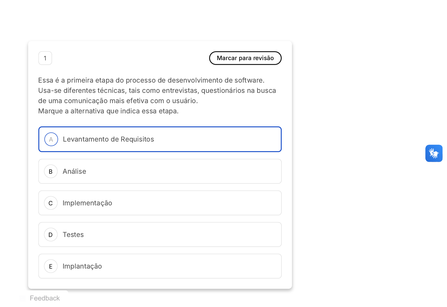 A B C D E 1 Marcar para revisão Essa é a primeira etapa do processo de desenvolvimento de software. Usa-se diferentes técnicas, tais como entrevistas, questionários na busca de uma comunicação mais efetiva com o usuário. Marque a alternativa que indica essa etapa. Levantamento de Requisitos Análise Implementação Testes Implantação Feedback A B C 2 Marcar para revisão (IDECAN/2022 - adaptada) O avanço da tecnologia trouxe a possibilidade do desenvolvimento de interfaces com usuários muito mais ricas do que os tradicionais terminais de texto onde a entrada de dados era feita a partir do teclado e os sistemas computacionais retornavam apenas texto como resposta. Com o advento das Graphical User Interface (GUI) as interfaces ficaram muito mais ricas e interessantes, pois elementos visuais passaram a ser utilizados. Marque a alternativa correta sobre software. Um conjunto de peças físicas que compõem um computador. A parte externa de um computador, incluindo o teclado, mouse e monitor. Uma coleção de objetos tangíveis que podem ser tocados e manipulados. D E A B Consiste em estruturas de informações que não permitem aos programas manipular informações de forma adequada. Um conjunto de programas e dados que fornecem instruções para um computador executar tarefas específicas. 3 Marcar para revisão Após atuar como programador em uma empresa de desenvolvimento de software por aproximadamente 10 anos, um funcionário que se destacou por nunca atrasar um cronograma foi nomeado gerente de projetos. Ao assumir o primeiro projeto, o funcionário foi informado que sua principal responsabilidade era a realização da entrega conforme o cronograma estabelecido no contrato. Para o gerenciamento de tempo, o gerente de projetos irá utilizar o PMBOK. Considerando essa situação, é correto afirmar que o gerente de projetos deverá coordenar processos de: Planejamento, garantia e controle da qualidade. Definição e sequenciamento de atividades, estimativa de recursos e duração da atividade, desenvolvimento e controle do cronograma. C D E Planejamento, definição, verificação e controle do escopo. Estimativa de custos, realização do orçamento e controle de custos. Planejamento de compra e contratações, seleção de fornecedores e encerramento do contrato. 4 Marcar para revisão A ISO 9126 identifica seis atributos fundamentais de qualidade para o software. Avalie se as afirmativas a seguir são falsas ou verdadeiras: [____] Confiabilidade, atributo associado ao tempo de disponibilidade do software. [____] Eficiência, atributo relacionado com a otimização dos recursos do sistema. [____] Portabilidade, atributo associado à satisfação dos requisitos funcionais. Assinale a opção correta: A B C D E [V] - [V] - [V]. [V] - [F] - [V]. [F] - [V] - [V]. [V] - [F] - [F]. [V] - [V] - [F]. 5 Marcar para revisão Em um projeto de software, a equipe enfrenta desafios ao implementar uma função de login. A complexidade surge devido à necessidade de equilibrar segurança e usabilidade, envolvendo autenticação multifatorial. Considerando as melhores práticas, qual abordagem seria mais adequada? Qual é a abordagem mais adequada para implementar a função de login considerando segurança e usabilidade? A B C D E Utilizar apenas senhas simples para facilitar o uso. Implementar a autenticação multifatorial com biometria e senhas. Evitar autenticação multifatorial para simplificar o processo. Usar somente verificações por e-mail para segurança. Ignorar a usabilidade em favor da segurança máxima. 6 Marcar para revisão O gerenciamento de riscos é o processo sistemático de identificação, análise e respostas a riscos de projetos. Considerando que a metodologia aplicada à referida área de conhecimento encadeia processos de acordo com a figura a seguir, assinale a sequência correta: A B C D E Análise qualitativa, identificação de risco, análise quantitativa, planejamento de respostas a riscos. Identificação de risco, análise qualitativa, análise quantitativa, planejamento de respostas a riscos. Identificação de risco, análise quantitativa, análise qualitativa, planejamento de respostas a riscos. Análise qualitativa, análise quantitativa, identificação de risco, planejamento de respostas a riscos. Planejamento de respostas a riscos, identificação de risco, análise qualitativa, análise quantitativa. 7 Marcar para revisão O projeto (ou “design”, como é frequentemente chamado em inglês) é uma das etapas cruciais no ciclo de vida do desenvolvimento de software. O que são as entregas da etapa “projeto” do processo de desenvolvimento de software? A B C D E Plantas baixas e projetos elétricos. Código-fonte e executáveis. Frameworks e bibliotecas. Diagramas e especificações textuais. Programadores e analistas. 8 Marcar para revisão Em engenharia de software, quando nos referimos a “fatoração” ou “refatoração”, estamos falando do processo de reestruturar o código existente sem alterar seu comportamento externo. O objetivo é melhorar a estrutura interna do código, tornando-o mais claro, reduzindo a complexidade, eliminando redundâncias e, em geral, tornando-o mais fácil de compreender e manter. O que é fatoração na Engenharia de Software? A B C D E Aumento da solução do problema. Interação entre os objetos. Decomposição da solução do problema em partes menores. Modelagem de padrões. Definição de atributos em classes. 9 Marcar para revisão Durante a fase de projeto de software de um aplicativo educacional, a equipe foca em definir a arquitetura do sistema, incluindo padrões de design para facilitar a manutenção e a escalabilidade futuras. Qual atividade é essencial na fase de projeto deste aplicativo educacional? A B C D E Escolha do sistema de gerenciamento de banco de dados. Definição do modelo de classes do sistema. Codificação das funcionalidades principais. Testes de usabilidade com usuários