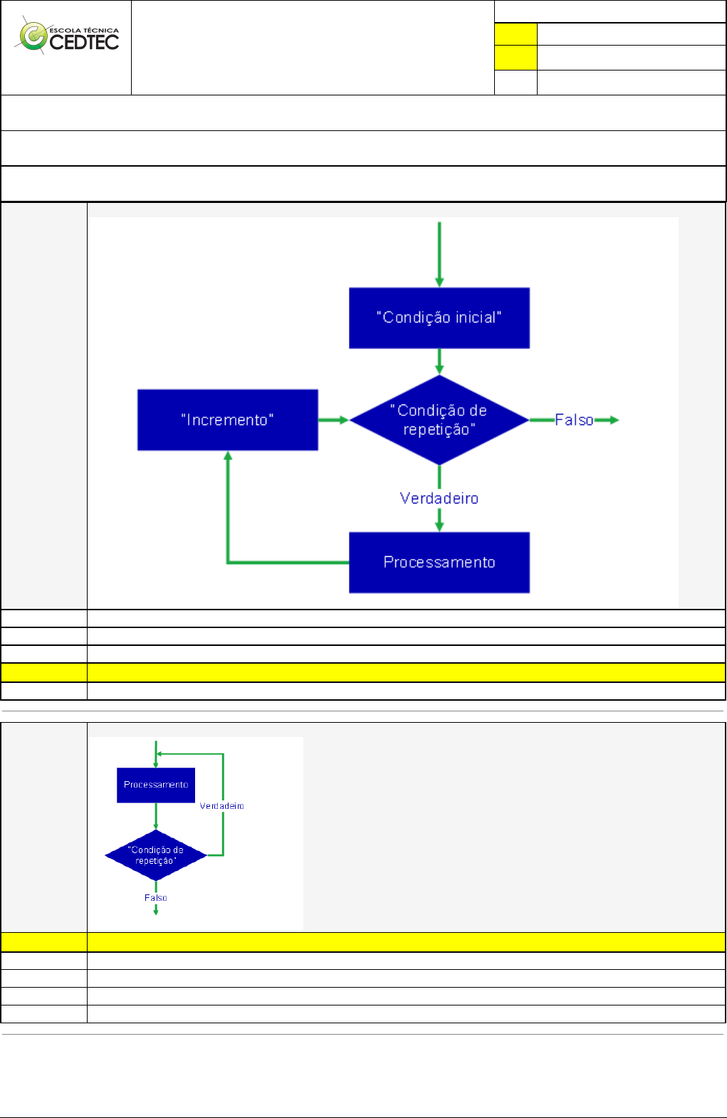 Pincel Atômico - 28/02/2024 20:22:21 1/2 ROBERT CAVALCANTE VIEIRA DA SILVA Exercício Caminho do Conhecimento - Etapa 8 (21120) Atividade finalizada em 27/02/2024 21:18:48 (1600576 / 1) LEGENDA Resposta correta na questão # Resposta correta - Questão Anulada X Resposta selecionada pelo Aluno Disciplina: CONTROLADOR LÓGICO PROGRAMÁVEL [996996] - Avaliação com 4 questões, com o peso total de 13,00 pontos [capítulos - 112] Turma: Curso Técnico: Eletrotécnica - Grupo: FEVEREIRO/24 PRES - ELETGUA NOT [109376] Aluno(a): 91571599 - ROBERT CAVALCANTE VIEIRA DA SILVA - Respondeu 3 questões corretas, obtendo um total de 9,75 pontos como nota [350096_126964] Questão 001 A estrutura abaixo representa uma lógica clássica de fluxograma, qual é essa lógica? Enquanto (WHILE) Se (IF) Se/Senão (IF/ELSE) X Para (FOR) Faça-enquanto (DO-WHILE) [350098_126966] Questão 002 A estrutura abaixo representa uma lógica clássica de fluxograma, qual é essa lógica? X Faça-enquanto (DO-WHILE) Se/Senão (IF/ELSE) Se (IF) Para (FOR) Enquanto (WHILE) Pincel Atômico - 28/02/2024 20:22:21 2/2 [350096_126970] Questão 003 O diagrama abaixo demonstra uma lógica de decisão, qual das alternativas representa um comportamento adequado da lógica? X Se “Número” tiver um valor inicial de 11, o resultado que será apresentado será 5. Se “Número” tiver um valor inicial de 10, o resultado que será apresentado será 4,5. Se “Número” tiver um valor inicial de 11, o resultado que será apresentado será 5,5. Se “Número” tiver um valor inicial de 10, o resultado que será apresentado será 4. Se “Número” tiver um valor inicial de 11, o resultado que será apresentado será 6. [350098_126981] Questão 004 No fim do código abaixo valor armazenado na variável “Resultado” será: inteiro x, y, resultado; x = 3; y = 2; resultado = (x*y)+5; se (resultado > 10) resultado =19; senão resultado=9; fim se 15 21 11 19 X 9