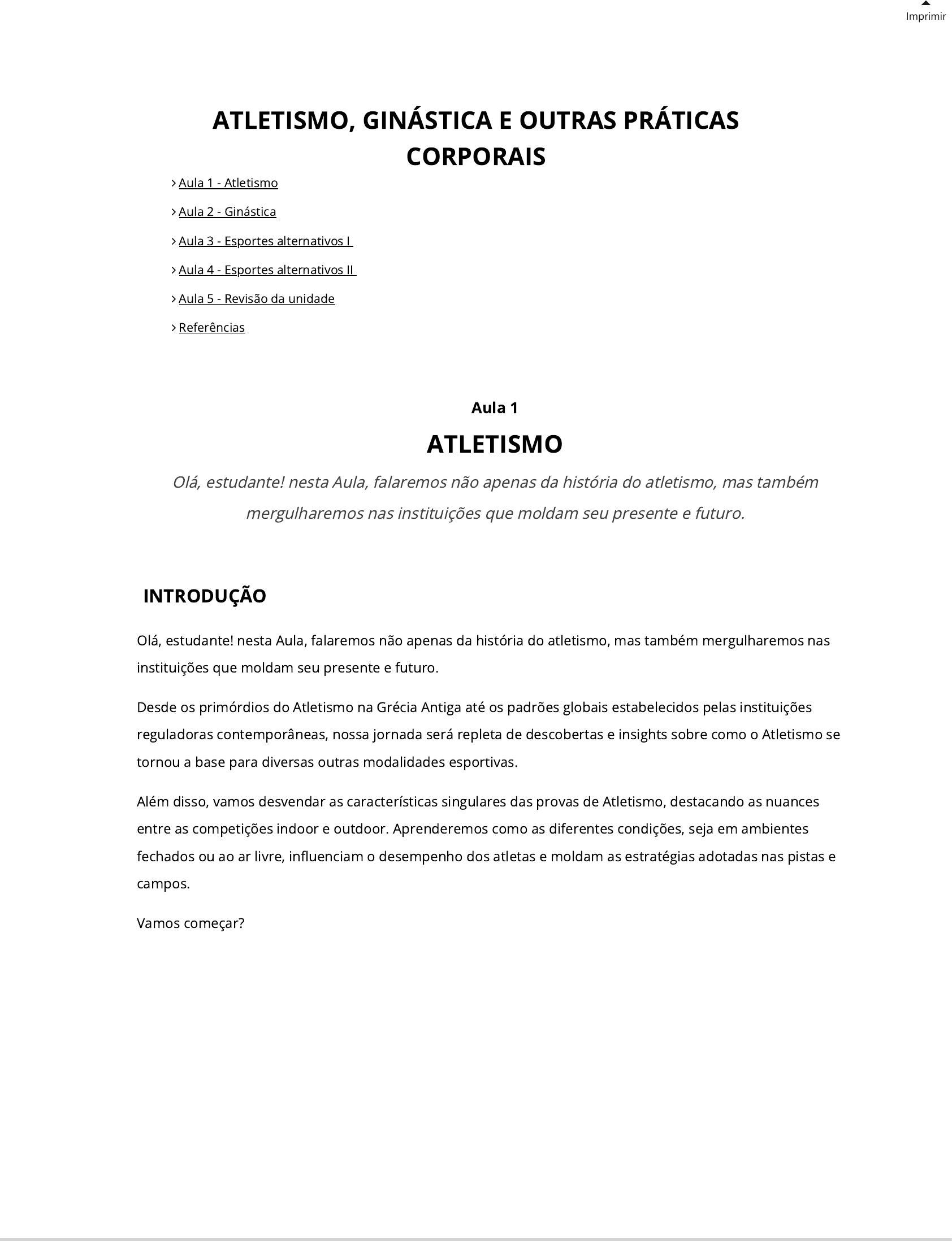 Imprimir INTRODUÇÃO Olá, estudante! nesta Aula, falaremos não apenas da história do atletismo, mas também mergulharemos nas instituições que moldam seu presente e futuro. Desde os primórdios do Atletismo na Grécia Antiga até os padrões globais estabelecidos pelas instituições reguladoras contemporâneas, nossa jornada será repleta de descobertas e insights sobre como o Atletismo se tornou a base para diversas outras modalidades esportivas. Além disso, vamos desvendar as características singulares das provas de Atletismo, destacando as nuances entre as competições indoor e outdoor. Aprenderemos como as diferentes condições, seja em ambientes fechados ou ao ar livre, influenciam o desempenho dos atletas e moldam as estratégias adotadas nas pistas e campos. Vamos começar? Aula 1 ATLETISMO Olá, estudante! nesta Aula, falaremos não apenas da história do atletismo, mas também mergulharemos nas instituições que moldam seu presente e futuro. ATLETISMO, GINÁSTICA E OUTRAS PRÁTICAS CORPORAIS Aula 1 - Atletismo Aula 2 - Ginástica Aula 3 - Esportes alternativos I Aula 4 - Esportes alternativos II Aula 5 - Revisão da unidade Referências CARACTERIZANDO E DEFININDO O ATLETISMO O atletismo é popularmente conhecido como um esporte fundamental, pois utiliza movimentos básicos que o ser humano utiliza desde a pré-história: correr, saltar, arremessar e lançar. E essas mesmas ações servem de base para outros esportes: o arremesso no handebol e no basquete; as corridas nos esportes de invasão, os saltos no voleibol, entre outros. Historicamente, essa é uma modalidade que vem sendo disputada pelos homens desde os Jogos Olímpicos da Grécia Antiga e, pelas mulheres, desde os Jogos Olímpicos Modernos em 1928, realizados em Amsterdã. Os brasileiros começaram a participar do atletismo em 1924, enquanto as brasileiras iniciaram em 1948, nos Jogos Olímpicos de Paris e Londres, respectivamente. As provas do atletismo são as seguintes: corridas rasas – 100m; 200m; 400m; 800m; 1500m; 5000m; 10000m; maratona (42.195 metros). As Corridas com barreiras: 110m (masculino); 100m(feminino); corrida com obstáculos: 3000m (ambos). Corridas de revezamento: 4x100m e 4x400m. Os saltos: em altura, com vara, em distância e triplo. O arremesso de peso e os lançamentos: de disco, dardo e martelo. Existem, também, as provas combinadas, ou seja, prova na qual o atleta participa em mais de uma modalidade e suas colocações e resultados somam pontos. O decatlo é a prova combinada masculina que conta as seguintes provas: 100 metros rasos, salto em distância, lançamento de peso, salto em altura, 400 metros rasos, 110 metros com barreiras, lançamento de disco, salto com vara, lançamento de dardo, 1.500 metros rasos. Já o heptatlo é disputado pelas mulheres e é composto pelas provas de 100 metros com barreiras, salto em altura, arremesso de peso, 200 metros rasos, salto em distância, lançamento de dardo, 800 metros rasos. As provas tradicionais são realizadas em espaços abertos (outdoor), tanto as provas de pista quanto as de campo. No entanto, existe também a modalidade indoor. De acordo com Sant (2005), a primeira competição de atletismo indoor aconteceu em 1861 no Young Men's Gymnastic Club de Cincinnati (EUA). Mas somente em 1966 acontece em Dortmund (Alemanha) os Primeiros jogos Europeus de Pista Coberta. O primeiro mundial de atletismo indoor aconteceu em 1987 em Indianapólis. Por conta da área de competição e da cobertura, as provas indoor não contam com as disputas de lançamentos (dardo, martelo e disco). Ao abordar as instituições que definem as regras e competições oficiais do atletismo, começamos pela International Association of Athletics Federations (IAAF), fundada em 1912, a qual desempenha um papel central na regulamentação do Atletismo em escala global. Seu principal objetivo é promover e organizar competições internacionais, estabelecer regras e padrões técnicos, além de zelar pela integridade e ética no esporte. Ao longo dos anos, a IAAF evoluiu para se adaptar às mudanças no cenário esportivo, introduzindo novas categorias, eventos e regulamentações para manter o Atletismo como uma modalidade dinâmica e inclusiva. Além da IAAF, as federações continentais, como a Confederação Africana de Atletismo, a Associação Asiática de Atletismo, a Associação Europeia de Atletismo, a Associação de Atletismo da América do Norte, Central e Caribe e a Confederação Sul-Americana de Atletismo desempenham papéis cruciais na regulamentação e promoção do Atletismo em suas respectivas regiões. HISTÓRIA E VARIEDADE DE PROVAS NO ATLETISMO Entre os principais nomes brasileiros de destaque no esporte, podemos citar recordistas mundiais que deixaram suas marcas: Adhemar Ferreira da Silva, Nelson Prudêncio, João Carlos de Oliveira (João ‘do Pulo’) e Ronaldo da Costa, totalizando oito recordes mundiais, que, hoje, já foram superados. Além disso, os brasileiros conquistaram dezenas de medalhas olímpicas, incluindo a Medalha Barão Pierre de Coubertin, concedida a Vanderlei Cordeiro de Lima, maratonista que, em 2004, durante os Jogos Olímpicos de Atenas, foi intercedido por um espectador enquanto liderava a corrida e concluiu-a na terceira colocação. No âmbito feminino, destacam-se Maurren Higa Maggi que conquistou o ouro no salto em distância nas olímpiadas de Pequim, em 2008 e a Vitória Rosa, velocista e medalhistas nos jogos Panamericanos de 2019. De acordo com Matthiesen (2007), esse breve histórico reforça o atletismo como uma modalidade tradicional na Educação Física, embora enfrentando desafios como a falta de prática entre crianças e jovens, atribuída muitas vezes à limitação de espaço e acesso a materiais específicos ou desinteresse por parte de alunos e professores. Em relação as capacidades físicas exigidas pelos atletas, pode-se afirmar que as provas de pista e de curtas distância (de 100m a 4