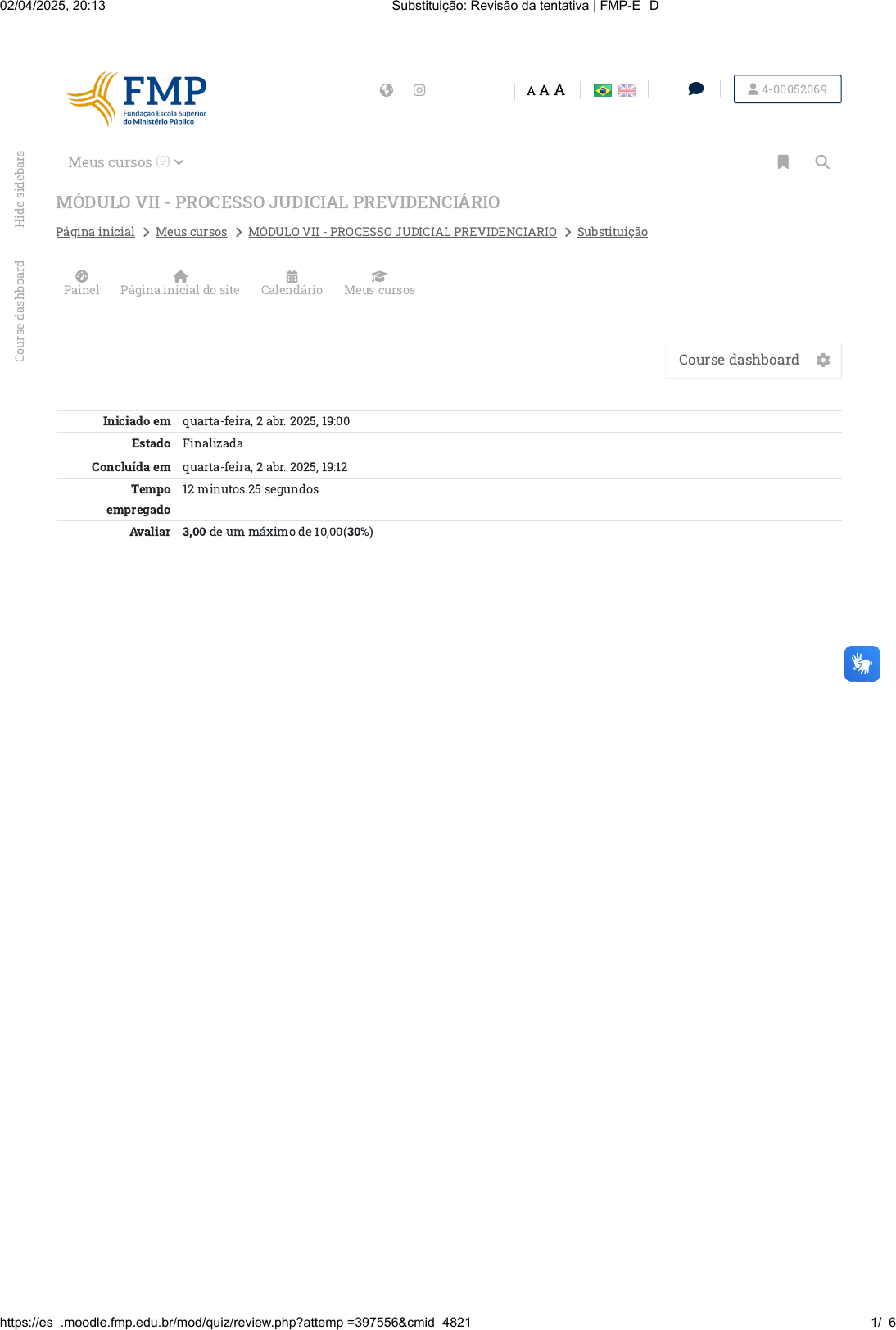 Meus cursos ⌄(9) MÓDULO VII - PROCESSO JUDICIAL PREVIDENCIÁRIO Página inicial › Meus cursos › MÓDULO VII - PROCESSO JUDICIAL PREVIDENCIÁRIO › Substituição Painel Página inicial do site Calendário Meus cursos ⚙Course dashboard Iniciado em quarta-feira, 2 abr. 2025, 19:00 Estado Finalizada Concluída em quarta-feira, 2 abr. 2025, 19:12 Tempo empregado 12 minutos 25 segundos Avaliar 3,00 de um máximo de 10,00(30%) 4-00052069 A A A C o u rs e d a sh b o a rd H id e s id e b a rs 02/04/2025, 20:13 Substituição: Revisão da tentativa | FMP-EAD https://esa.moodle.fmp.edu.br/mod/quiz/review.php?attempt=397556&cmid=4821 1/16 https://esa.moodle.fmp.edu.br/my/courses.php https://esa.moodle.fmp.edu.br/course/view.php?id=263 https://esa.moodle.fmp.edu.br/ https://esa.moodle.fmp.edu.br/my/courses.php https://esa.moodle.fmp.edu.br/course/view.php?id=263 https://esa.moodle.fmp.edu.br/mod/quiz/view.php?id=4821 https://esa.moodle.fmp.edu.br/my https://esa.moodle.fmp.edu.br/?redirect=0 https://esa.moodle.fmp.edu.br/calendar/view.php?view=month https://esa.moodle.fmp.edu.br/my/courses.php https://esa.moodle.fmp.edu.br/ https://esa.moodle.fmp.edu.br/ https://esa.moodle.fmp.edu.br/mod/quiz/review.php?attempt=397556&cmid=4821&lang=pt_br https://esa.moodle.fmp.edu.br/mod/quiz/review.php?attempt=397556&cmid=4821&lang=pt_br https://esa.moodle.fmp.edu.br/mod/quiz/review.php?attempt=397556&cmid=4821&lang=en https://esa.moodle.fmp.edu.br/mod/quiz/review.php?attempt=397556&cmid=4821&lang=en https://fmp.edu.br/ https://www.instagram.com/fmp_rs/ https://www.facebook.com/FMPRS/?locale=pt_BR https://www.youtube.com/@FMPTV Questão 1 Incorreto Atingiu 0,00 de 1,00 As relações entre o processo administrativo e o processo judicial em matéria previdenciária são regidas pelo princípio da subsidiariedade, ou seja, a via judicial só pode ser acessada após o esgotamento das instâncias administrativas. No processo previdenciário, o requerimento administrativo prévio é condição indispensável para o reconhecimento do interesse de agir judicialmente, exceto em hipóteses específicas. Ainda assim, o Poder Judiciário pode ser acionado para revisar ou anular decisões administrativas, com base nos princípios do contraditório, ampla defesa e devido processo legal. MARTINS, Sérgio Pinto. Direito da seguridade social. 24. ed. São Paulo: Atlas, 2021. A respeito das relações entre o processo administrativo e o processo judicial em questões previdenciárias, assinale a alternativa correta, considerando os limites de atuação do Judiciário e os requisitos para o acesso à justiça. a. O processo judicial previdenciário pode ser iniciado independentemente de prévio requerimento administrativo, caso o segurado alegue omissão do INSS em julgar processos semelhantes em outros casos. b. O processo judicial pode revisar integralmente o mérito das decisões administrativas previdenciárias, incluindo a reavaliação de critérios técnicos que envolvem perícia médica. × c. O prévio requerimento administrativo é dispensado quando o segurado tiver protocolado ação anterior de mesma natureza e conteúdo, ainda que a decisão não tenha transitado em julgado. d. A falta de resposta do INSS no prazo legal de análise do requerimento administrativo pode gerar o interesse de agir judicialmente, configurando a chamada negativa tácita do benefício. e. A decisão judicial só pode anular ou modificar a decisão administrativa se houver falhas no procedimento formal, não sendo possível ao Judiciário interferir no mérito administrativo das decisões previdenciárias. Sua resposta está incorreta. A resposta correta é: A falta de resposta do INSS no prazo legal de análise do requerimento administrativo pode gerar o interesse de agir judicialmente, configurando a chamada negativa tácita do benefício. C o u rs e d a sh b o a rd H id e s id e b a rs 02/04/2025, 20:13 Substituição: Revisão da tentativa | FMP-EAD https://esa.moodle.fmp.edu.br/mod/quiz/review.php?attempt=397556&cmid=4821 2/16 C o u rs e d a sh b o a rd H id e s id e b a rs 02/04/2025, 20:13 Substituição: Revisão da tentativa | FMP-EAD https://esa.moodle.fmp.edu.br/mod/quiz/review.php?attempt=397556&cmid=4821 3/16 Questão 2 Correto Atingiu 1,00 de 1,00 O prévio requerimento administrativo junto ao INSS é uma condição indispensável para o ajuizamento de ações previdenciárias, salvo em hipóteses excepcionais, como a negativa tácita ou a recusa administrativa injustificada. Essa exigência decorre da necessidade de esgotamento da via administrativa antes do acionamento do Judiciário, assegurando o princípio da economia processual e o pleno exercício da função administrativa. O descumprimento dessa exigência pode levar à extinção do processo judicial sem resolução de mérito, salvo quando comprovada a desnecessidade de tal requerimento em circunstâncias específicas. MARTINS, Sérgio Pinto. Direito da seguridade social. 24. ed. São Paulo: Atlas, 2021. Considerando as implicações jurídicas da exigência do prévio requerimento administrativo nas ações previdenciárias, assinale a alternativa que descreve corretamente as consequências do não cumprimento dessa etapa. a. A ausência de prévio requerimento administrativo inviabiliza o interesse de agir e implica a extinção do processo com resolução de mérito, não sendo possível ao autor realizar novo pedido administrativo para corrigir a omissão. b. O não cumprimento do prévio requerimento administrativo impede a apreciação judicial da matéria, mas o segurado pode suprir a omissão juntando documentos do processo administrativo durante o trâmite judicial, sem prejuízo ao andamento da ação. c. Se o prévio requerimento administrativo não for realizado, o processo judicial deve ser extinto sem resolução de mérito, exceto quando houver negativa tácita ou mora administrativa, caso em que o processo judicial pode prosseguir normalmente. 