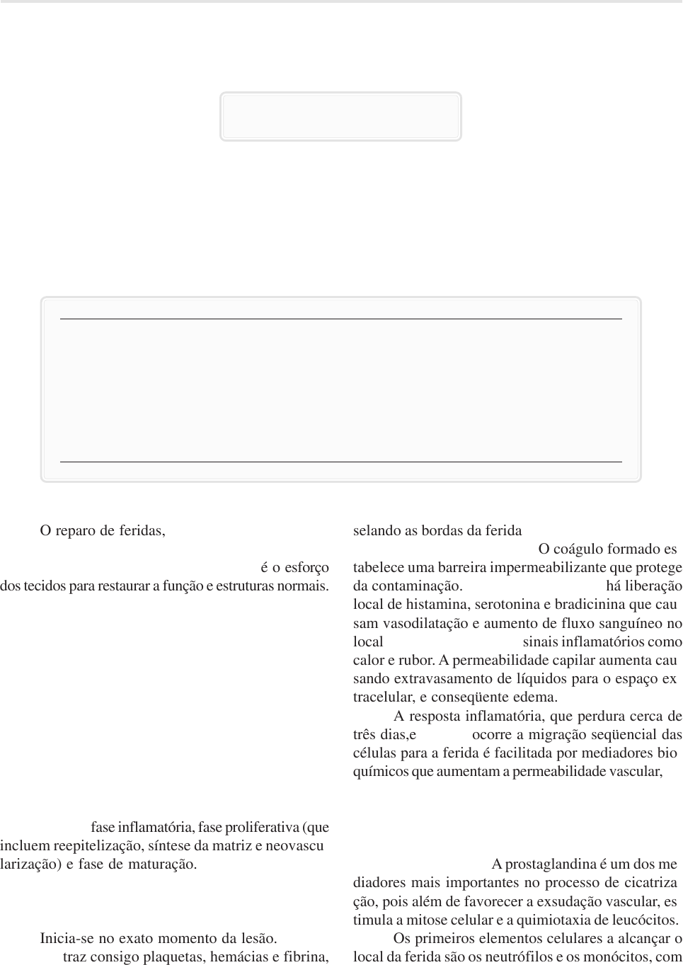 BIOLOGIA DA FERIDA E CICATRIZAÇÃO WOUND BIOLOGY AND HEALING Maria de Fátima G S Tazima1, Yvone Avalloni de Morais Villela de Andrade Vicente1, Takachi Moriya2 1Docente da Divisão de Cirurgia Pediátrica, 2Docente da Divisão de Cirurgia Vascular e Endovascular. Departamento de Cirurgia e Anatomia da FMRP-USP. Correspondência: Maria de Fátima G S Tazima. Divisão de Cirurgia Pediátrica, Departamento de Cirurgia e Anatomia da FMRP-USP. Av. Bandeirantes, 3900. CEP: 14048-900 - Ribeirão Preto /SP. (email: mftazima@terra.com.br) Tazima MFGS, Vicente YAMVA, Moriya T. Biologia da ferida e cicatrização. Medicina (Ribeirão Preto) 2008; 41 (3): 259-64. RESUMO: O conhecimento dos complexos eventos fisiológicos da cicatrização da ferida é de grande importância para o cirurgião. A reparação das feridas é apresentada em suas etapas inflamatória, proliferativa e de maturação. Palavras-chaves: Cicatrização de Feridas. Ferimentos e Lesões/cirurgia. Ferida Operatória. Biologia da Ferida. Biologia/Ferimentos e Lesões. 259 O reparo de feridas, uma solução de continui- dade dos tecidos, decorrente da lesão por agentes me- cânicos, térmicos, químicos e bacterianos, é o esforço dos tecidos para restaurar a função e estruturas normais. O conhecimento dos complexos eventos fisio- lógicos da cicatrização de feridas é de grande impor- tância para o cirurgião. A regeneração é a restauração perfeita da ar- quitetura do tecido pré-existente, na ausência de for- mação de cicatriz, e embora seja o tipo ideal no uni- verso de cicatrização de feridas, ela só é observada no desenvolvimento embrionário, organismos inferio- res ou em determinados tecidos como ossos e fígado. Na cicatrização de feridas a acurácia da regeneração é trocada pela velocidade de reparo. A reparação de feridas passa pelas seguintes etapas básicas: fase inflamatória, fase proliferativa (que incluem reepitelização, síntese da matriz e neovascu- larização) e fase de maturação. 1- FASE INFLAMATÓRIA Inicia-se no exato momento da lesão. O san- gramento traz consigo plaquetas, hemácias e fibrina, selando as bordas da ferida, ainda sem valor mecâni- co, mas facilitando as trocas. O coágulo formado es- tabelece uma barreira impermeabilizante que protege da contaminação. Com a lesão tecidual, há liberação local de histamina, serotonina e bradicinina que cau- sam vasodilatação e aumento de fluxo sanguíneo no local e, conseqüentemente, sinais inflamatórios como calor e rubor. A permeabilidade capilar aumenta cau- sando extravasamento de líquidos para o espaço ex- tracelular, e conseqüente edema. A resposta inflamatória, que perdura cerca de três dias,e na qual ocorre a migração seqüencial das células para a ferida é facilitada por mediadores bio- químicos que aumentam a permeabilidade vascular, fa- vorecendo a exsudação plasmática e a passagem de elementos celulares para a área da ferida. Os media- dores bioquímicos de ação curta são a histamina e sero- tonina e as mais duradouras são a leucotaxina, bradici- nina e prostaglandina. A prostaglandina é um dos me- diadores mais importantes no processo de cicatriza- ção, pois além de favorecer a exsudação vascular, es- timula a mitose celular e a quimiotaxia de leucócitos. Os primeiros elementos celulares a alcançar o local da ferida são os neutrófilos e os monócitos, com Medicina, Ribeirão Preto, Simpósio: FUNDAMENTOS EM CLÍNICA CIRÚRGICA - 1ª Parte 2008; 41 (3): 259-64 Capítulo II 260 Biologia da ferida e cicatrização Medicina (Ribeirão Preto) 2008; 41 (3): 259-64. Tazima MFGS, Vicente YAMVA, Moriya T http://www.fmrp.usp.br/revista 2- FASE PROLIFERATIVA A fase proliferativa é composta de três eventos importantes que sucedem o período de maior ativida- de da fase inflamatória: neo-angiogênese, fibroplasia e epitelização. Este fase caracteriza-se pela forma- ção de tecido de granulação, que é constituído por um leito capilar, fibroblastos, macrófagos, um frouxo ar- ranjo de colágeno, fibronectina e ácido hialurônico. Esta fase inicia-se por volta do 3º dia após a lesão, perdura por 2 a 3 semanas e é o marco inicial da formação da cicatriz. 2.1- Neo-angiogênese A neo-angiogênese é o processo de formação de novos vasos sangüíneos, necessário para manter o ambiente de cicatrização da ferida. Em todas as feri- das, o suprimento sanguíneo dos fibroblastos respon- sáveis pela síntese de colágeno provém de um intenso crescimento de novos vasos, caracterizando a cicatri- zação por segunda intenção e o tecido de granulação. Os novos vasos formam-se a partir de brotos endoteliais sólidos, que migram no sentido da periferia para o centro da ferida, sobre a malha de fibrina de- positada no leito da ferida. A bradicinina, a prosta- glandina e outros mediadores químicos oriundos dos macrófagos, ativados, estimulam a migração e a mitose das células endoteliais. A neo-angiogênese é respon- sável não apenas pela nutrição do tecido, com uma demanda meta- bólica maior, como também pelo aumento do aporte de células, como macrófagos e fibroblastos, para o local da ferida. 2.2- Fibroplasia Após o trauma, células mesenquimais normalmente qui- escentes e esparsas no tecido nor- mal, são transformadas em fibro- blastos e atraídas para o local in- flamatório, onde se dividem e pro- duzem os componentes da matriz extracelular. O fibroblasto só apa- rece no sítio da lesão a partir do 3º dia, quando os leucócitos poli- morfonucleares já fizeram seu papel higienizador da área trauma- tizada. A função primordial dos fibroblastos é sintetizar colágeno, ainda na fase celular da inflamação. O colágeno é uma proteína de alto peso mole- cular, composta de glicina, prolina, hidroxiprolina, lisina e hidroxilisina, que se organiza em cadeias longas de três feixes polipeptídicos em forma de hélice, respon- sáveis pela força da cicatriz. A s