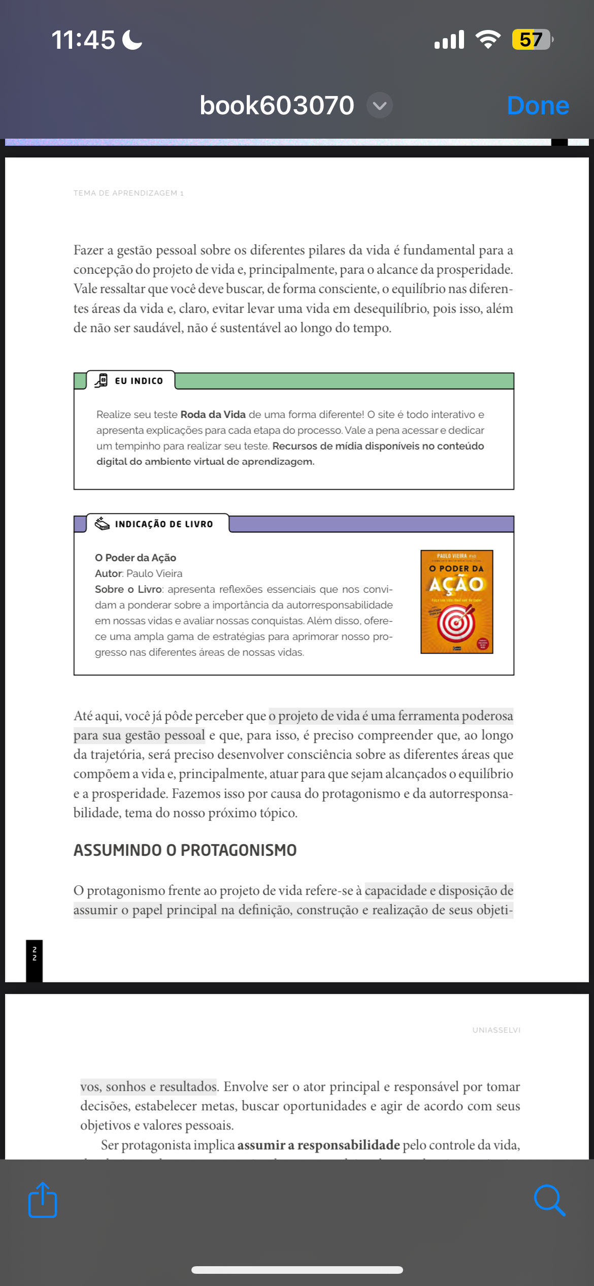 11:45 C 57 book603070 Done TEMA DE APRENDIZAGEM 1 Fazer a gestão pessoal sobre os diferentes pilares da vida é fundamental para a concepção do projeto de vida e, principalmente, para o alcance da prosperidade. Vale ressaltar que você deve buscar, de forma consciente, o equilíbrio nas diferen- tes áreas da vida e, claro, evitar levar uma vida em desequilíbrio, pois isso, além de não ser saudável, não é sustentável ao longo do tempo. EU INDICO Realize seu teste Roda da Vida de uma forma diferente! site é todo interativo e apresenta explicações para cada etapa do processo. Vale a pena acessar e dedicar um tempinho para realizar seu teste. Recursos de disponíveis no conteúdo digital do ambiente virtual de aprendizagem. INDICAÇÃO DE LIVRO Poder da Ação PAULO VIEIRA o PODER DA Autor: Paulo Vieira Sobre o Livro: apresenta reflexões essenciais que nos convi- AÇÃO dam a ponderar sobre a importância da autorresponsabilidade em nossas vidas e avaliar nossas conquistas. Além disso. ofere- ce uma ampla gama de estratégias para aprimorar nosso pro- gresso nas diferentes áreas de nossas Até aqui, você já pôde perceber que o projeto de vida é uma ferramenta poderosa para sua gestão pessoal e que, para isso, é preciso compreender que, ao longo da trajetória, será preciso desenvolver consciência sobre as diferentes áreas que compõem a vida e, principalmente, atuar para que sejam alcançados o equilíbrio e a prosperidade. Fazemos isso por causa do protagonismo e da autorresponsa- bilidade, tema do nosso próximo tópico. ASSUMINDO 0 PROTAGONISMO protagonismo frente ao projeto de vida refere-se à capacidade e disposição de assumir o papel principal na definição, construção e realização de seus objeti- UNIASSELVI vos, sonhos e resultados. Envolve ser o ator principal e responsável por tomar decisões, estabelecer metas, buscar oportunidades e agir de acordo com seus objetivos e valores pessoais. Ser protagonista implica assumir a responsabilidade pelo controle da vida,