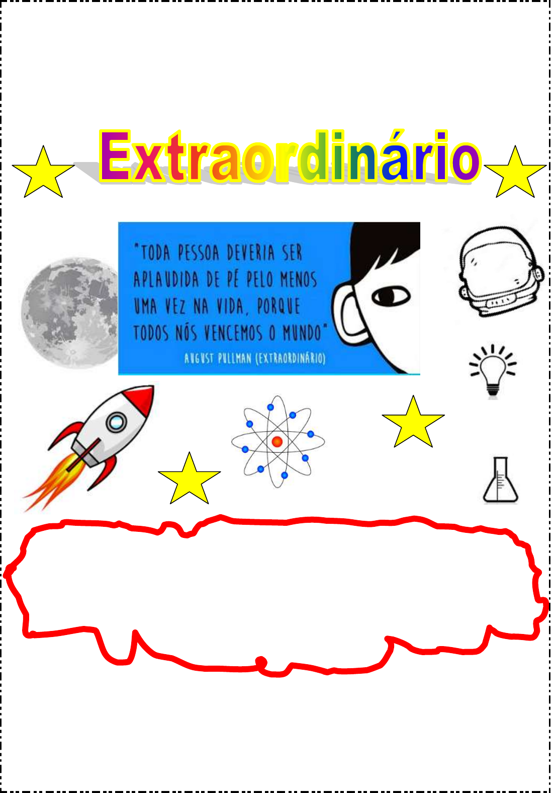 www.acessaber.com.br ESCOLA ________________________________________DATA:_____/_____/_____ PROF:______________________________________________TURMA:___________ NOME:_______________________________________________________________ "Seja gentil, você não sabe as batalhas que o outro enfrenta!" "Quando tiver que escolher entre estar certo e ser gentil, escolha ser gentil." O filme “Extraordinário” conta a emocionante história de August Pullman( Auggie), um garotinho que nasceu com uma desordem craniofacial congênita e que pela primeira vez, irá frequentar uma escola regular, como qualquer outra criança. No quinto ano, ele irá precisar se esforçar para conseguir se encaixar em sua nova realidade. http://devaneiosdalila.blogspot.com.br/2018/01/critica-extraordinario.html www.acessaber.com.br 1.Um filme tocante que traz uma reflexão sobre muitas atitudes que às vezes tomamos sem pensar. Um olhar meio torto, uma gargalhada sem pretensão e pronto sem querer magoamos uma pessoa que está ao nosso lado e nem percebemos. Muitas vezes são as pessoas que estão a nossa volta que nos magoam. Auggie sofria muito com essas ações repetidamente, relate uma cena relacionada ao sofrimento do Auggie que você achou marcante. Se fosse você no lugar do Auggie teria a mesma atitude? Explique. __________________________________________________________ __________________________________________________________ __________________________________________________________ __________________________________________________________ __________________________________________________________ 2.Auggie sofre em ser solitário, porém, sua imaginação o ajuda quando Chewbacca aparece no meio da escola e, esse fato o faz se sentir melhor. No entanto, sua condição de solitário muda de repente. Quem se aproxima dele e faz amizade? Essa amizade faz bem ao Auggie? Qual fato quebra o elo de confiança entre Auggie e sua nova e única amizade? Relate. __________________________________________________________ __________________________________________________________ __________________________________________________________ __________________________________________________________ 3.Analise as imagens e faça uma descrição das características físicas e psicológicas de cada personagem. __________________________________________________________ __________________________________________________________ __________________________________________________________ __________________________________________________________ 4.Explique o que o capacete de astronauta representa para Auggie. ____________________________________________________________________ ____________________________________________________________________ Via Auggie Jack Will Miranda www.acessaber.com.br 5.É possível identificar no filme cenas que retratam bullying. Descreva uma cena em que fica evidente a prática de tal ato. Em seguida, explique o que você faria para se defender se fosse Auggie? __________________________________________________________ __________________________________________________________ __________________________________________________________ __________________________________________________________ 6.Relate a cena do filme que você mais gostou. __________________________________________________________ __________________________________________________________ __________________________________________________________ __________________________________________________________ 7.O desfecho do filme é surpreendente e mostra de forma clara que é possível vencer uma dificuldade, é possível superar os problemas. Para você, o que ajudou Auggie a superar suas dificuldades? Quem ou o que teve um papel importante na superação do garoto? Comente. __________________________________________________________ __________________________________________________________ __________________________________________________________ __________________________________________________________ 8.Em duplas façam um cartaz sobre o filme. Procurem retratar alguns dos sentimentos vividos e as emoções ao apreciarem a história de Auggie. Não esqueçam de ilustrar e pintar o trabalho elaborado pela dupla. Após a dupla deverá redigir um poema. O tema pode ser sobre superação, amizade, determinação, família, amor, companheirismo, não ao bullying, etc. Procure escrever o poema fazendo um elo com o filme. Ao final vocês deverão apresentar seu trabalho para a turma. Bom trabalho! Respostas: 1.Resposta Pessoal 2.Jack Will se aproxima do menino e essa amizade traz muita felicidade para Auggie. Na festa de Halloween Auggie ouve Jack Will conversando com os amigos. Eles perguntam porque ele fez amizade com Auggie e Jack confessa que foi a pedido do senhor Buzanfa. 3.Via é amorosa com o irmão, compreensiva com os pais que colocam Auggie sempre em primeiro lugar, etc. Veste-se de modo simples. www.acessaber.com.br Auggie é talentoso e inteligente. Sofre com bullying, mas não faz disso um obstáculos para superar os problemas. Gosta de usar um capacete de astronauta para fugir dos olhares maldosos. Jack Will tem bom coração e se torna um grande amigo de Auggie. Miranda é uma garota solitária cujos pais não se importam muito com ela. Ama Auggie como se fosse seu irmão mais novo. Veste-se de forma descolada e moderna. 4.Auggie usa o capacete para fugir dos olhares maldosos, ele tem o capacete como um refúgio. Quando ele se sente mais confiante deixa de usá-lo. 5.Espera-se que os estudantes tenham sensibilidade para reconhecer a prática de bullying contra o personagem. Muitas cenas retratam esse ato como, por exemplo, a cena em que o garoto é perseguido com bilhetes e quando a mãe do Julian retira a Auggie da foto do dia da formatura, entre outros. 6. Resposta Pessoal 7.Espera-se que os estudantes compreendam que a família foi a base de tudo. E que as amizades apenas completaram o que faltava na vida do garoto. 8. 
